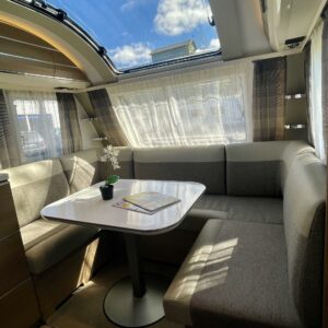Tule avaamaan Adrian ovi ja ihastu! Värimaailma ei sisustassa riitele, vaunu on visuaalisesti todella tyylikäs. Etuosassa on mukavat sohvat ja tilaa helposti neljälle. Keittiö on tyylikäs ja toimiva kokonaisuus. Adrialla yleensä mietitään keittiöiden visuaalista puolta ja tämäkin hivelee silmää. Kaappitilaa on reilusti ja vedettävät alakaapit käytössä ihan ehdottomat. Pitkä jääkaappi palvelee varmasti kaikkia vaunun nälkäisiä asukkeja. Vaunun takaosasta löytyy parisänky sekä WC/suihkutila. Vaunua lämmittää tottakai nestekiertoinen Alde. Iso panoraamaikkuna on kauniiden kesäaamujen ilo.