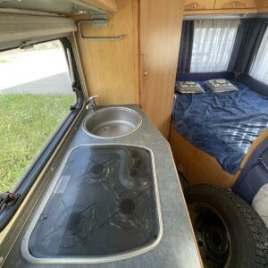 Matka-auto matalalla parivuoteella. Istuimet kuudelle, vuoteet neljälle.