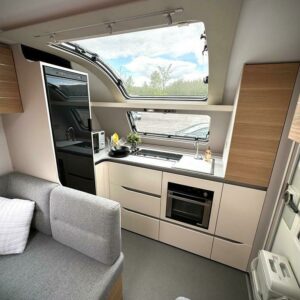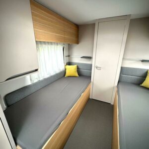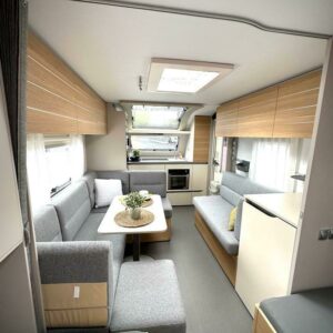 Pohjaratkaisussa edessä keittiö normaalilla keittiövarustuksella ja kaasu-uunilla höystettynä. Keskellä oleskelutilat. Seuraavana pitkittäiset erillisvuoteet. Takana koko vaunun levyinen wc/kylpyhuonetila erillisellä suihkutilalla.