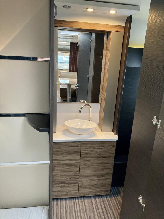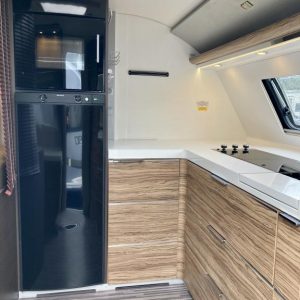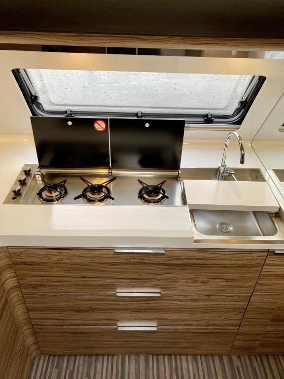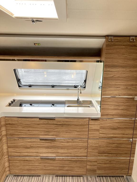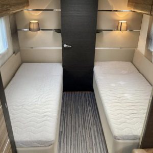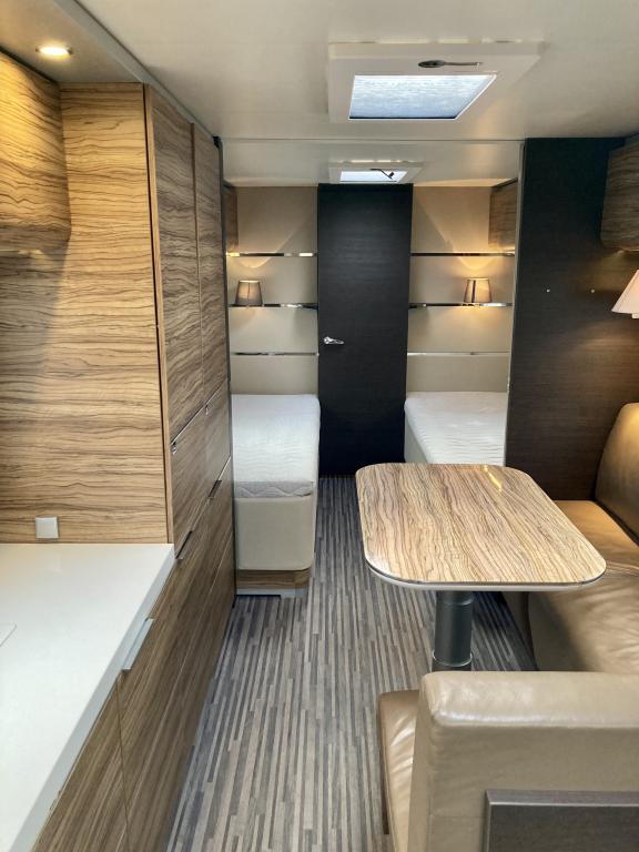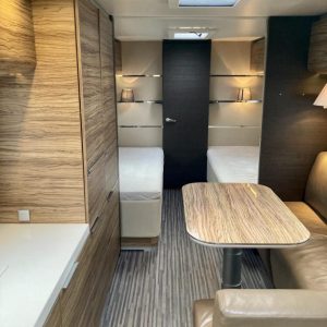 Pohjaratkaisussa edessä suuri ja tilava keittiö, jossa Korkea jääkki ja uuni. Keskiosassa sohvaryhmä, josta voi sijata vuoteen. Takaosassa erillisvuoteet sekä hyvin tilava Wc -& suihkutila.