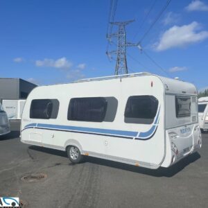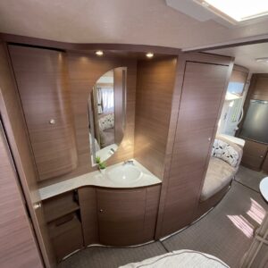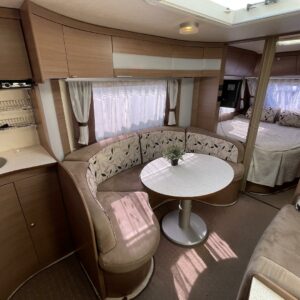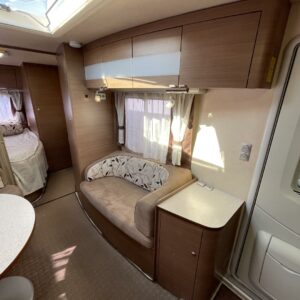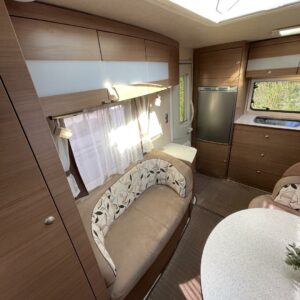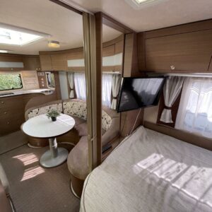 Siisti parivuoteinen vaunu avaralla keittiöllä ja Alde- nestekiertolämmityksellä.