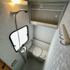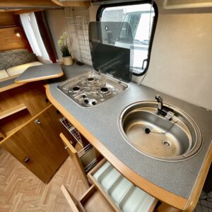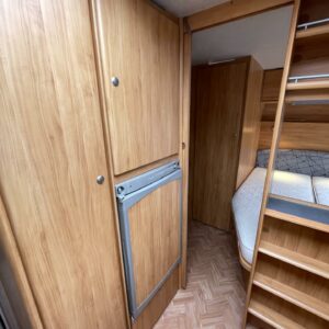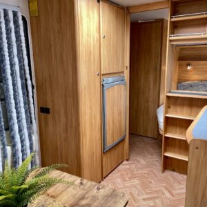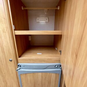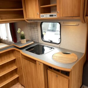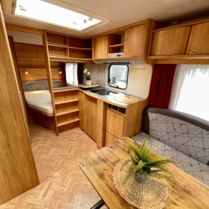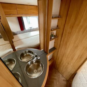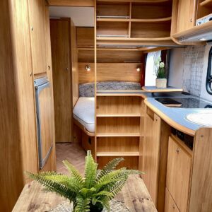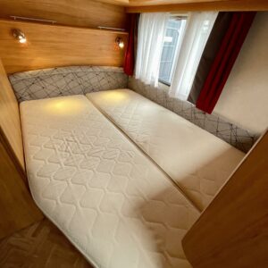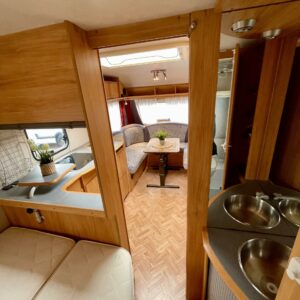 Tämän kodin pohjaratkaisu on suunniteltu sujuvaa ja nautinnollista arkea varten. Takaosan kutsuva parivuode takaa levolliset unet pitkän ajopäivän jälkeen, ja etuosan viihtyisä istuinryhmä muuntautuu vaivatta lisävuoteeksi tilapäiskäyttöön. Asuintilaan on saatu huomattavasti lisää avaruutta ja kulkemisen helppoutta, sillä edellinen omistaja on vaihtanut alkuperäisen pöydän tilalle hieman siromman version. Säilytystiloista ei tässä mallissa tarvitse tinkiä, sillä valtava määrä kaappitilaa ja sängyn alta löytyvä suuri varastotila nielaisevat sisäänsä helposti vaikka koko puutarhakalusteryhmän.