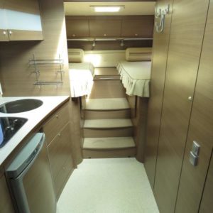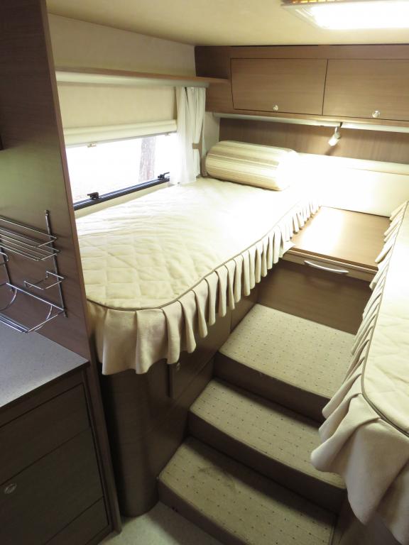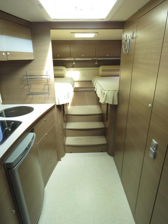Takana helppokulkuiset erillisvuoteet, joiden alla iso takatalli. Keskellä keittiö ison kattoikkunan alla sekä toisella puolella WC. Edessä tilava ja valoisa U-ryhmä.