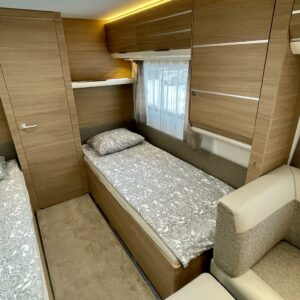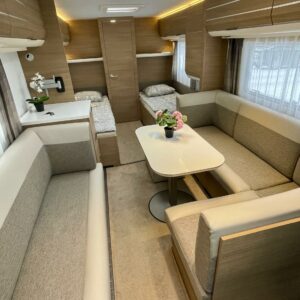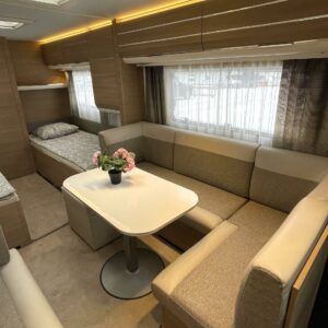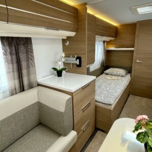 Haluttu ja kehuttu HT-sarjan Adria todella upeakuntoisena yksilönä ensimmäiseltä pilkuntarkalta omistajalta! Vaunun sydänhän on HT-sarjasta tuttu etukeittiö, mistä löytyy iso jääkaappi ihanteellisella käyttökorkeudella, sekä kaasu-uuni. Keittiöstä löytyy myös todella hyvin laskutilaa tavaroille. Mainittakoon vielä heti käyntioven vieressä oleva vaatekaappi minne on helppo laittaa ulkovaatteet heti vaunuun sisään tultaessa. Keittiön päällä on iso panoramaikkuna mistä tulee mukavasti luonnonvaloa sisätiloihin. Keskivaiheilta löytyy L-sohva ja vaunun toiselta puolelta löytyy vielä sivusohva mikä yhdistyy tähän oleskelu/ruokailuryhmään. Extrana vielä erillinen siirreltävä jalkarahi. Tästä istuinryhmästä saadaan tarvittaessa sijattua 120 x 200cm kokoinen vuode Makuuhuoneessa on pitkittäiset erillisvuoteet ja tämän tilan saa erotettua omaksi osastokseen paljeoven avulla. Vuoteiden alle jää säilytystilaa ja toisen vuoteen alle on käynti myös ulkopuolelta. Vaunun takaosassa on koko vaunun levyinen ”spa”osasto, eli WC/kylpyhuonetilat erillisellä suihkutilalla. Vaunun vasemmasta etukulmasta löytyy vielä ulkopuolelta käytettävä erillinen säilytystila. Lämmitysjärjestelmänä on Alden tehokas ja tasaisen lämmön tuottava nestekiertolämmitys. Samasta ”pannusta” saadaan myös lämmin käyttövesi ja luonnollisesti myös sähkövastukset (sähköpatruuna) tästä löytyy. Ja mukavuusvarusteena tietysti sähköinen lattianlämmitys. Ihan huippuhieno vaunu valmiina seuraavalle käyttäjälle juuri tarkastettuna ja katsastettuna.