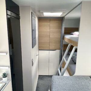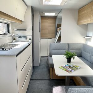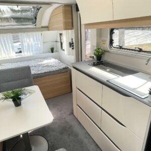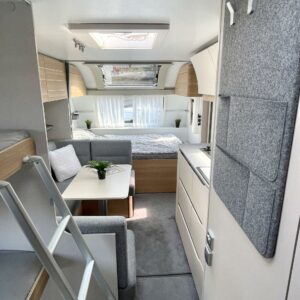 Ajattomilla vaaleilla väreillä sisustettu vaunu, missä suuri kattoikkuna edessä tuoden valoa ja lisätilan tuntua. Vaunun etuosassa on parivuode poikittain, keskellä suuri istuinryhmä sekä keittiö, missä korkea jääkaappi. Takaosassa on varsin tilava WC/suihkuhuone, sekä kerrosssängyt kahdelle.Tasaisen lämmityksen takaa nestekiertoinen Alde-keskuslämmitys. Vaunussa on myös valmiiksi asennettu rullamarkiisi.