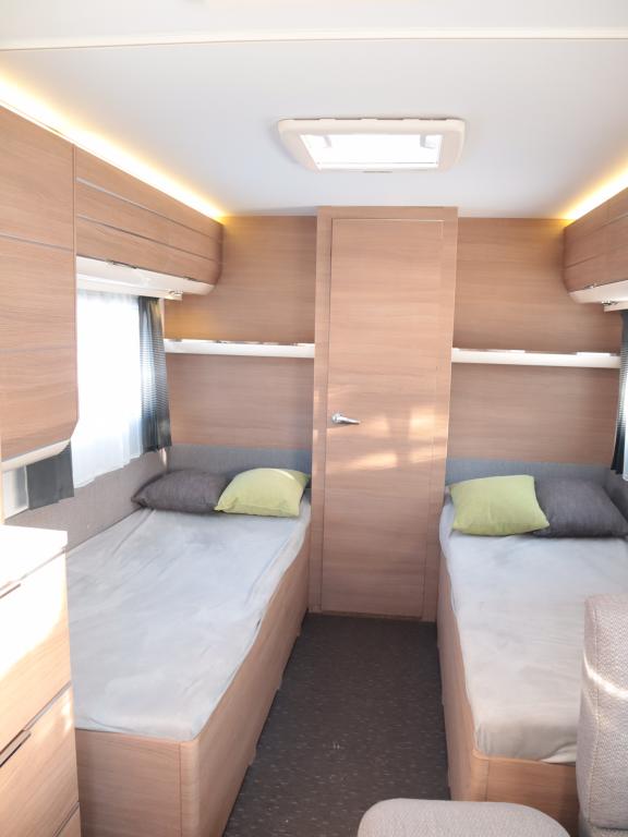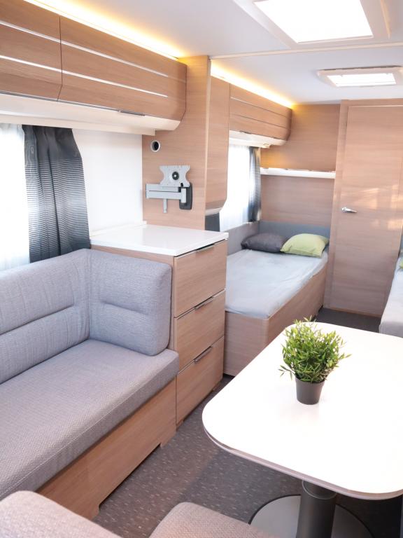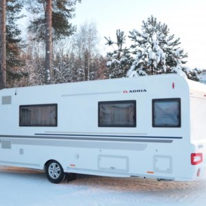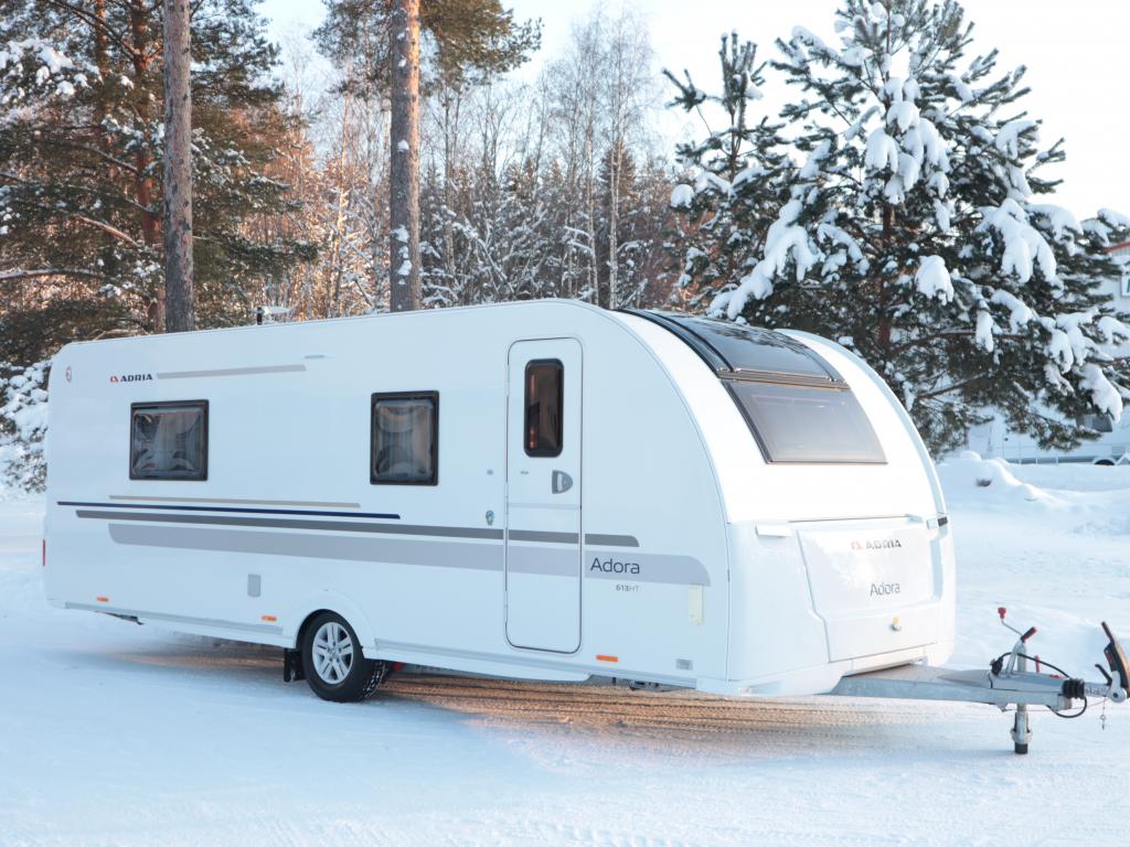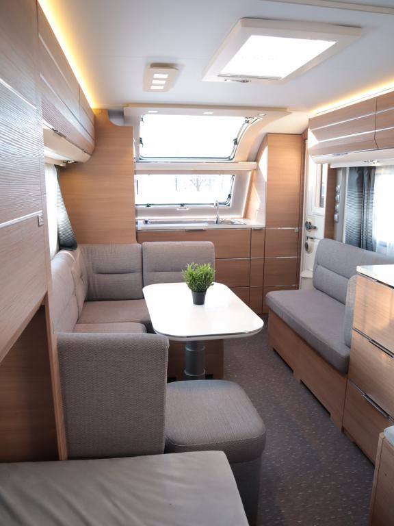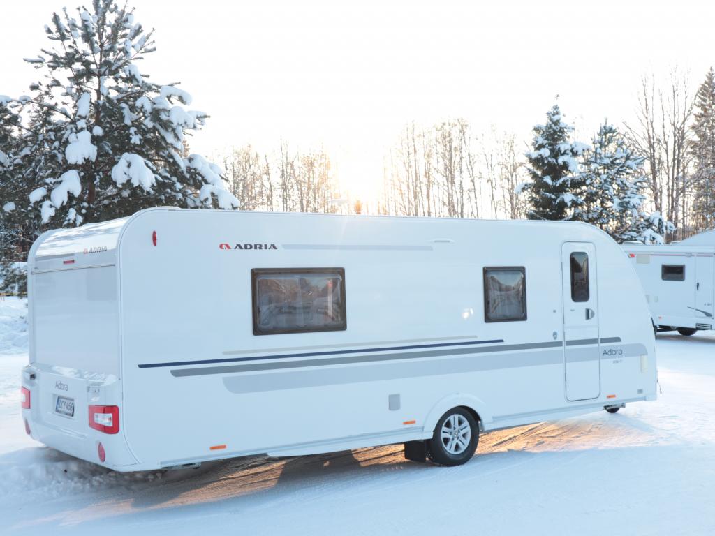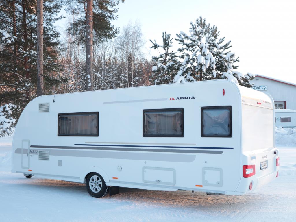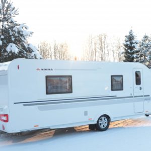 Tyylikäs Adria avaralla pohjaratkaisulla. Vaunun etupäässä keittiö jossa reilusti laskutilaa, keskellä suuri istuinryhmä ja sen perässä erilliset vuoteet. Takana kylpyhuone erillisellä suihkukaapilla.