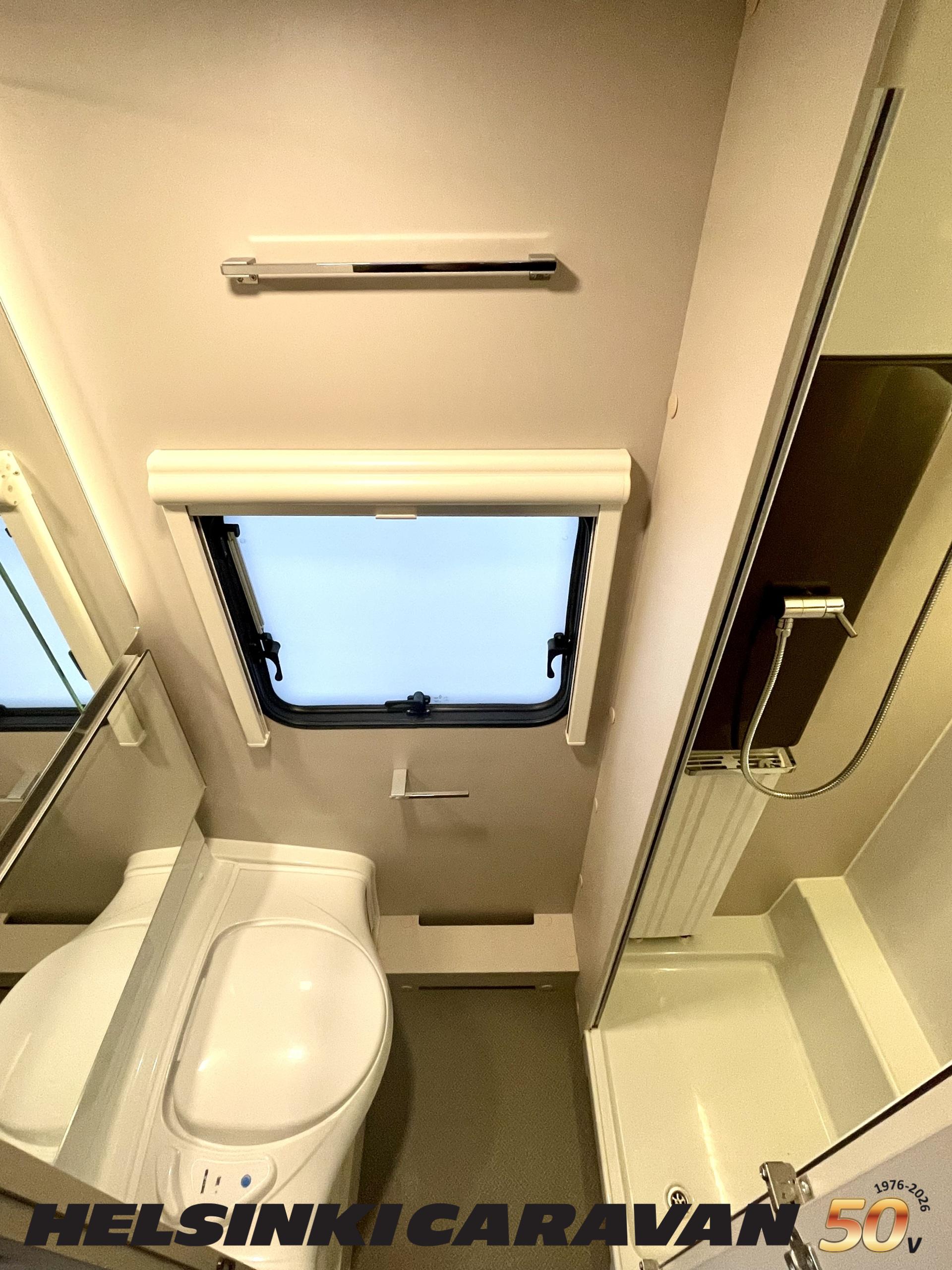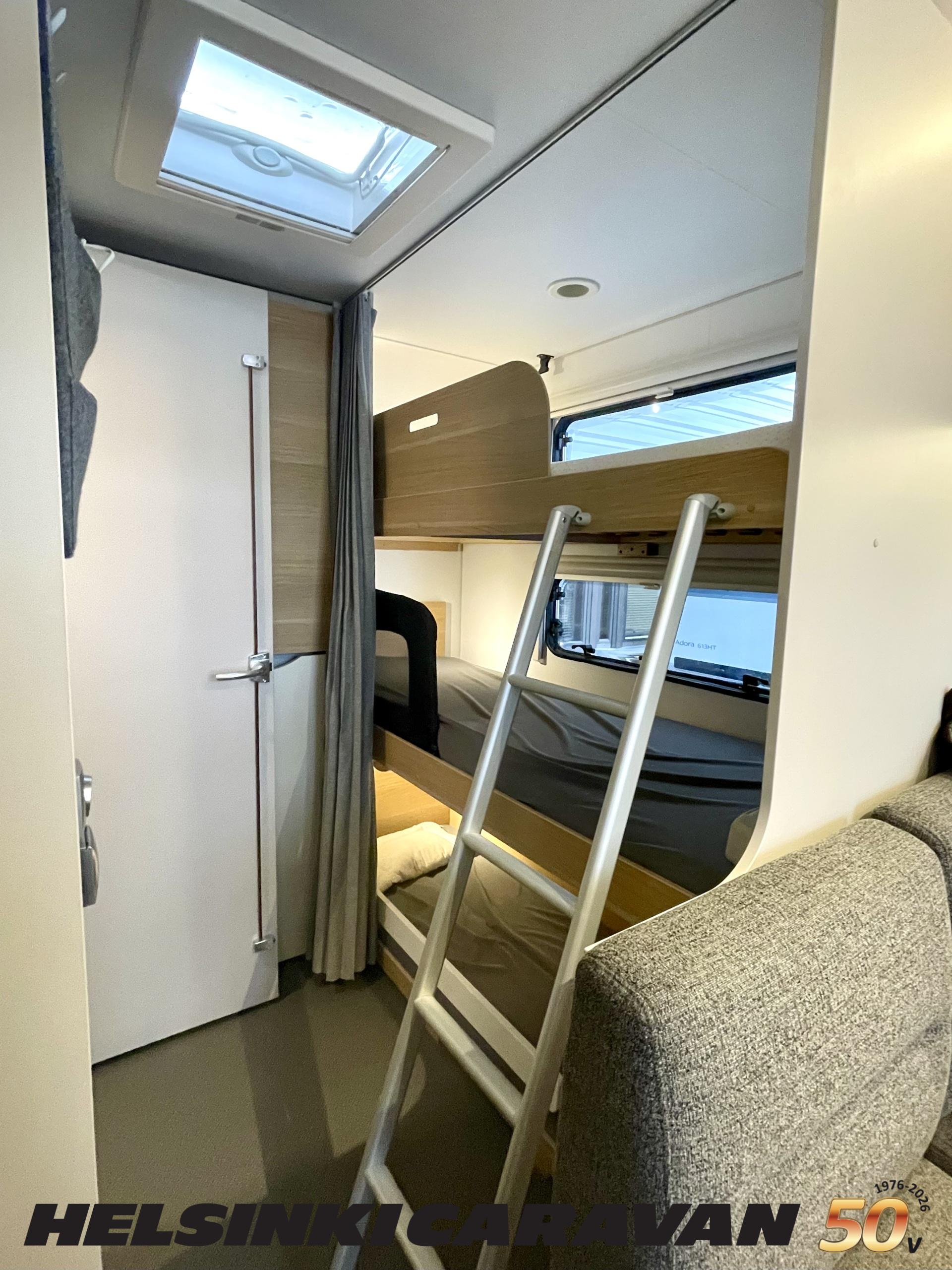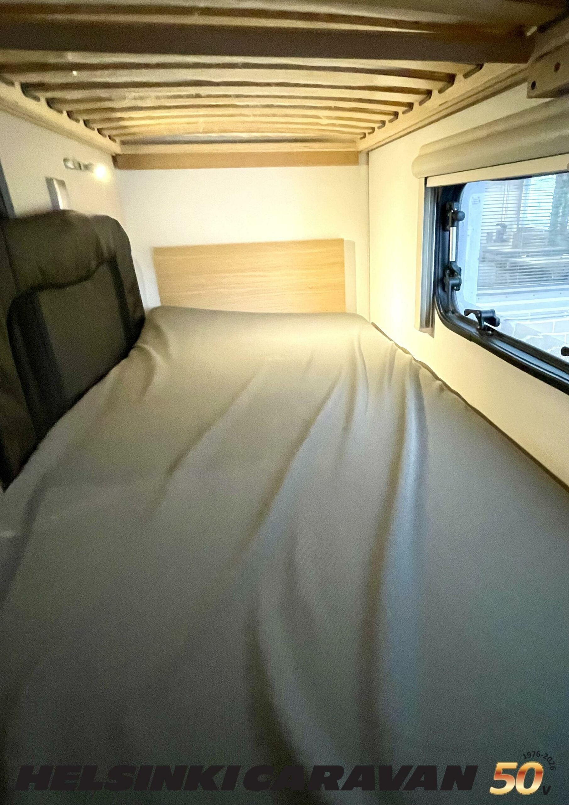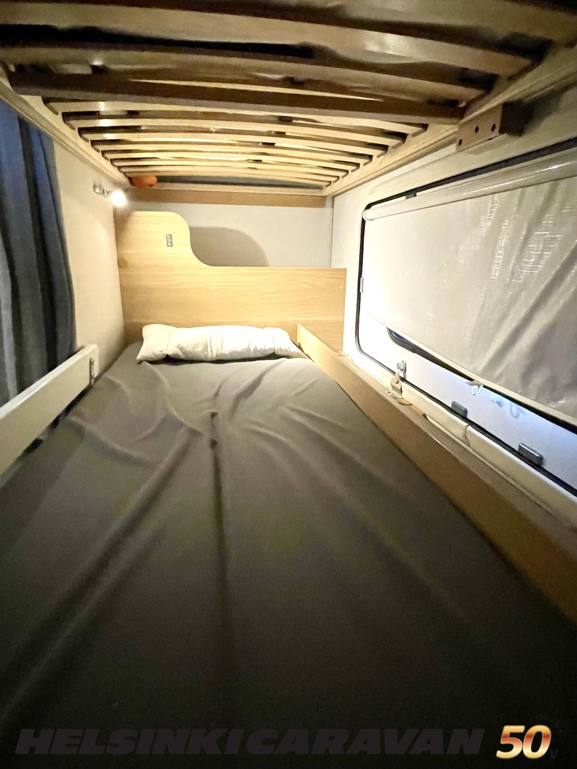Takaosassa on omalla kattoikkunalla varustettu tilava erillinen wc/kylpyhuone. Toisella seinustalla on kolme kerrossänkyä perheen pienemmille, sänkyosasto on täälläkin omalla väliverhollaan osastoitu. Jokaiselle nukkujalle löytyy myös oma pimennys- ja hyönteisverholla varustettu ikkuna, sekä oma yö/lukulamppunsa.