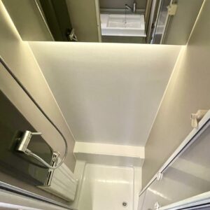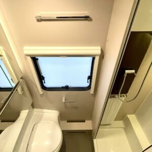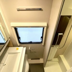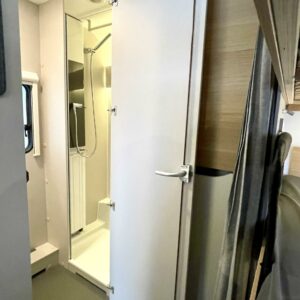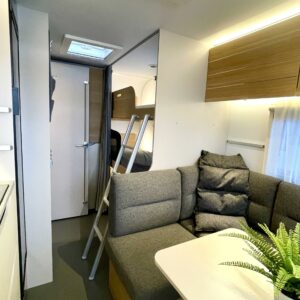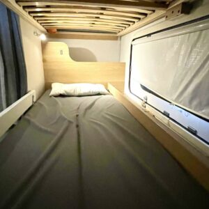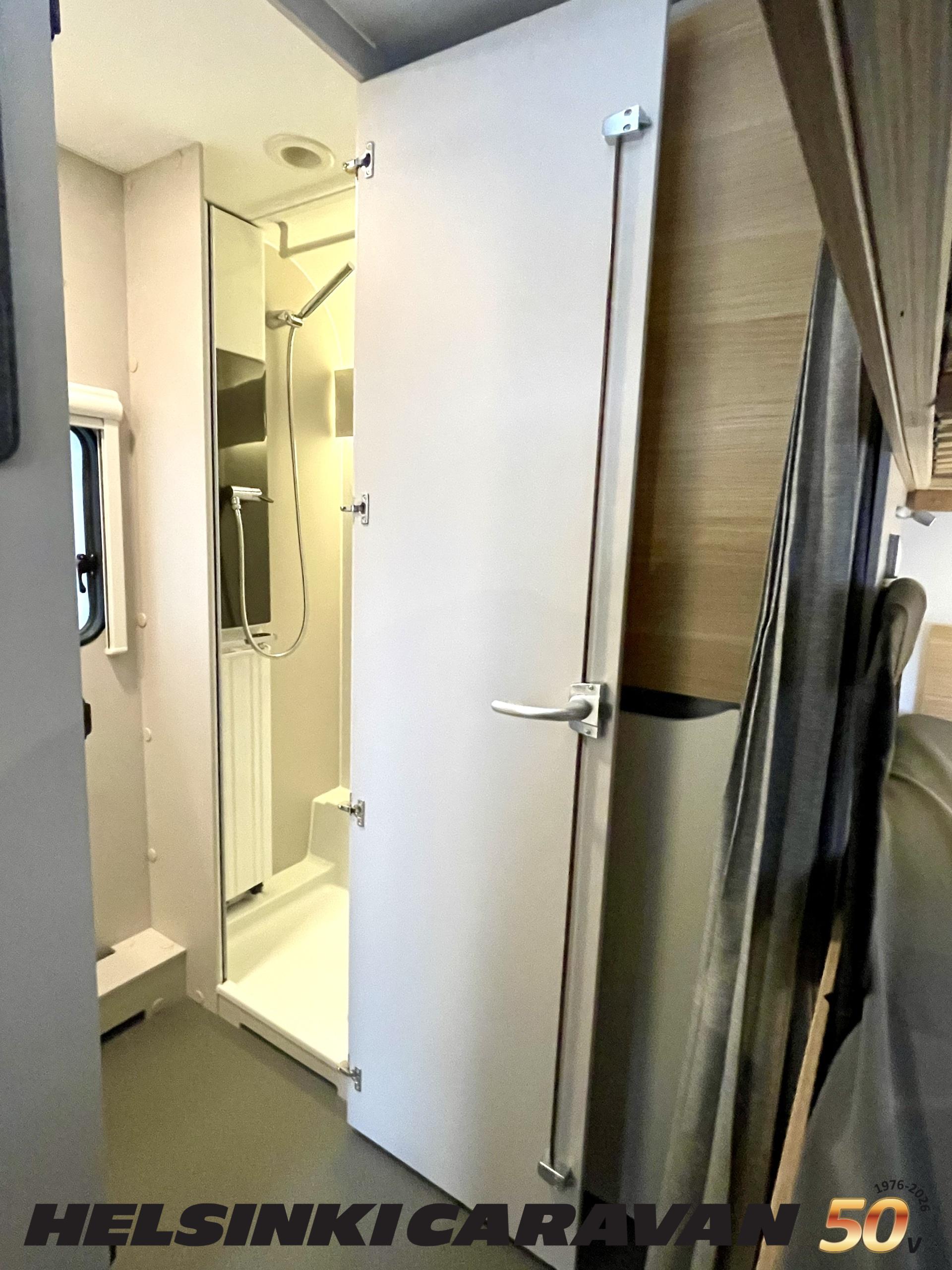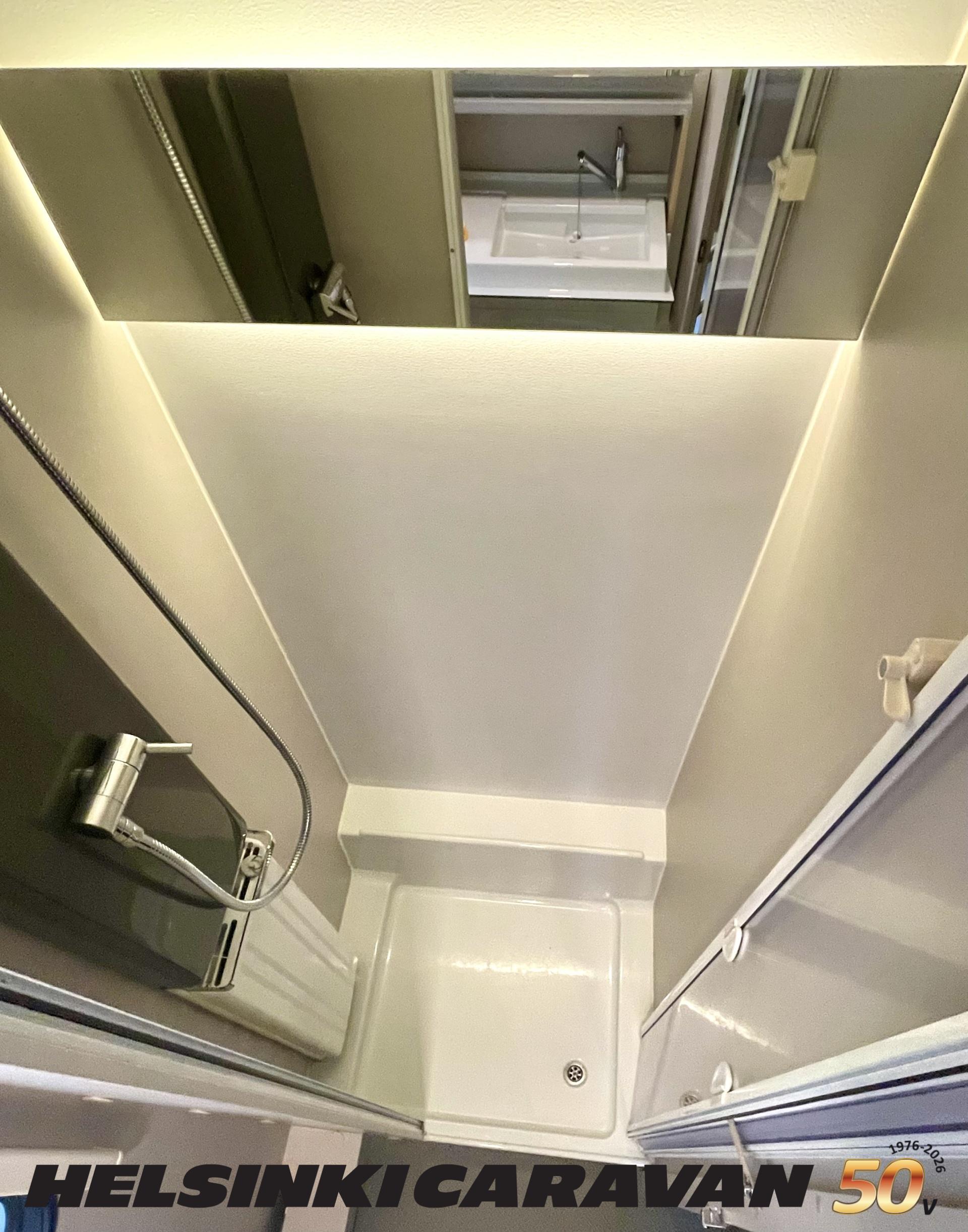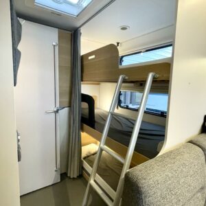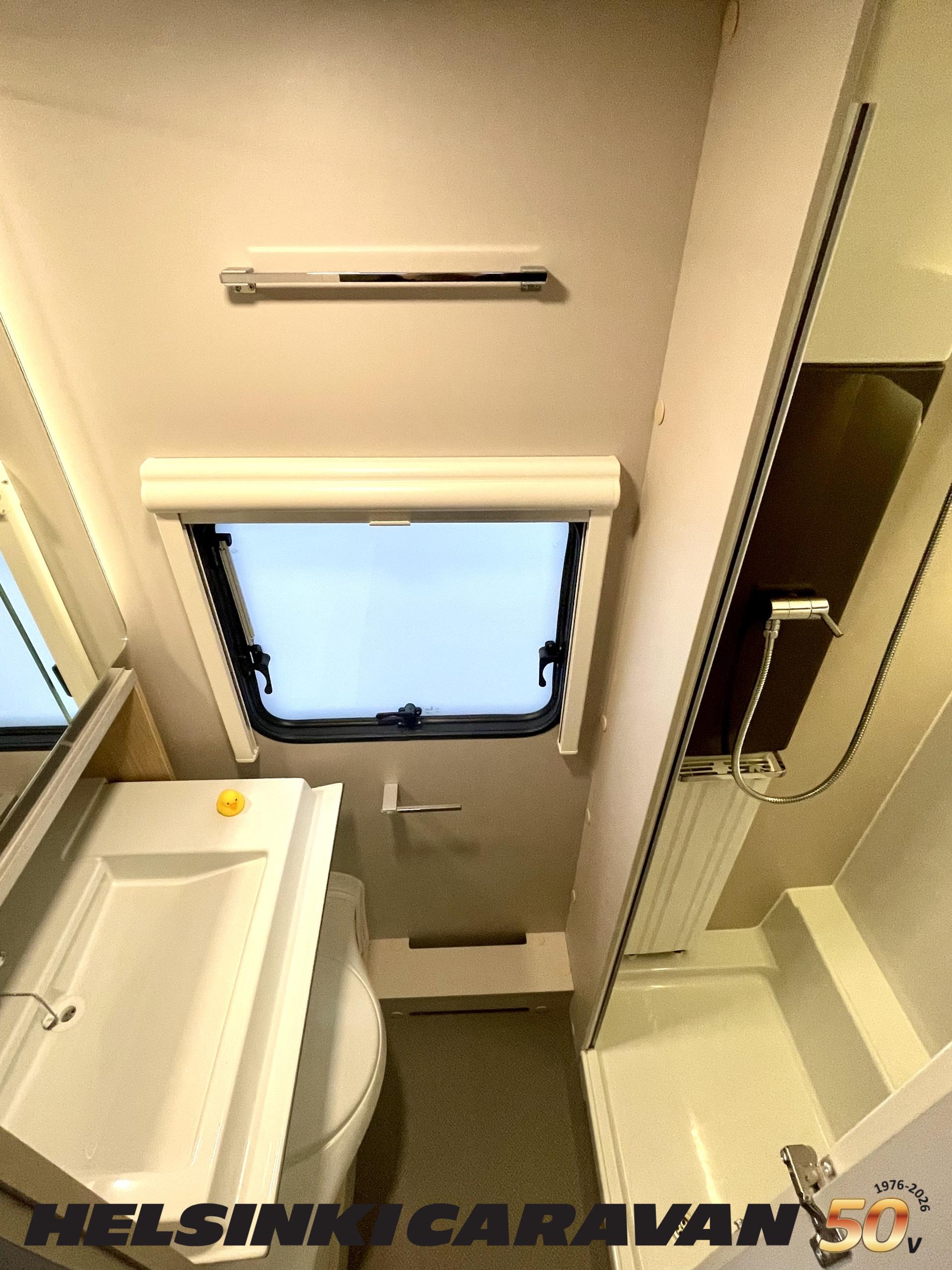 Takaosassa on omalla kattoikkunalla varustettu tilava erillinen wc/kylpyhuone. Toisella seinustalla on kolme kerrossänkyä perheen pienemmille, sänkyosasto on täälläkin omalla väliverhollaan osastoitu. Jokaiselle nukkujalle löytyy myös oma pimennys- ja hyönteisverholla varustettu ikkuna, sekä oma yö/lukulamppunsa.