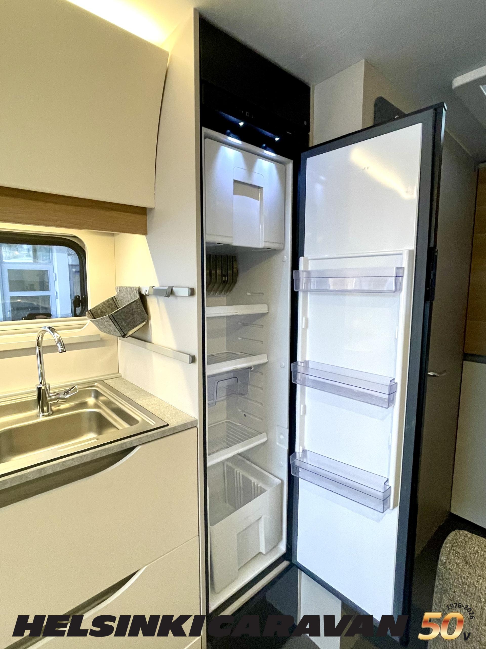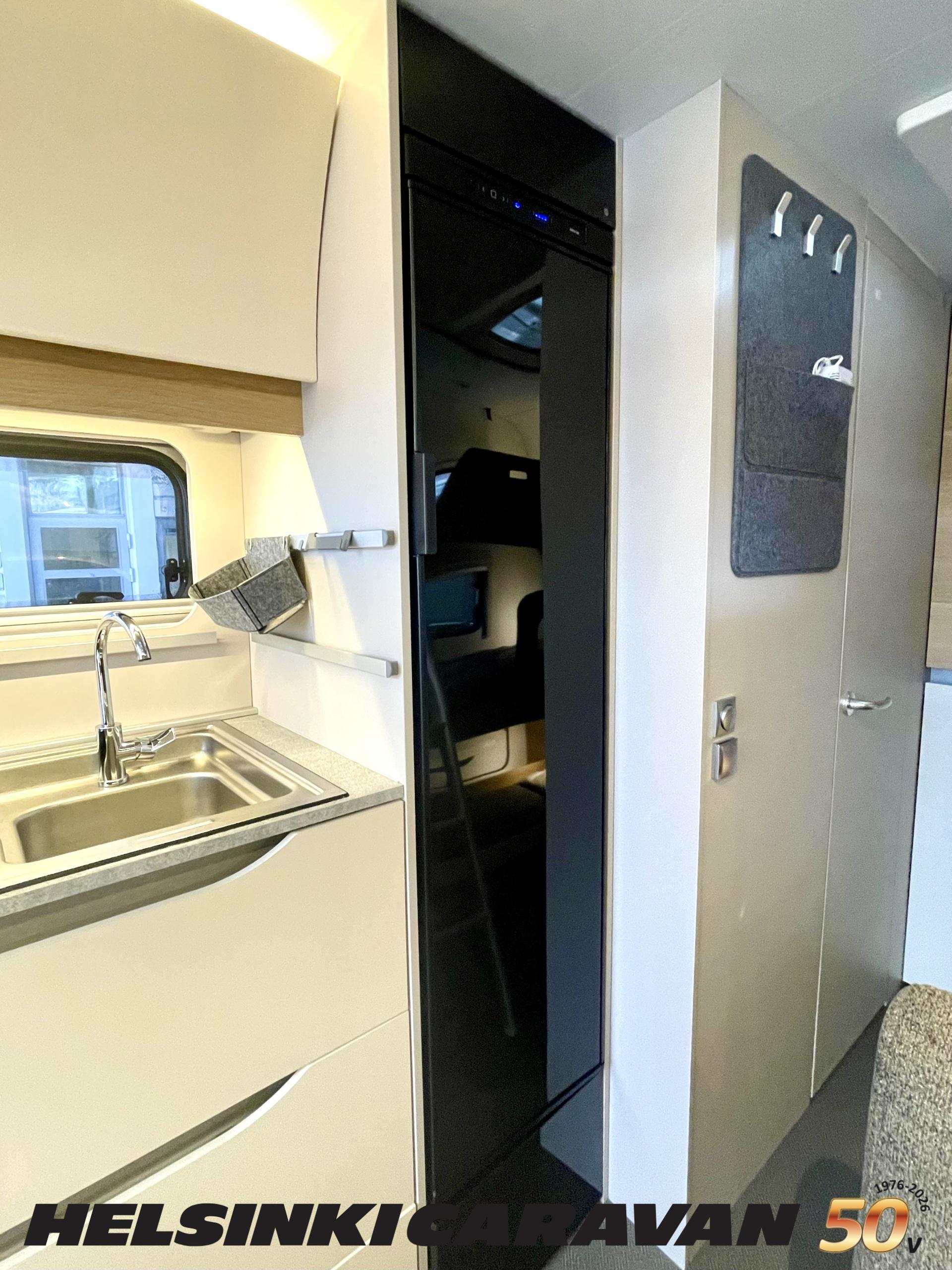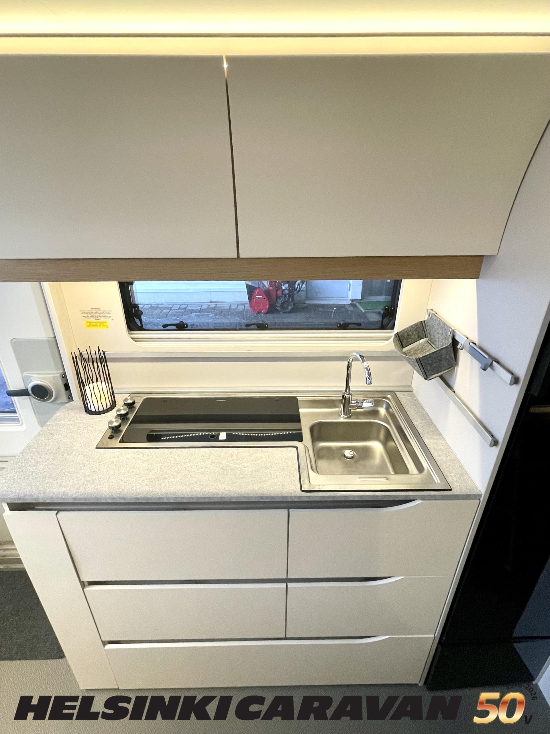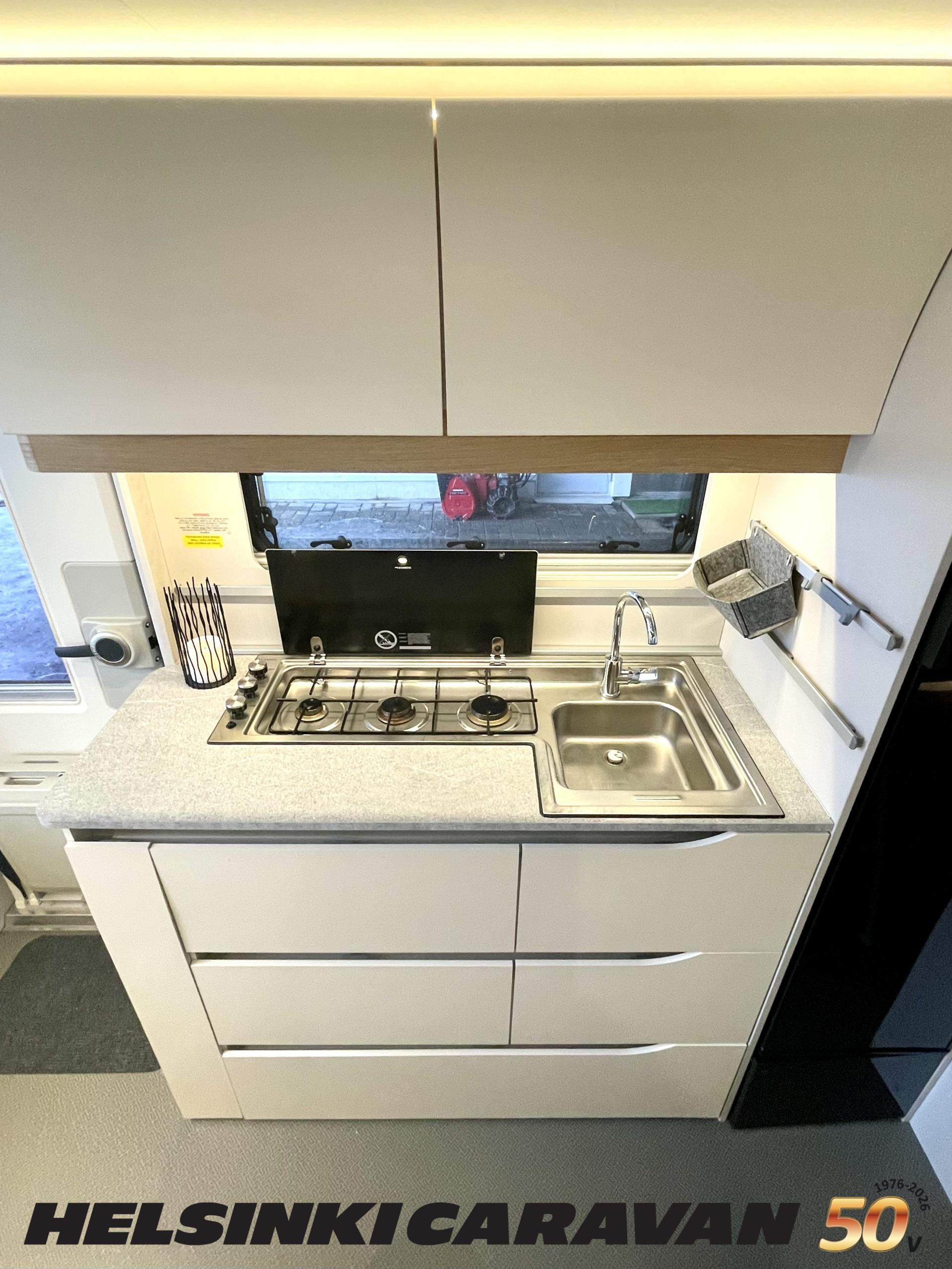 Vaunun keskiosan ruokailuryhmän ääreen mahtuu kerralla koko perhe kannustamaan kokkausvuorolaista uusiin urotekoihin. Ja mikäs siinä kokatessa kun kolmipolttimisella kaasuliedellä kypsyy useampikin pannullinen kerrallaan, liesituuletin kuuluu vakiovarustukseen ja kaappi- sekä laatikostotilaa löytyy yllin kyllin. Lisävarusteena löytyvä mikroaaltouuni hoitaa popcornit sadepäivän leffailtaa varten.