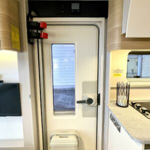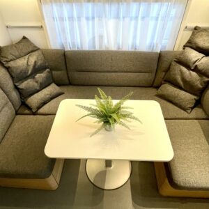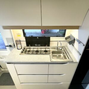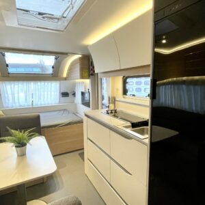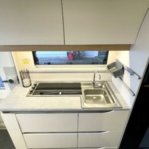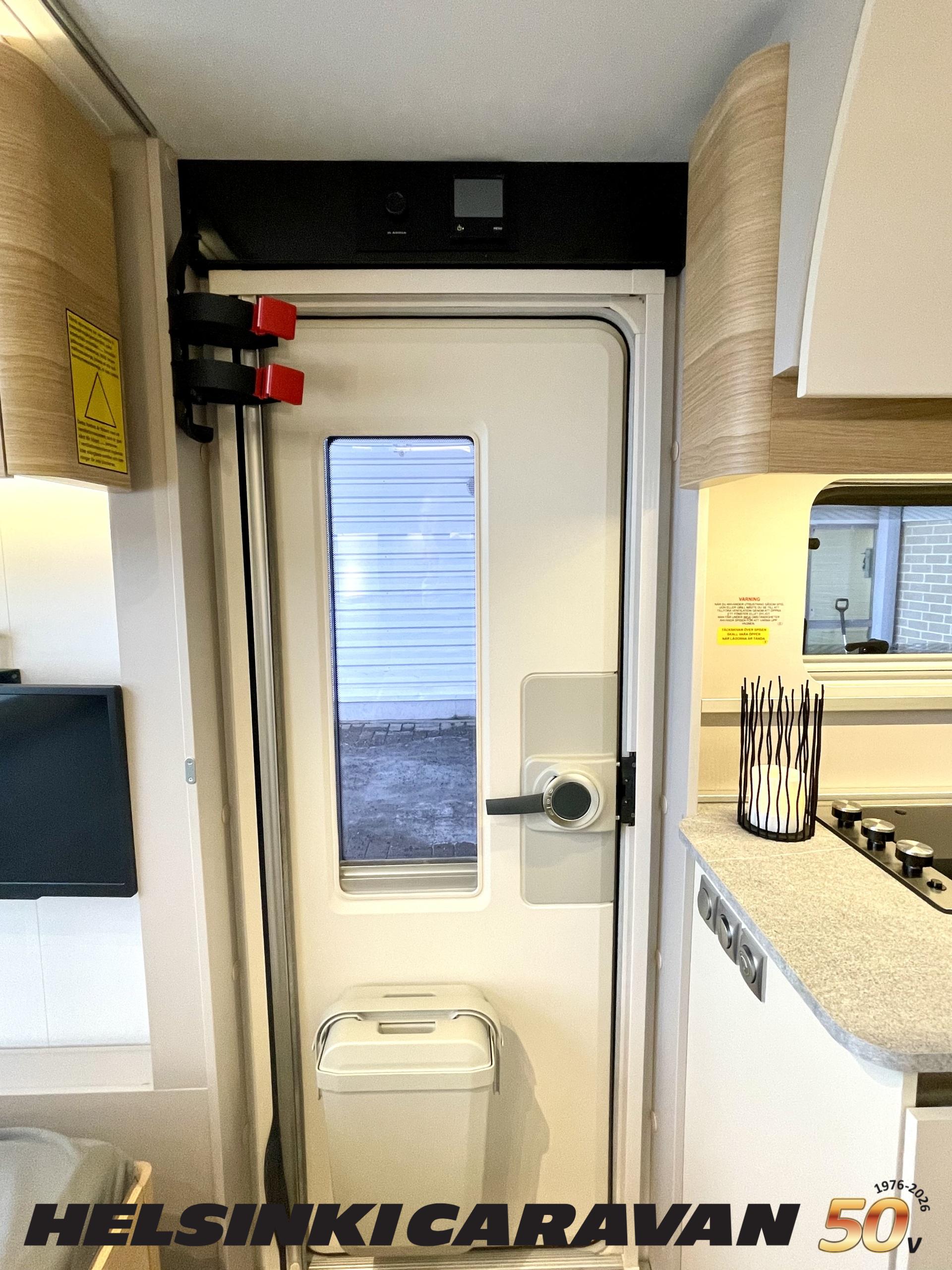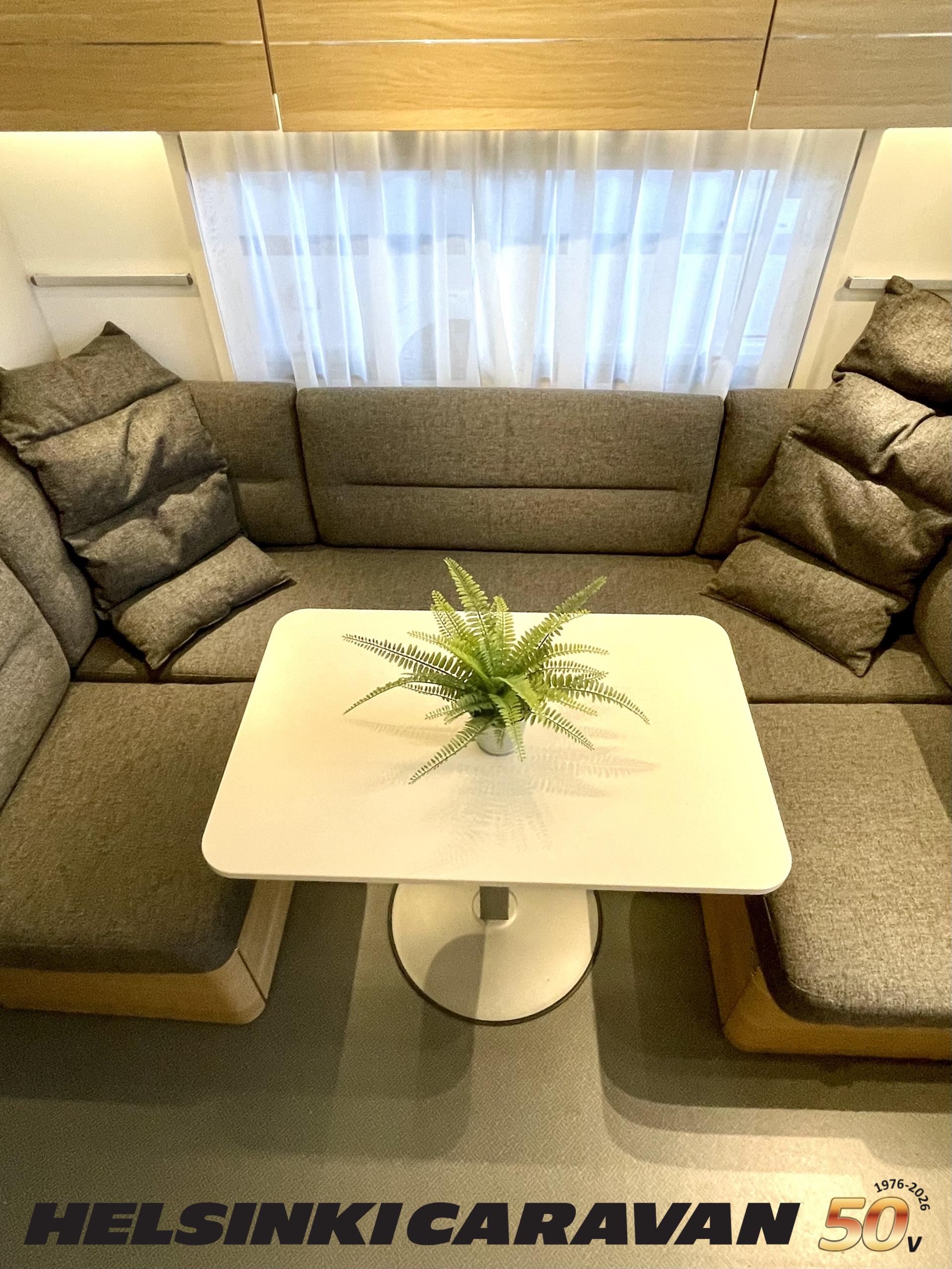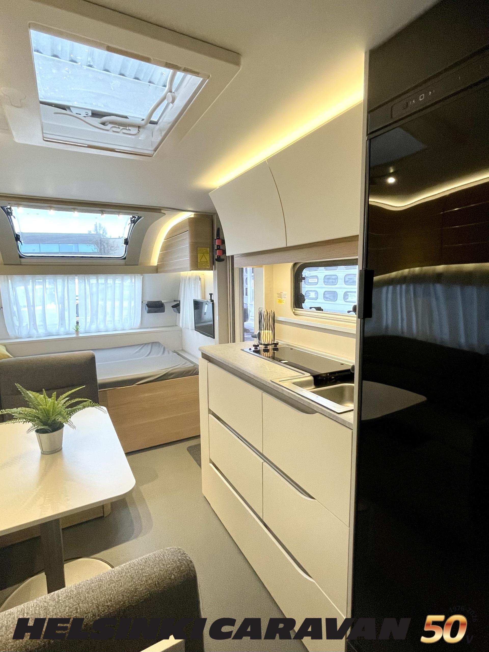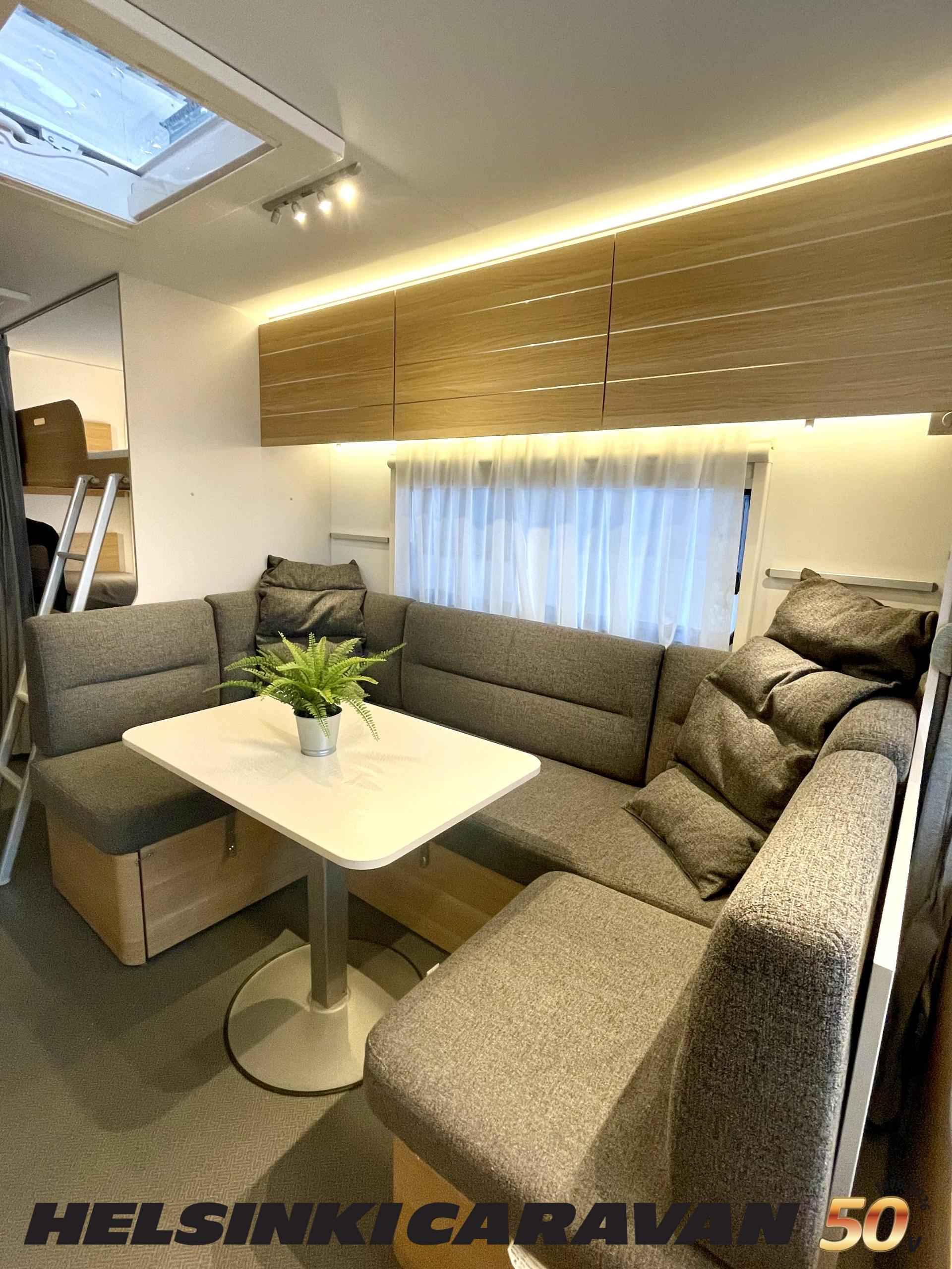 Vaunun keskiosan ruokailuryhmän ääreen mahtuu kerralla koko perhe kannustamaan kokkausvuorolaista uusiin urotekoihin. Ja mikäs siinä kokatessa kun kolmipolttimisella kaasuliedellä kypsyy useampikin pannullinen kerrallaan, liesituuletin kuuluu vakiovarustukseen ja kaappi- sekä laatikostotilaa löytyy yllin kyllin. Lisävarusteena löytyvä mikroaaltouuni hoitaa popcornit sadepäivän leffailtaa varten.