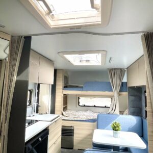 Wou mikä Adria! Tässäpä tyyllikäs tilaihme. Vaunun molemmissa päissä löytyy sängyt ja lisäksi pöytäryhmä muuntautuu lisäsängyksi. Nukkumatilaa on siis 5-6 henkilölle. Ruokailuryhmäkin on tämän kokoiseen vaunuun aidosti tilava. Sama porukkaa mahtuu syömään sen ympärille. Adria loistaa jälleen myös tyylikyydellä, niin koko vaunun osalta, kuin keittiössäkin. Kaappitilan tarve on otettu huomioon pienessä vaunussa mukavasti.Kaksi kattoikkunaa tekee vaunusta vielä mukavan valoisan. Eikä veturinkaan tarvitse olla isoimmasta päästä, 1300 kilon kokonaispaino tulee kivasti auton kuin auton perässä.