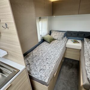 Peräpäässä on erillisvuoteet, jotka on mahdollista yhdistää koko vaunun levyiseksi megasängyksi. Kivana varusteena molempien vuoteiden alle pääsee ulkoluukkujen kautta, joka tekee vaunun pakkaamisesta helmpompaa.
