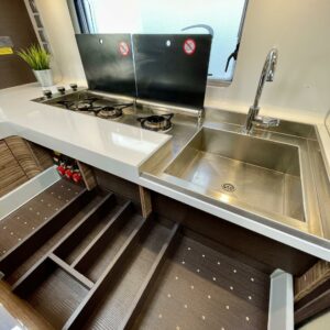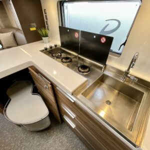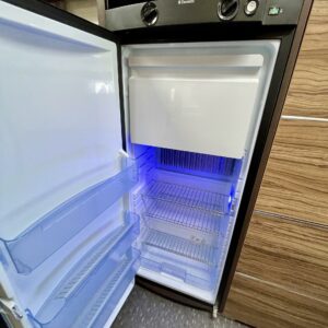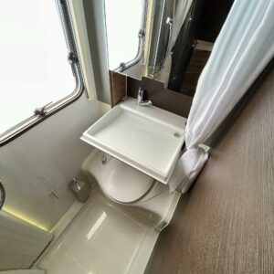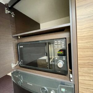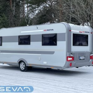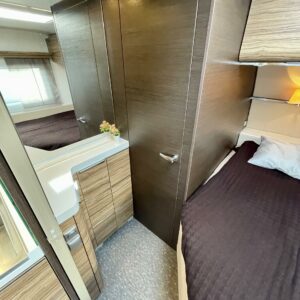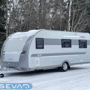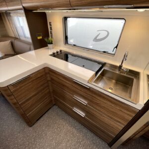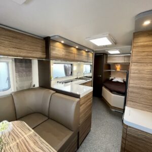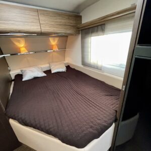 Keittiö on todellinen kotikokin unelma, jossa yhdistyvät tyylikkyys ja poikkeuksellinen toimivuus. Varusteluun kuuluu tilava jääkaappi sekä mikroaaltouuni, ja kerrankin tarjolla on kunnolla laskutilaa vaativampaankin kokkailuun. Arjen sujuvuutta lisää entisestään kulmaan sijoitettu käytännöllinen karusellikaappi, joka pitää kattilat ja keittiövälineet helposti saatavilla. Vaunun etuosaan sijoitettu leveä parisänky täydentää kokonaisuuden ja takaa ensiluokkaiset unet.