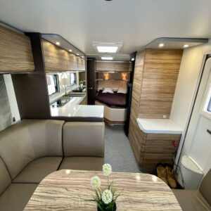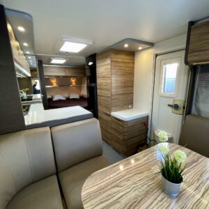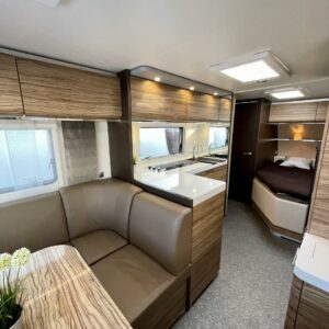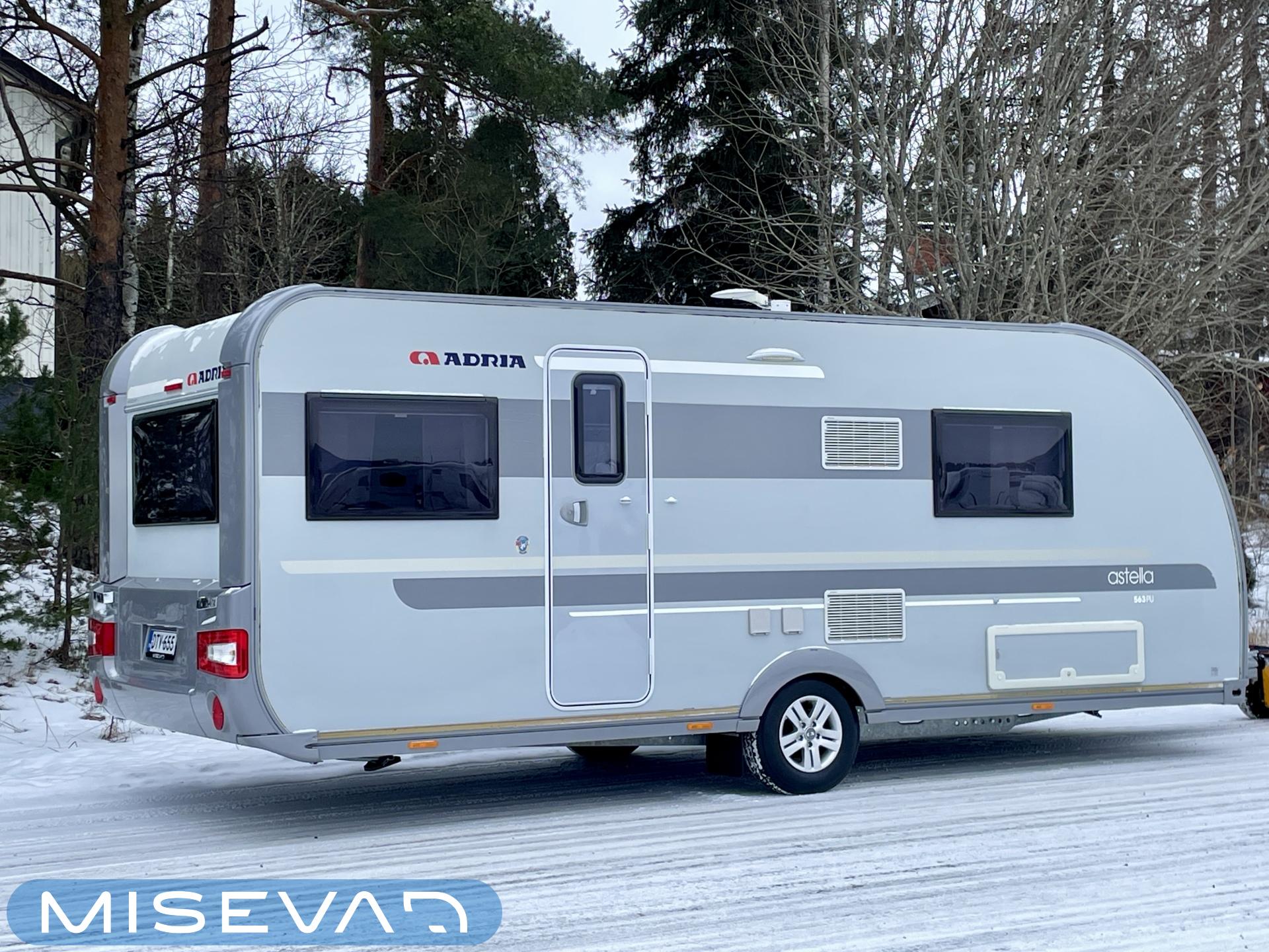 Nyt myynnissä poikkeuksellisen edustava Adria Astella Glam 563 PU. Tässä vaunussa voit kokea, kuinka matkailusta tulee todellista arjen luksusta. Heti sisään astuessasi vastassa on tyylikäs, konjakinvärisellä nahalla verhoiltu G-istuinryhmä, joka luo tilaan arvokkaan tunnelman.