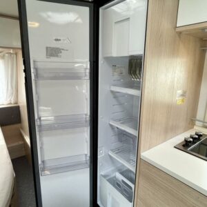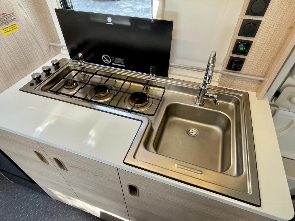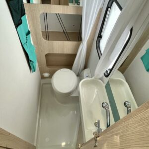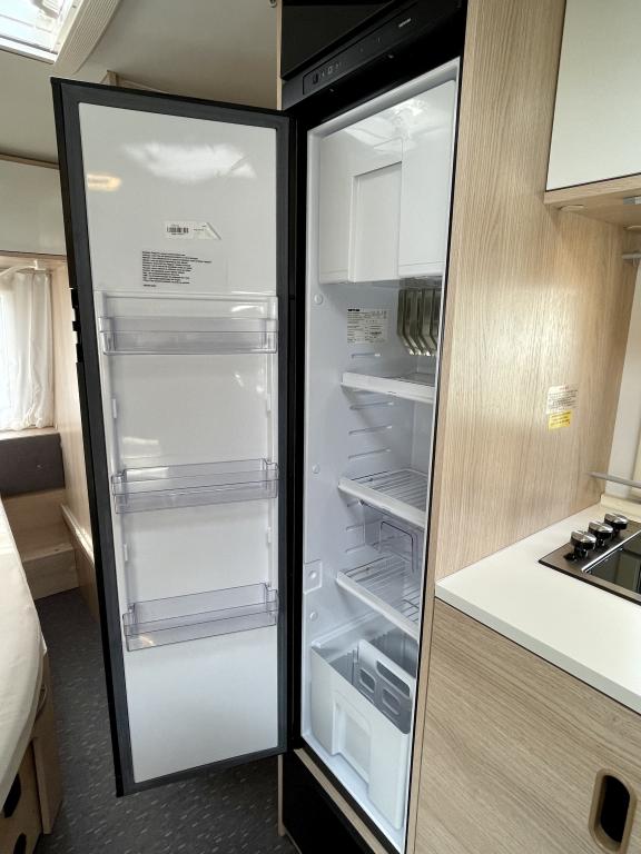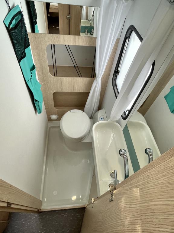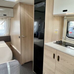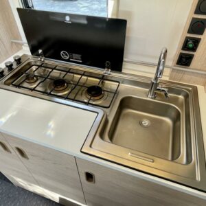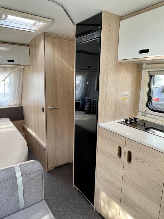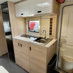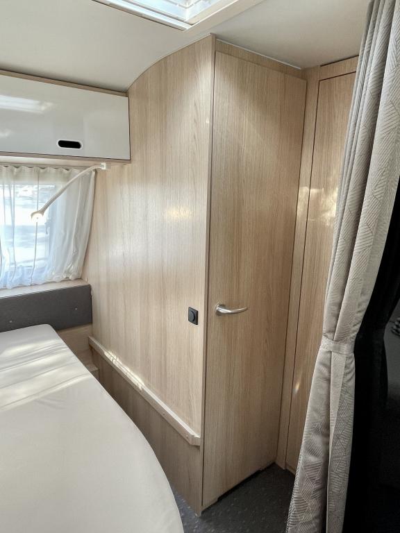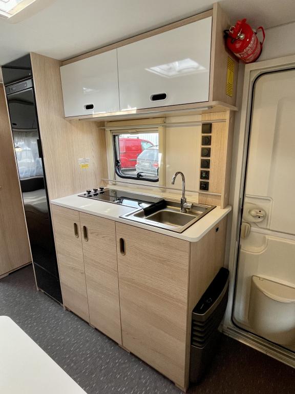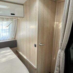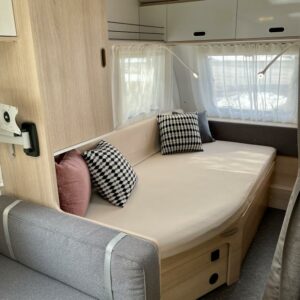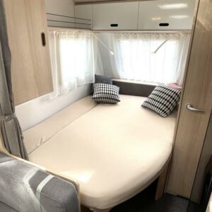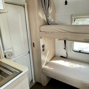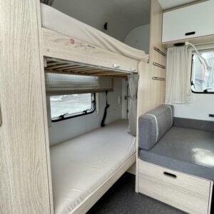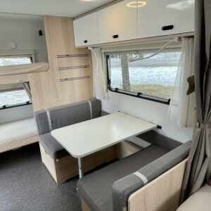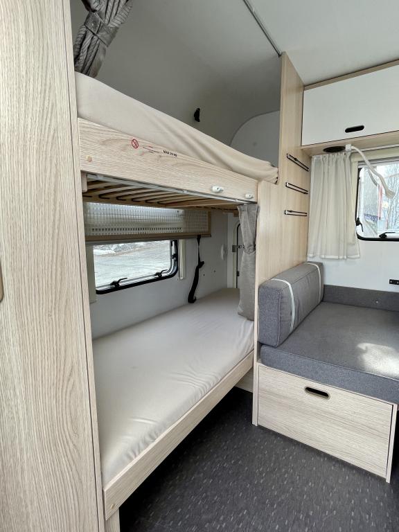 Vaunun etuosassa pitkittäinen parivuode/ sohva ja pesuhuone/WC, takana kerrossängyt ja pöytäryhmä joka sijattavissa toiseksi parivuoteeksi. Keittiön varustukseen kuuluu korkean jääkaappi- pakastimen lisäksi mikroaaltouuni.