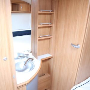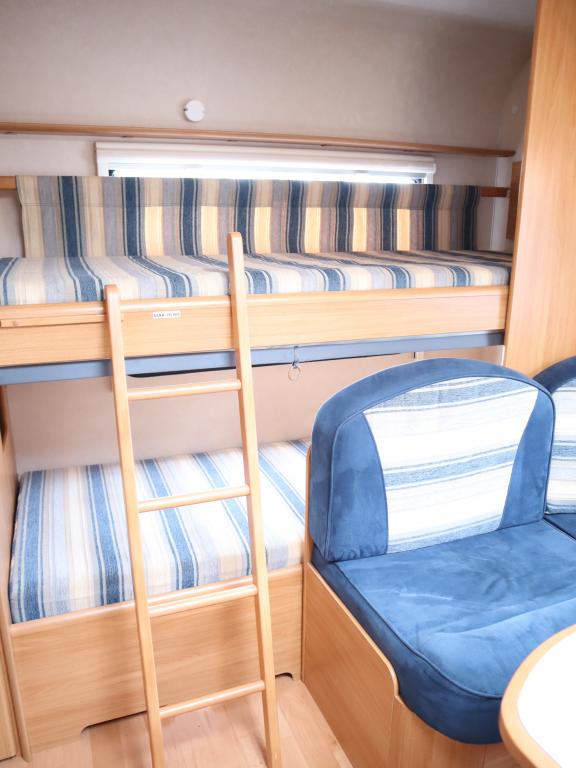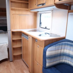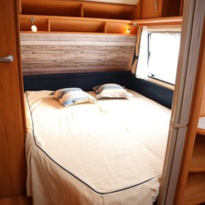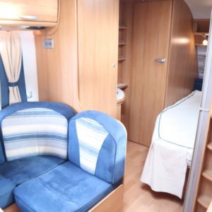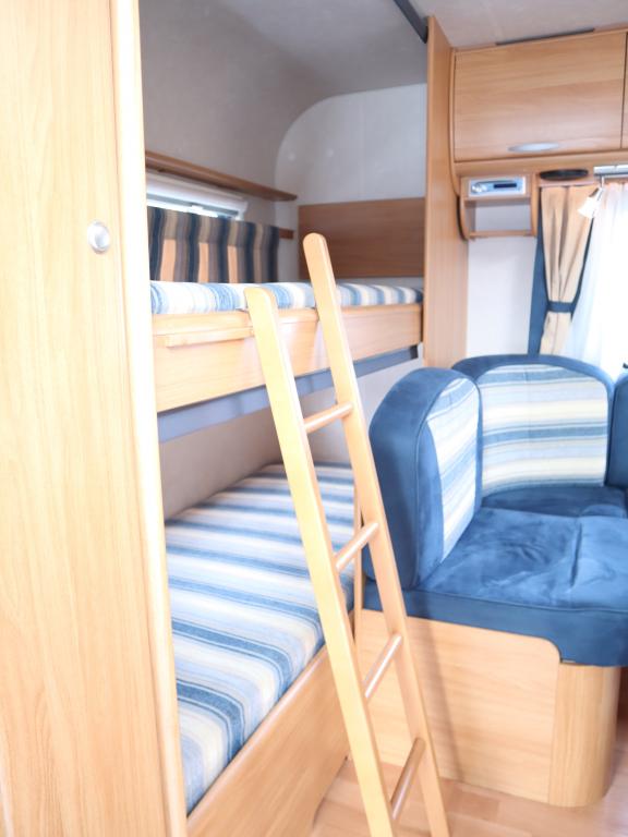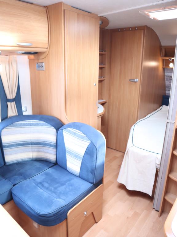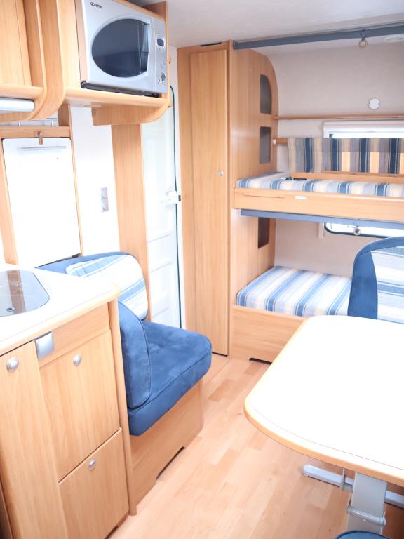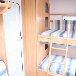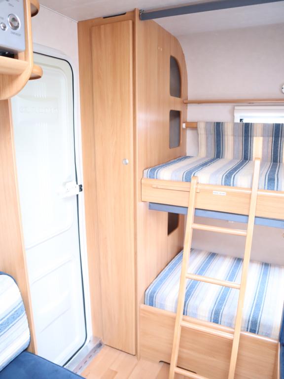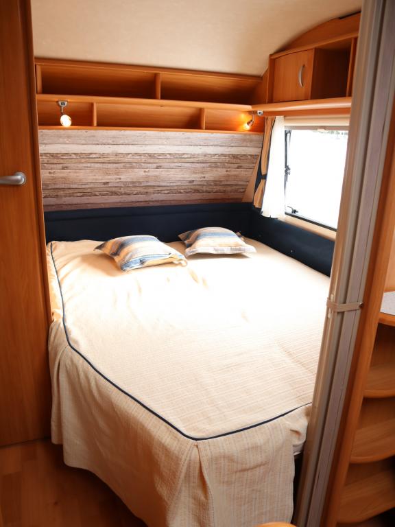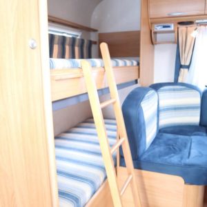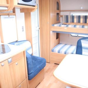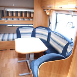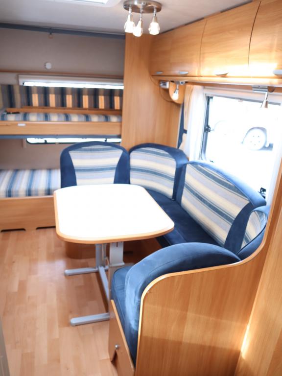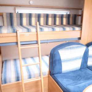 Vaunun takaosassa kerrosvuoteet, etuosassa parivuode ja WC/ pesuhuone. Vaunun keskeltä löytyy mukava U- pöytäryhmä joka sijattavissa varavuoteeksi.