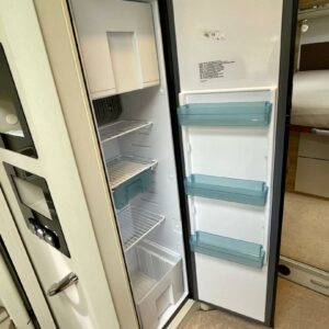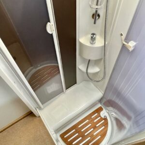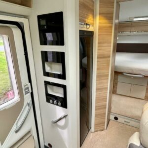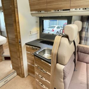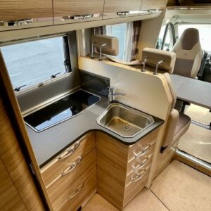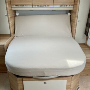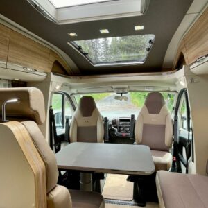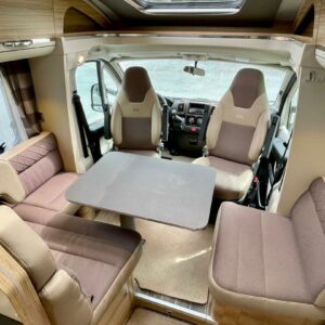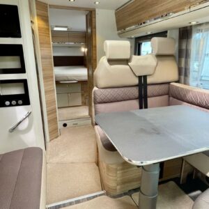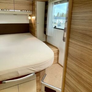 Auton takaosassa muhkea saarekevuode ja erilliset suihku- ja WC- tilat. Auton etuosasta löytyy hulppea ja erittäin valoisa pöytäryhmä jonka ympärille mahtuu isompikin porukka iltaa istumaan. Keittiön varustuksen kruunaa iso jääkaappi-pakastin.