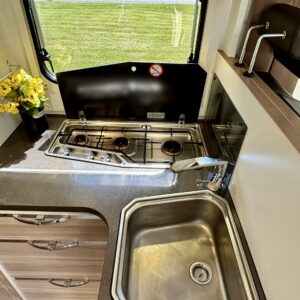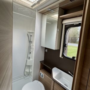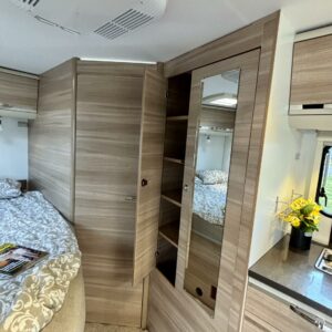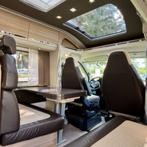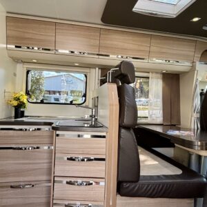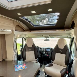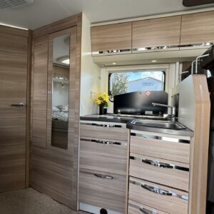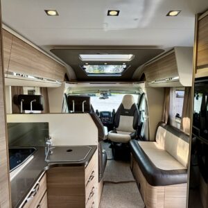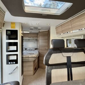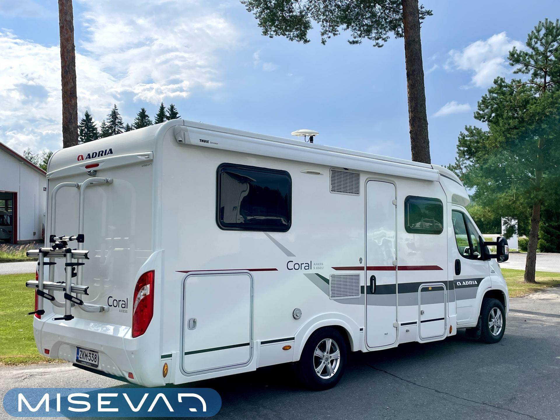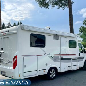 Kyllä silmä lepää Coralin sisustassa. Kaikki on niin harmoniassa keskenään. Auton takaa löytyy mukavan pehmeä parisänky. Jonka alta pääsee suoraan käsiksi takatalliin. Wc ja suihku sijaitsevat myös takana ja suihkuun mahtuu isompikin jässikkä. Kaapistoja on pitkin autoa, mutta erityisesti on nostettava esiin sängyn vieressä oleva vaatekaappi. Löytyy lokeroa ja pitkillekin leningeille vaatetanko. L-keittiössä on mukavasti laskutilaa ja kuusi ulos vedettävää laatikostoa kätkee sisäänsä kaikki tarvittavat kokkailuvälineet. Ruokapöytä on mitoitettu viidelle ja muuntautuu tarvittaessa sängyksi. Asuintilassa on myös oma ilmastointi! Komeuden kruunaa panoraama ikkuna, joka tuo mukavasti valoa sisälle. Tule Misevalle ja lähde reissuun Coralilla!