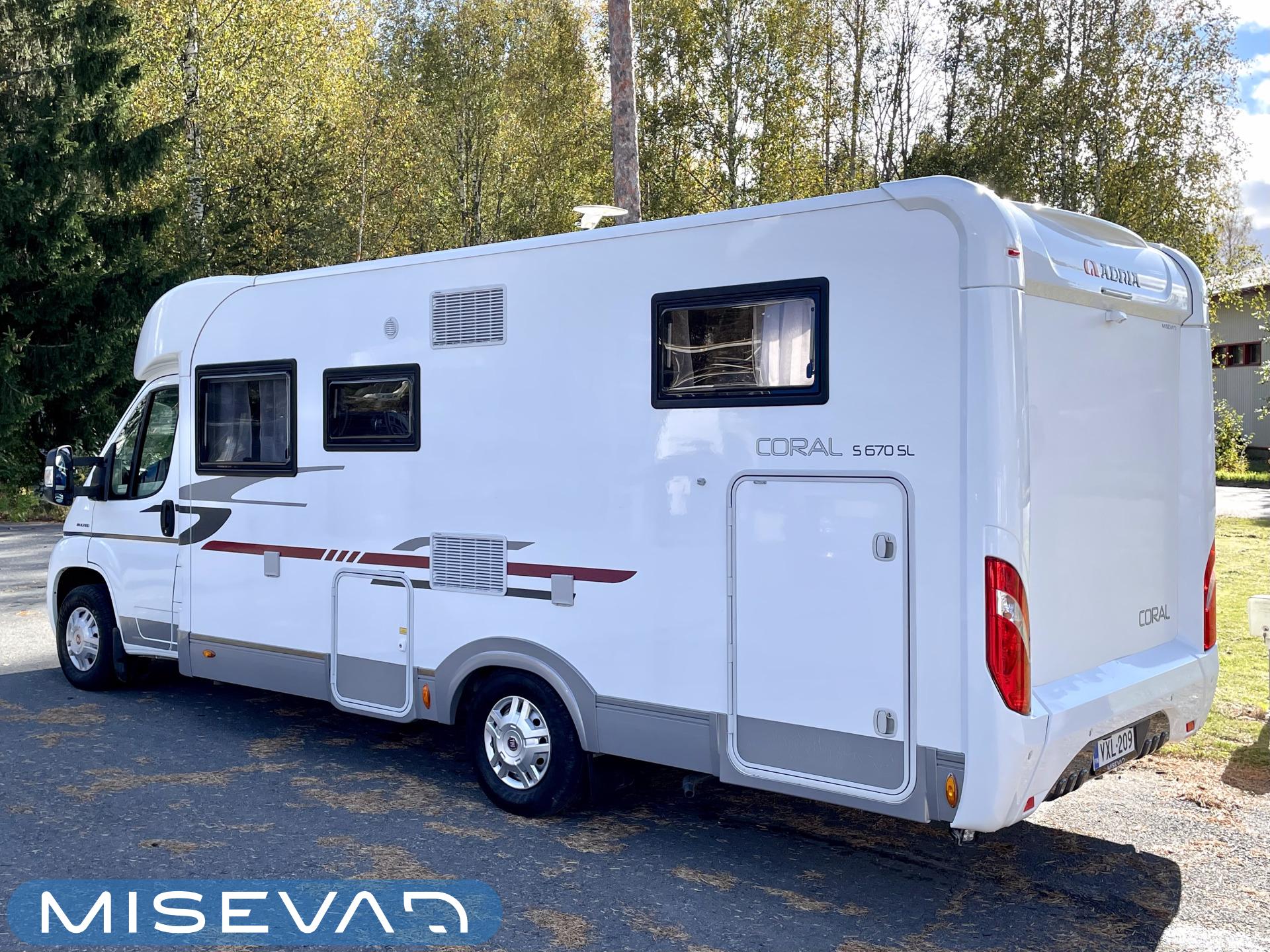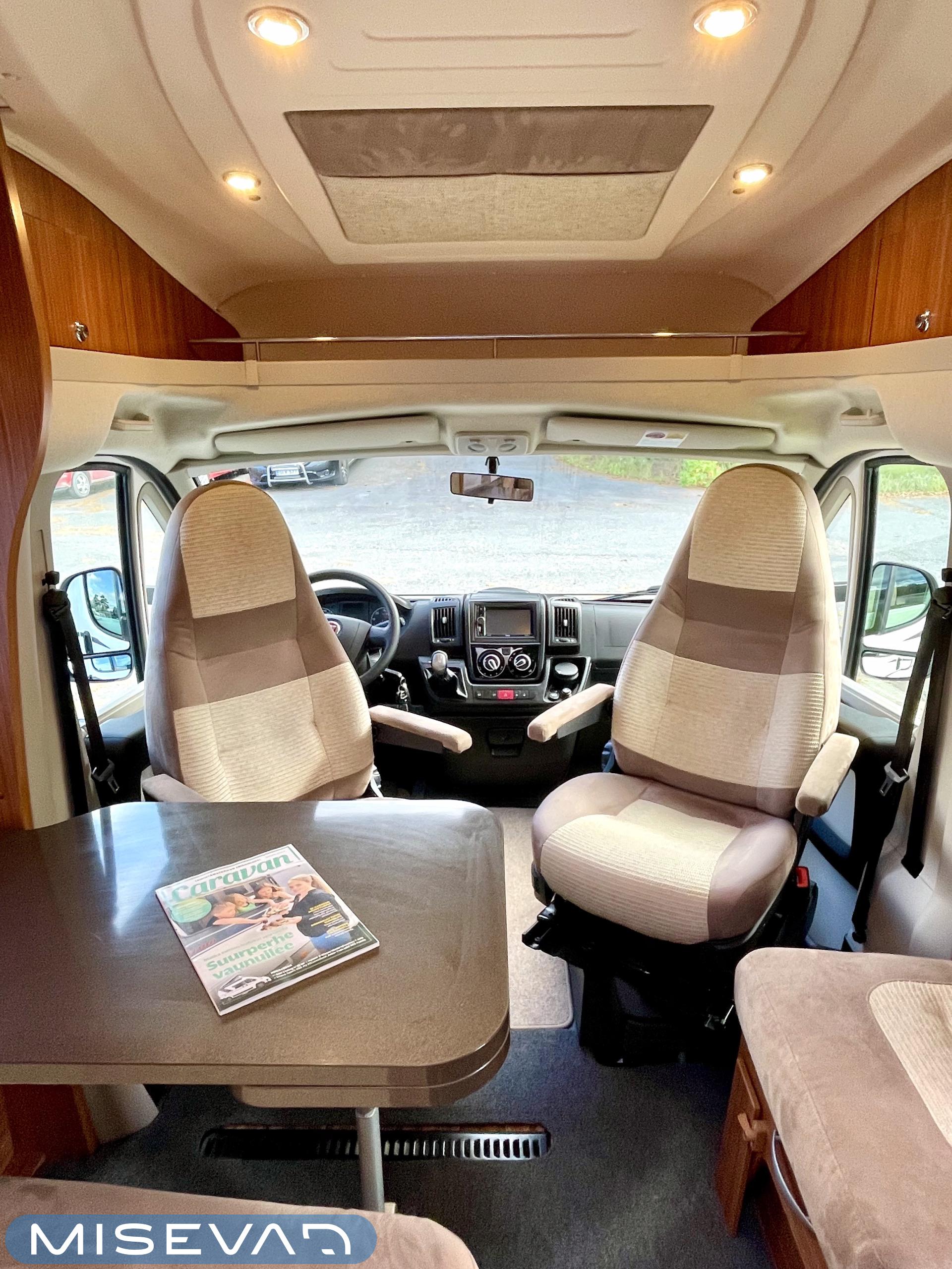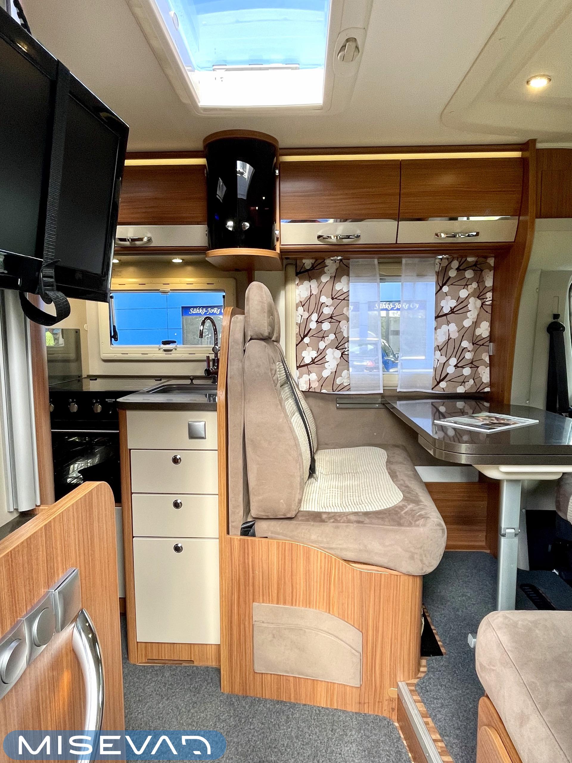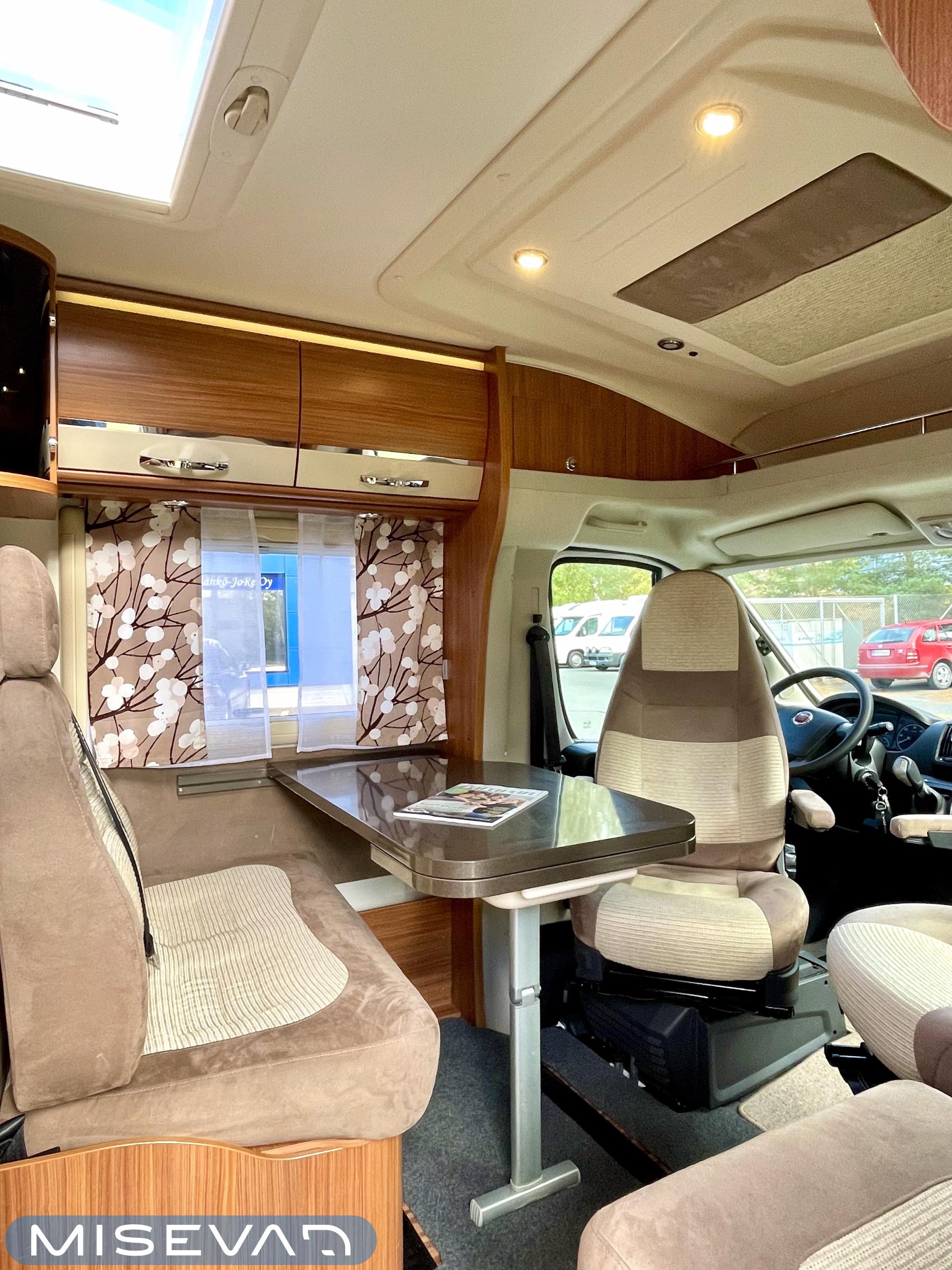 Joskus meillä Misevan pihalla törmää autoihin (ei kirjaimellisesti), jotka näyttävät ettei niitä ole käytetty juuri ollenkaan. Tämä Coral on juuri sellainen. Asuinosa on todella siistissä kunnossa, tekstiilit on tuoreen näköiset, eikä moitittavaa löydy muutenkaan. Lisäksi autoon on asennettu Termomatto, joka tunnetusti on mukava jalalle ja kestää käyttöä todella hyvin! Takaa autossa on erillissängyt, jotka halutessaan saa levitettyä isommaksi, keskipatjojen avulla. Portaiden molemminpuolin on säilytystilaa ja tilat on huomioitu valaistuksella. Keittiö on kaikkien kaipaama L-muotoinen ja tyylikkään kaasulieden lisäksi löytyy uuni pullan paistoon. Jääkaappi on tottakai isompaa mallia erillisellä pakastelokerolla. Vastapäätä oleva wc-tila on iso, suihku ja vaaterekki löytyy tilasta myöskin. Läpinäkyvä käsienpesuallas tuo ripauksen luxusta tilaan. Ruokailupöydän ympärille mahtuu neljä henkilöä ja tilaa illanistujaisiin on ruhtinaallisesti. Ducato on vasta ajettu sisään ja tällä autolla on varmasti kivoja kilometrejä vielä edessä. Kaiken kruunaa lämmityksenä oleva nestekiertoinen Alde ja lattialämmitys sähköllä. Tämä kaunokainen pitää nähdä omin silmin tai jos et malta odottaa, niin kysy vaikka videoesittelyä!