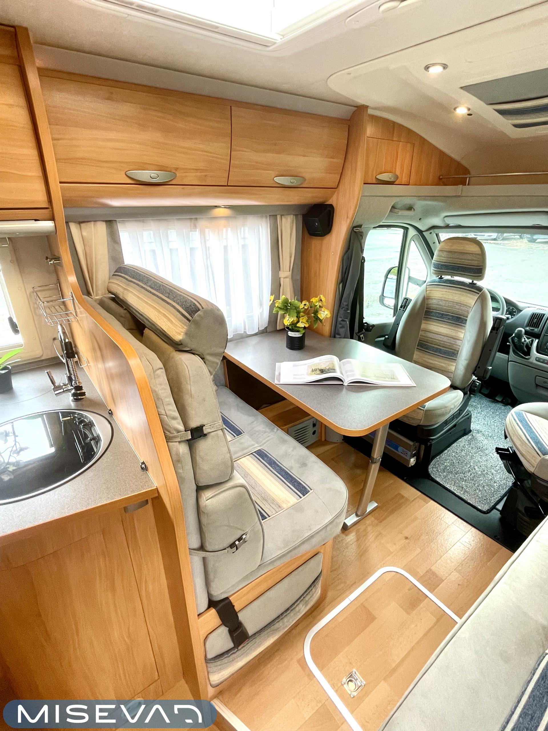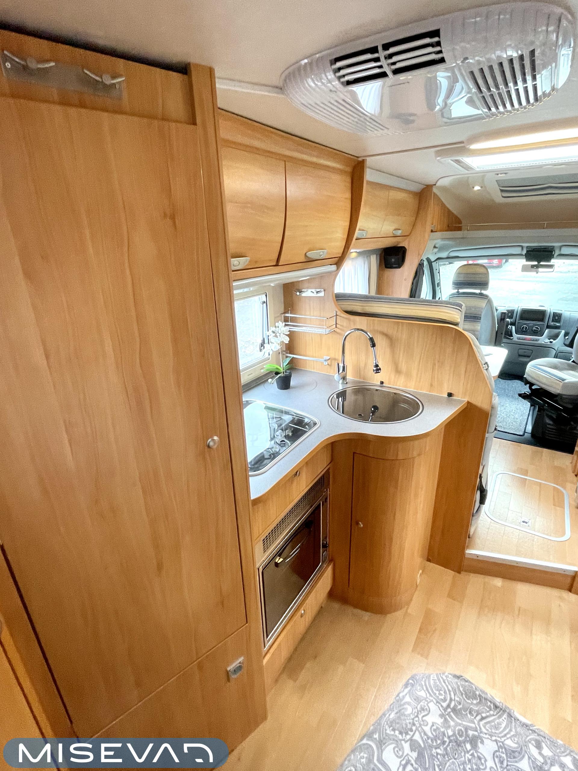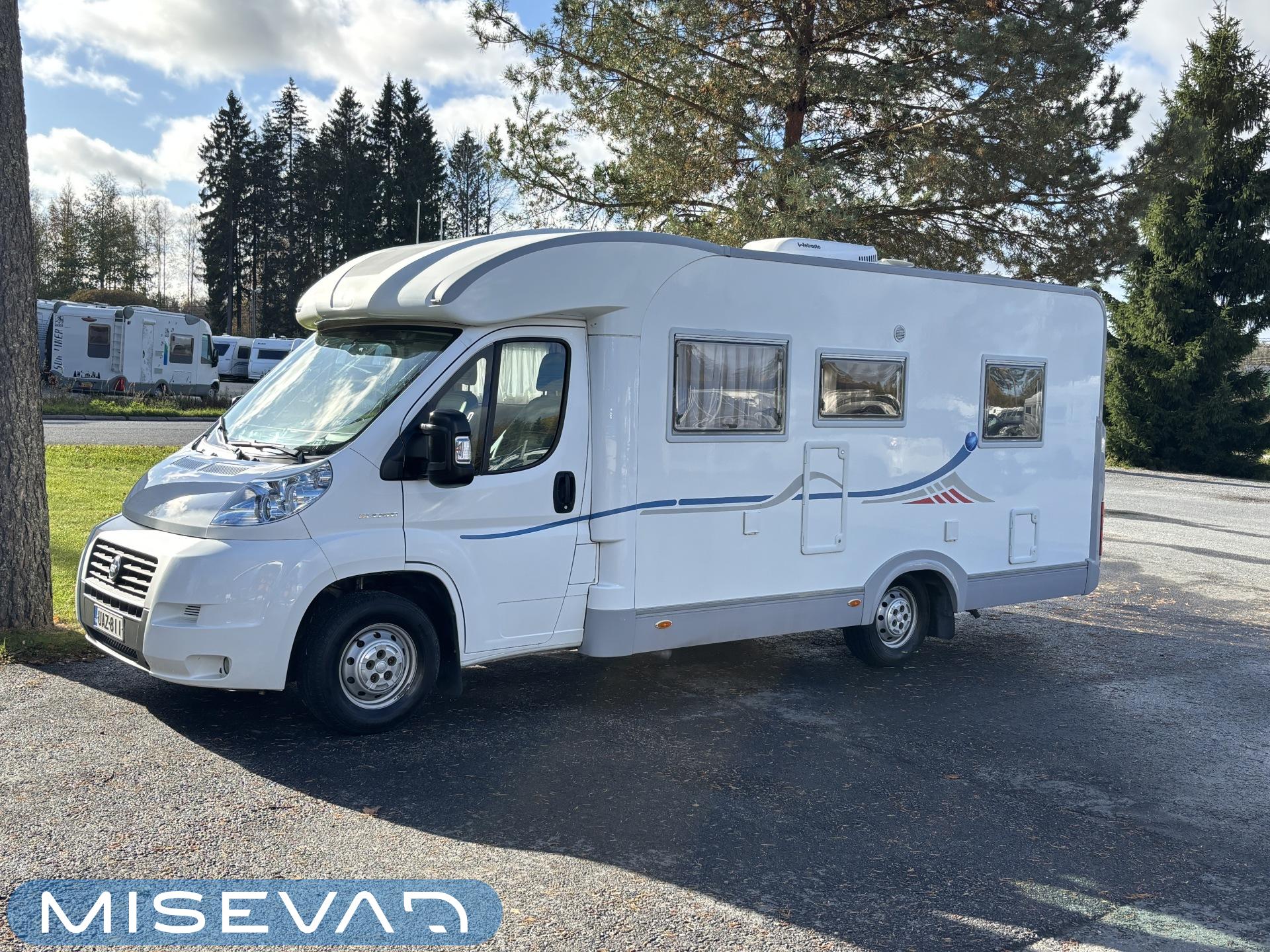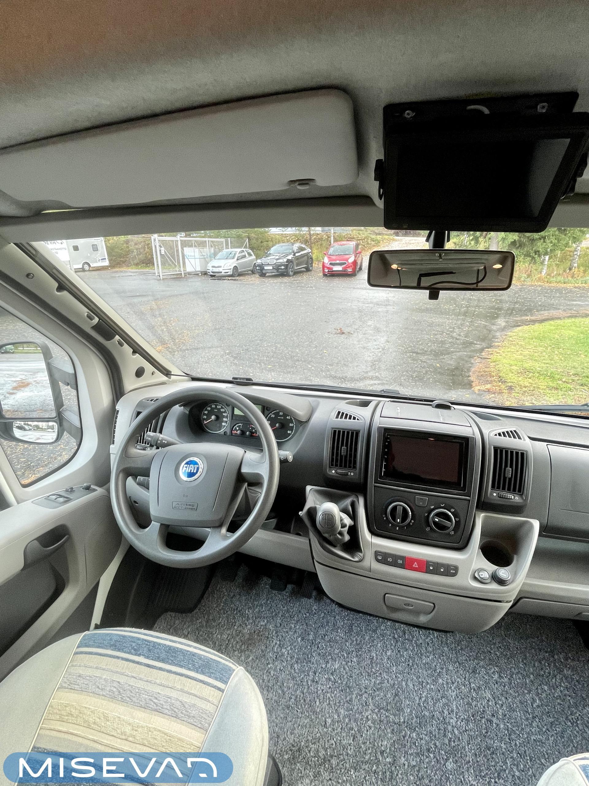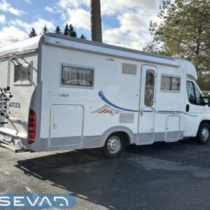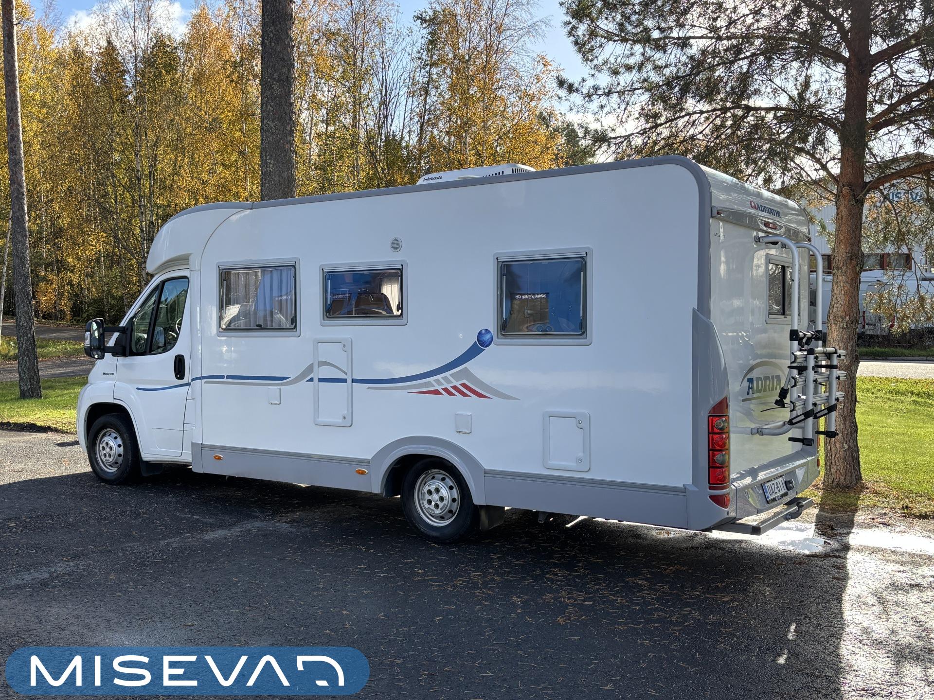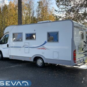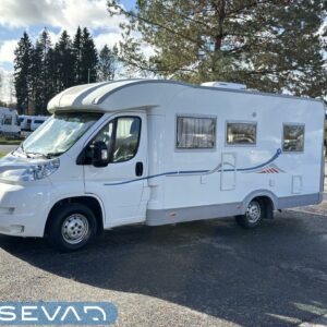 On sitten hienokuntoinen auto, niin sisältä kun päältäkin. Ajomääräkin todella maltillinen 91tkm. Varusteitakin on laiteltu niin, että heikoimpia hirvittää :-) . No joo … sitten asian pariin. Auton takaosasta löytyy pitkittäinen parivuode ja sen alta mukavasti säilytystiloja. Säilytystiloja pääsee hyödyntämään ulkopuolisen luukun kautta ja siellä on koko auton levyinen vapaa tila pidemmän tavaran kuljetusta (esim. sukset) varten. Vuoteen vieressä on kylppäritilat erillisellä suihkutilalla. Keskelle autoa asettuu keittiö ja säilytystiloja. Jääkappi on mallia tilava ja erillisellä pakastinlokerolla varustettuna. Extra herkkuina on mikro, sekä kaasu-uuni. Etuosasta muodostuu seurustelu / ruokailuryhmä jopa kuudelle hengelle. Pöytäryhmästä saa värkkäiltyä myös lisävuoteen 1-2 henkilölle. Pirtin lämmityksestä vastaa Trumaticin tehokkain (6kw) ilmakeskuslämmitys sähkövastuksilla ja onhan vielä mukavuusvarusteena sähköinen lattianlämmityskin. Hellettä torjutaan sekä ohjaamon, että asuintilan ilmastoinnin avulla. Valmiikisi on varusteltuna myös markiisi, vetokoukku ja pyöräteline. On hieno kokonaisuus ja varmasti tutustumisen arvoinen tapaus.