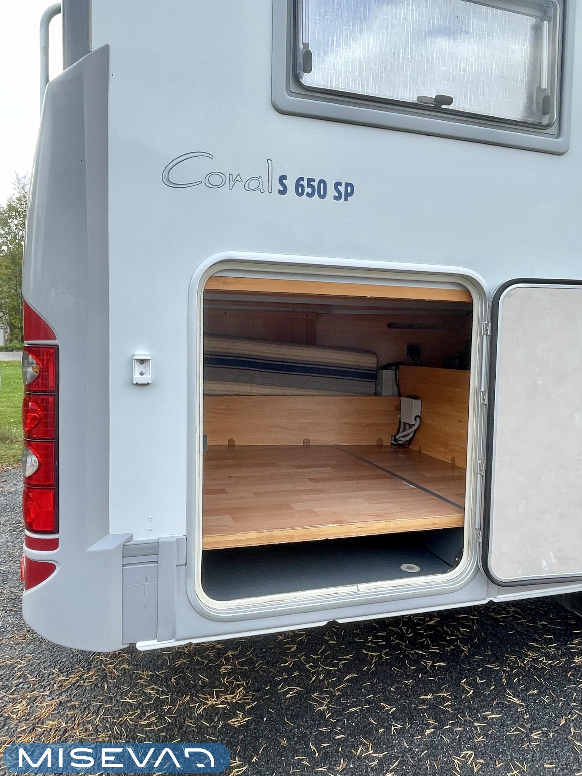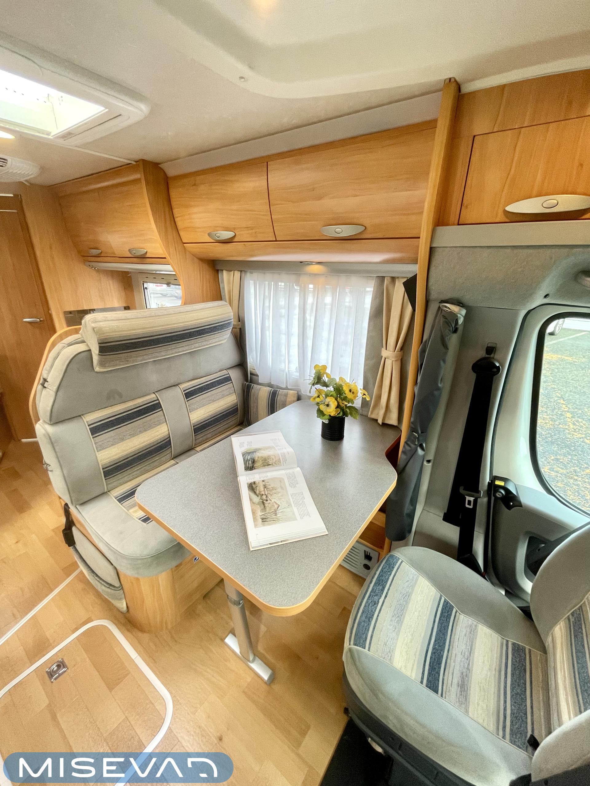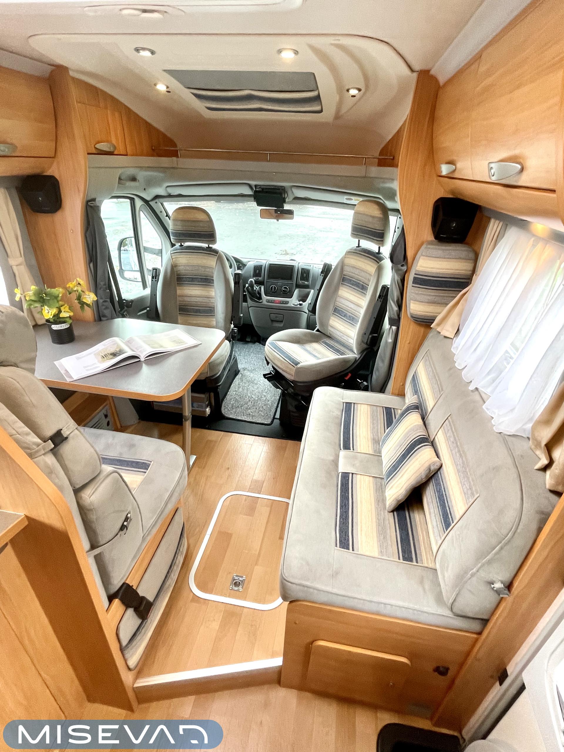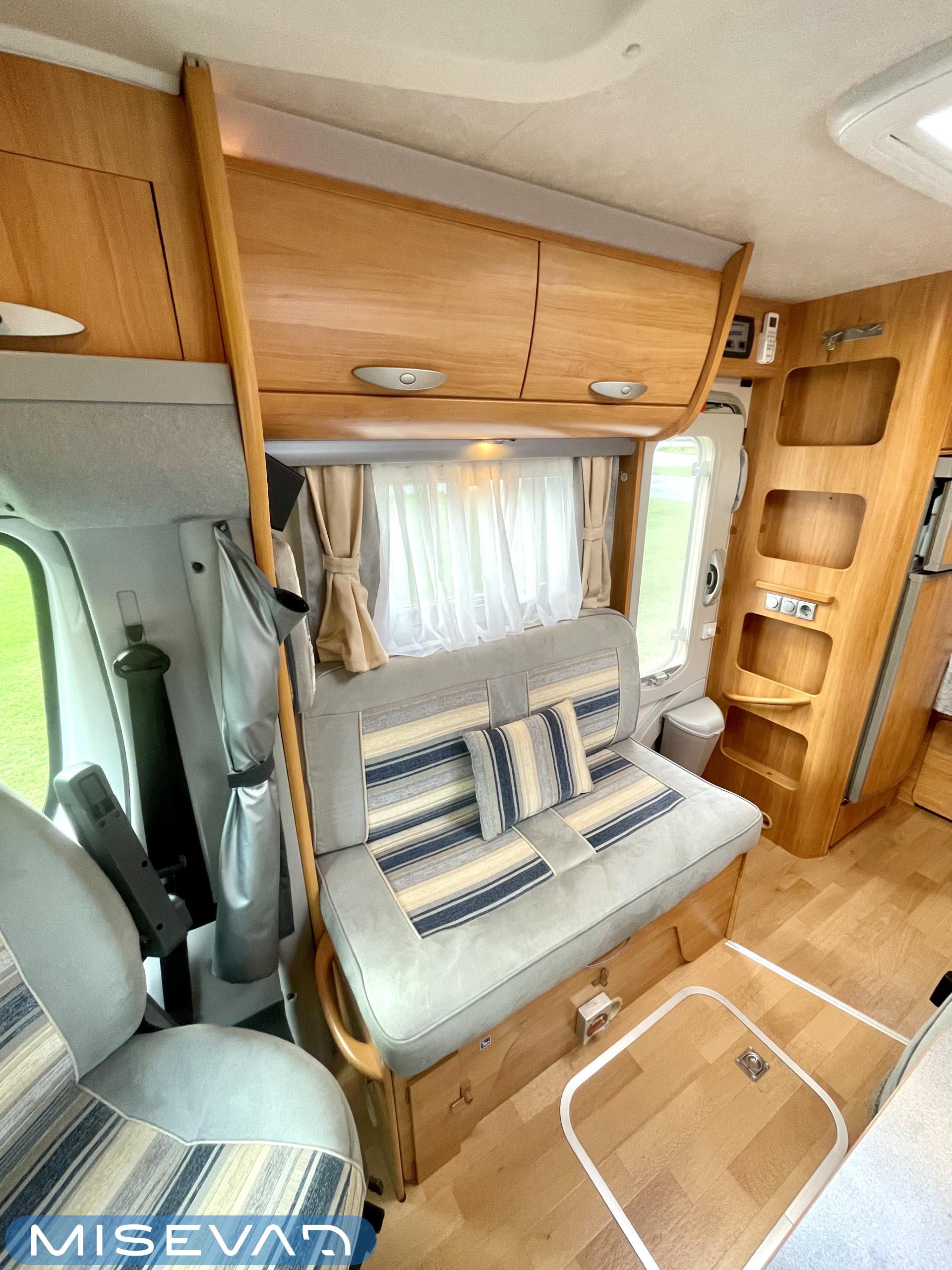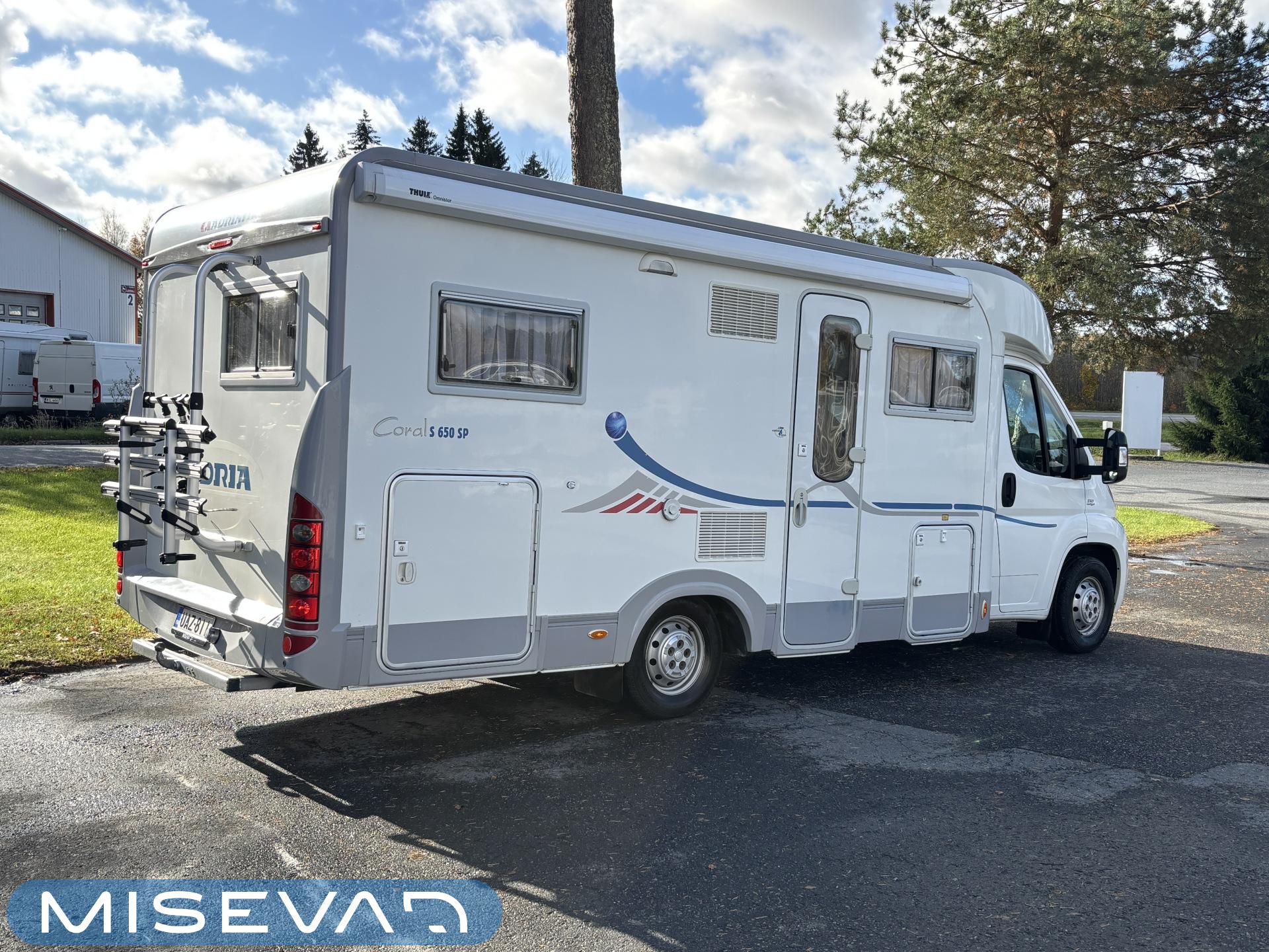 On sitten hienokuntoinen auto, niin sisältä kun päältäkin. Ajomääräkin todella maltillinen 91tkm. Varusteitakin on laiteltu niin, että heikoimpia hirvittää :-) . No joo … sitten asian pariin. Auton takaosasta löytyy pitkittäinen parivuode ja sen alta mukavasti säilytystiloja. Säilytystiloja pääsee hyödyntämään ulkopuolisen luukun kautta ja siellä on koko auton levyinen vapaa tila pidemmän tavaran kuljetusta (esim. sukset) varten. Vuoteen vieressä on kylppäritilat erillisellä suihkutilalla. Keskelle autoa asettuu keittiö ja säilytystiloja. Jääkappi on mallia tilava ja erillisellä pakastinlokerolla varustettuna. Extra herkkuina on mikro, sekä kaasu-uuni. Etuosasta muodostuu seurustelu / ruokailuryhmä jopa kuudelle hengelle. Pöytäryhmästä saa värkkäiltyä myös lisävuoteen 1-2 henkilölle. Pirtin lämmityksestä vastaa Trumaticin tehokkain (6kw) ilmakeskuslämmitys sähkövastuksilla ja onhan vielä mukavuusvarusteena sähköinen lattianlämmityskin. Hellettä torjutaan sekä ohjaamon, että asuintilan ilmastoinnin avulla. Valmiikisi on varusteltuna myös markiisi, vetokoukku ja pyöräteline. On hieno kokonaisuus ja varmasti tutustumisen arvoinen tapaus.