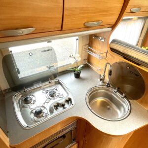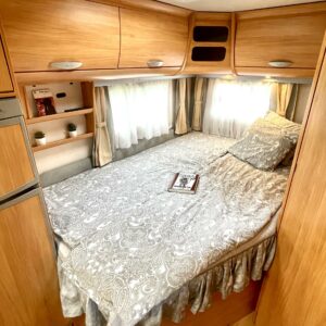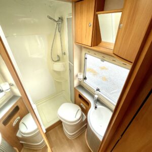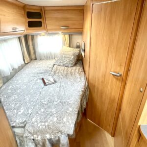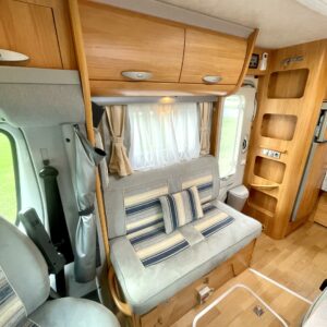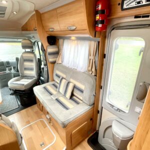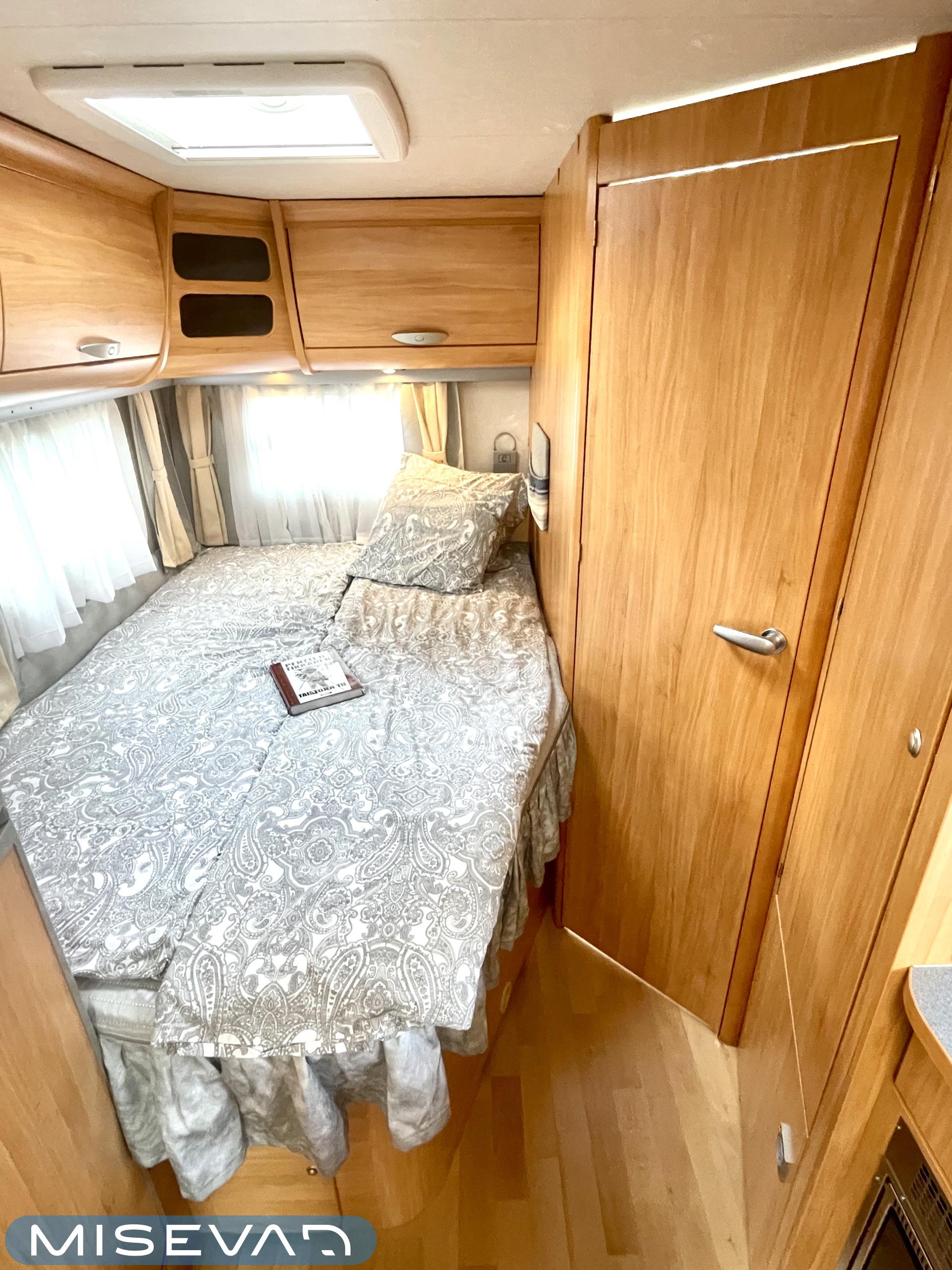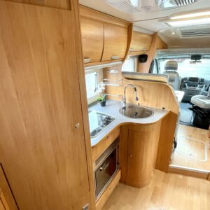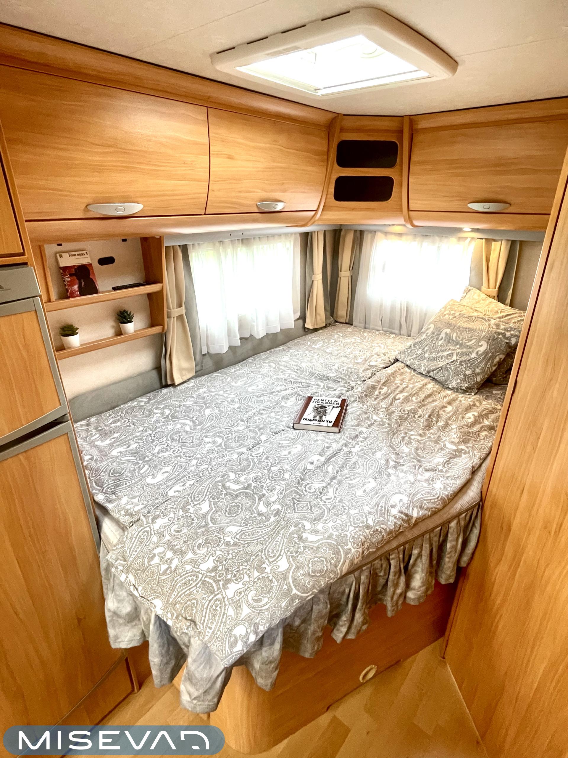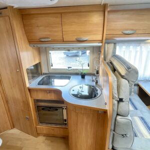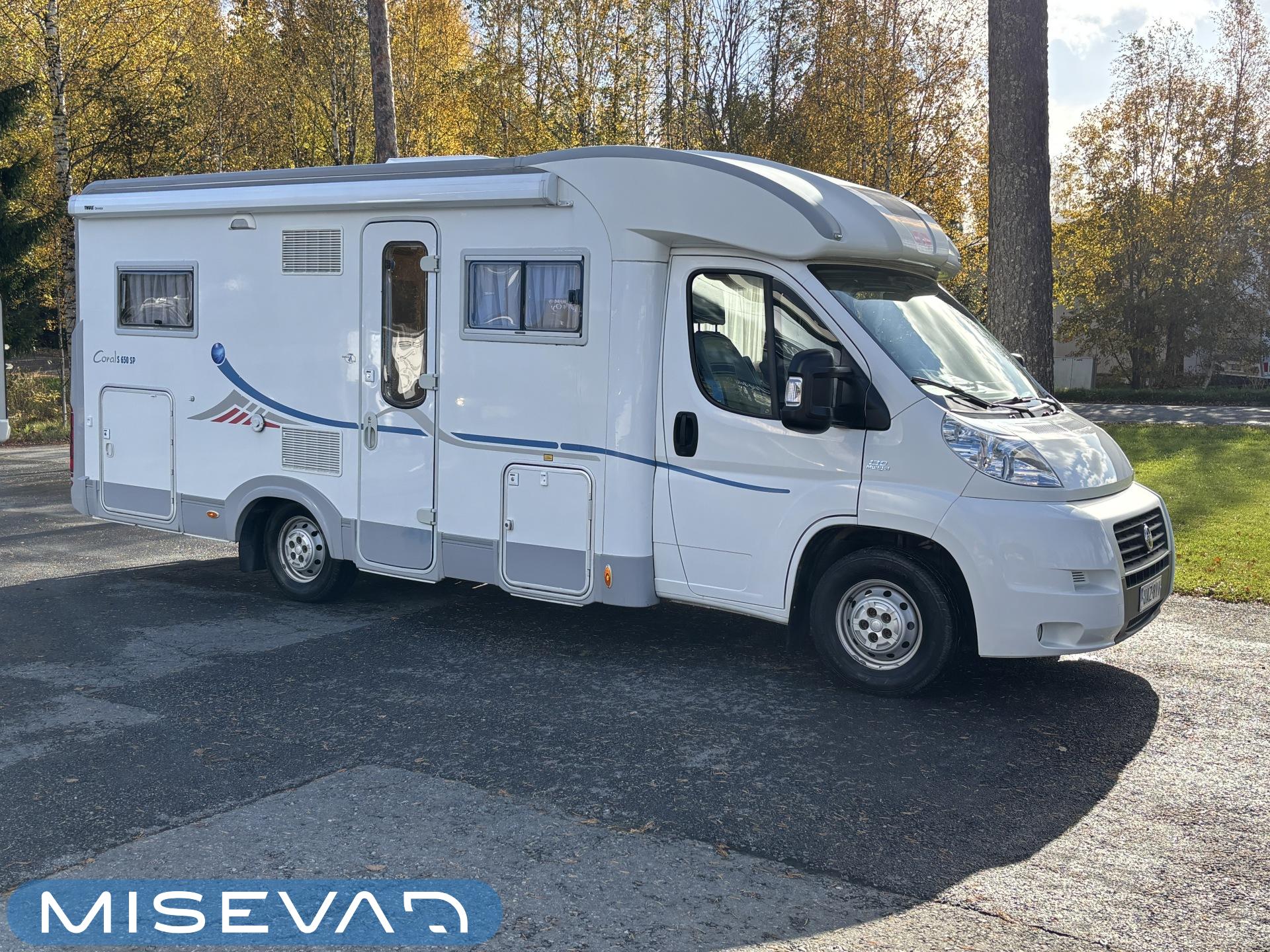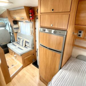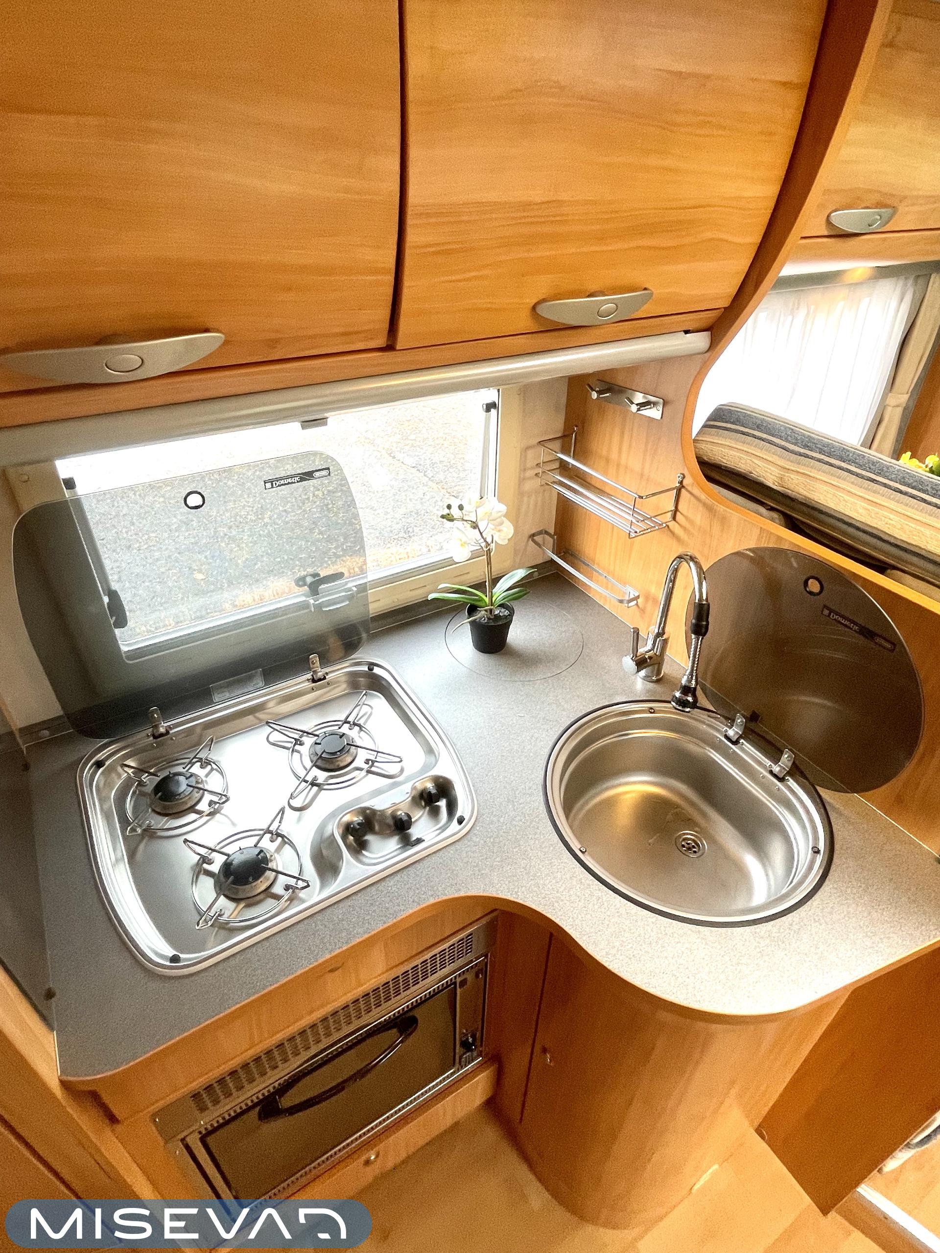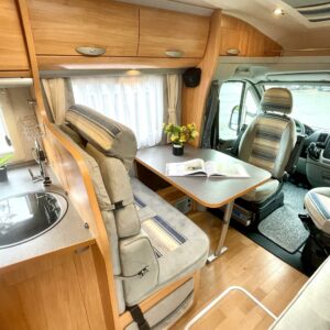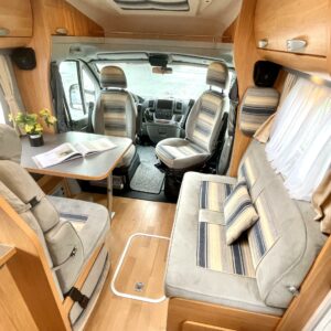 On sitten hienokuntoinen auto, niin sisältä kun päältäkin. Ajomääräkin todella maltillinen 91tkm. Varusteitakin on laiteltu niin, että heikoimpia hirvittää :-) . No joo … sitten asian pariin. Auton takaosasta löytyy pitkittäinen parivuode ja sen alta mukavasti säilytystiloja. Säilytystiloja pääsee hyödyntämään ulkopuolisen luukun kautta ja siellä on koko auton levyinen vapaa tila pidemmän tavaran kuljetusta (esim. sukset) varten. Vuoteen vieressä on kylppäritilat erillisellä suihkutilalla. Keskelle autoa asettuu keittiö ja säilytystiloja. Jääkappi on mallia tilava ja erillisellä pakastinlokerolla varustettuna. Extra herkkuina on mikro, sekä kaasu-uuni. Etuosasta muodostuu seurustelu / ruokailuryhmä jopa kuudelle hengelle. Pöytäryhmästä saa värkkäiltyä myös lisävuoteen 1-2 henkilölle. Pirtin lämmityksestä vastaa Trumaticin tehokkain (6kw) ilmakeskuslämmitys sähkövastuksilla ja onhan vielä mukavuusvarusteena sähköinen lattianlämmityskin. Hellettä torjutaan sekä ohjaamon, että asuintilan ilmastoinnin avulla. Valmiikisi on varusteltuna myös markiisi, vetokoukku ja pyöräteline. On hieno kokonaisuus ja varmasti tutustumisen arvoinen tapaus.