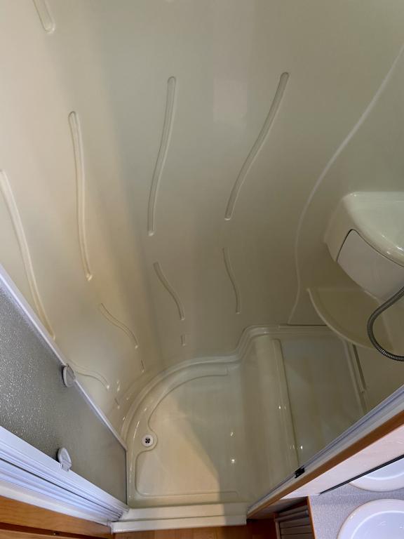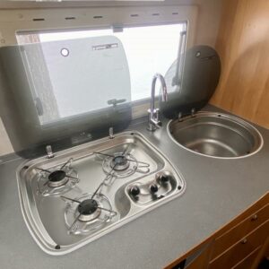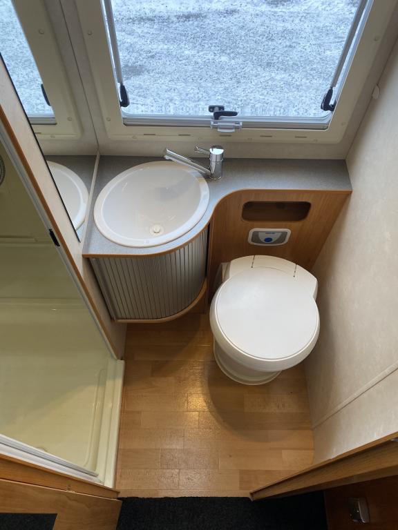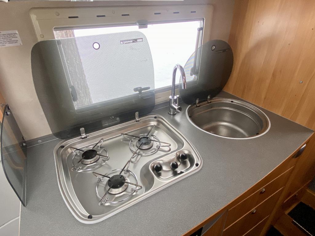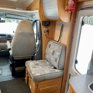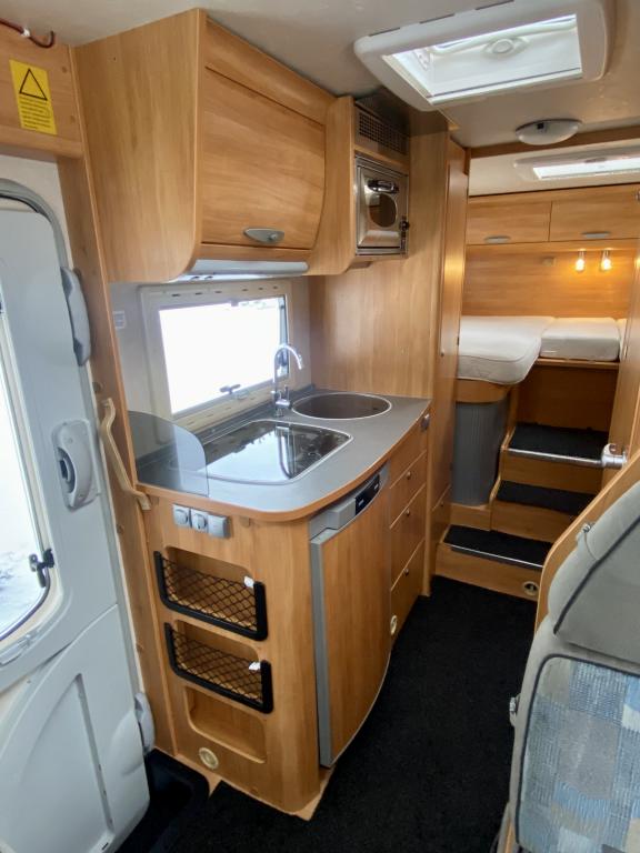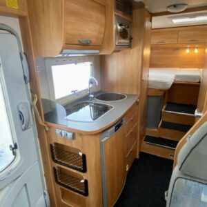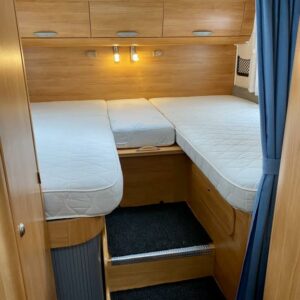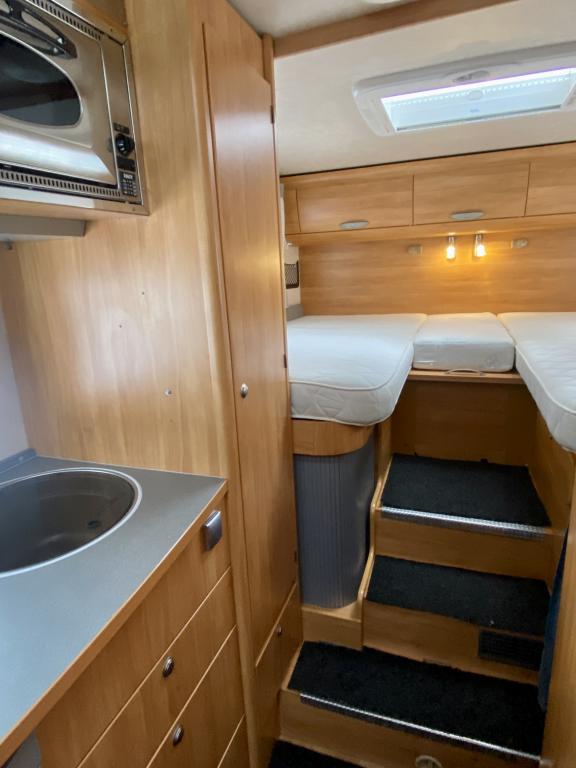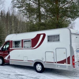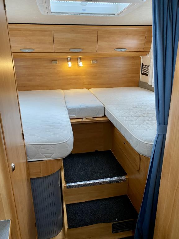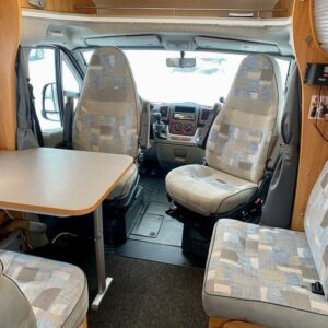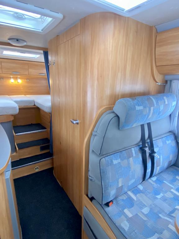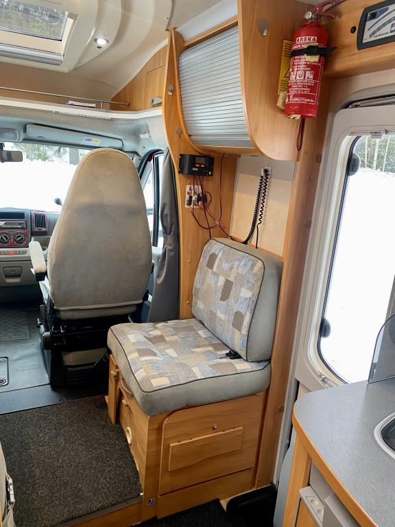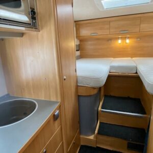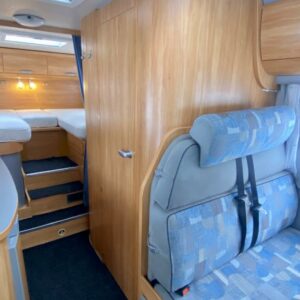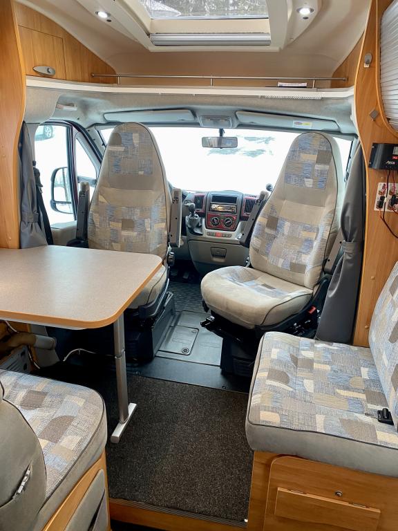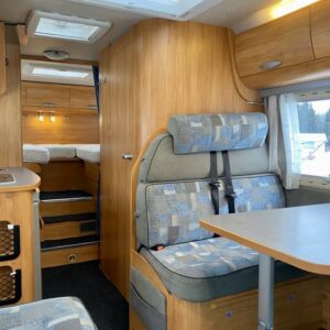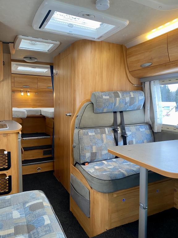 Haluttu pohjaratkaisu; Auton takaosassa pitkittäiset erillisvuoteet ja iso läpilastattava takatalli, edessä viihtyisä ja valoisa pöytäryhmä sivusohvalla. Auton keskivaihelta löytyy kaasu- uunilla varustettu keittiö sekä WC/ pesuhuone erillisellä suihkunurkkauksella.