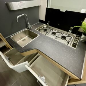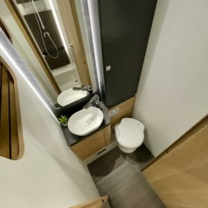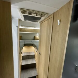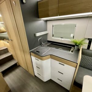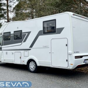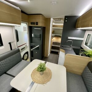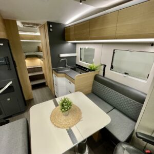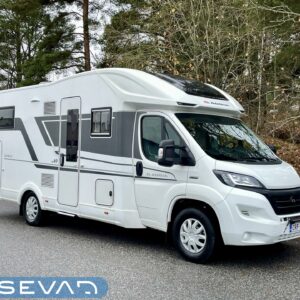 Upea kokonaisuus vaaleilla sävyillä paljon matkustavalle pariskunnalle. Selkeät erillisvuoteet, joihin saa myös koko auton levyisen pitkittäisen parivuoteen lisäpatjoilla. Tilapäisen sängyn satunnaisille vierailijoille pystytään rakentamaan viehättävästä istuinryhmästä, jossa muuten 6 henkilöä nauttii illasta. Iso jenkkijääkaappi ja liesi edesauttavat ruuan tekoa ja ei pidä unohtaa erillisiä Wc- ja suihkutiloja.