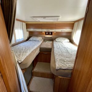 Tässä varusteltu Adria erillisvuoteilla ja isolla tavaratilalla valmiina reissuun