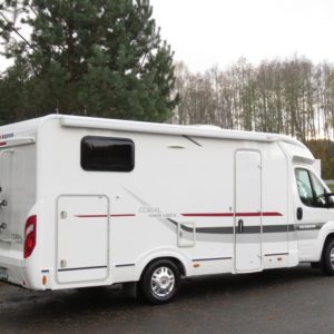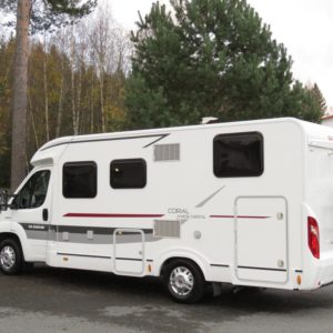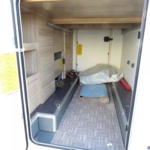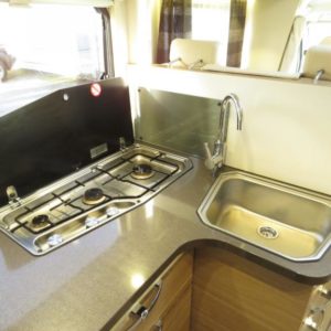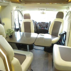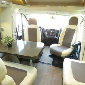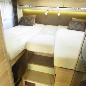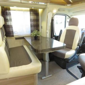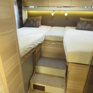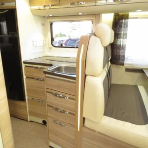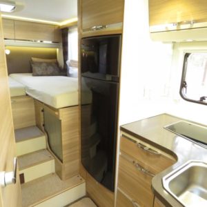 Auton takaosassa pitkittäiset erillisvuoteet ja iso läpilastattava takatalli, edessä valoisa pöytäryhmä sivusohvalla. L- keittiön varustukseen kuuluu iso jääkaappi- pakastin.