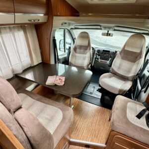 Auton etuosassa on valoisa ja viihtyisä pöytäryhmä, jonka ympärille mahtuu kääntyvien etuistuinten ja sivusohvan ansiosta mukavasti viisi henkeä maailmaa parantamaan.