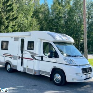 Varusteina mm.: Ilmastointi ajotilassa, Tehokas Truma- ilmakeskuslämmitys sähköpatruunalla, TV- antenni, Markiisi, Pyöräteline, Lattialämmitys, Kaasu-uuni..