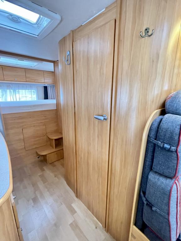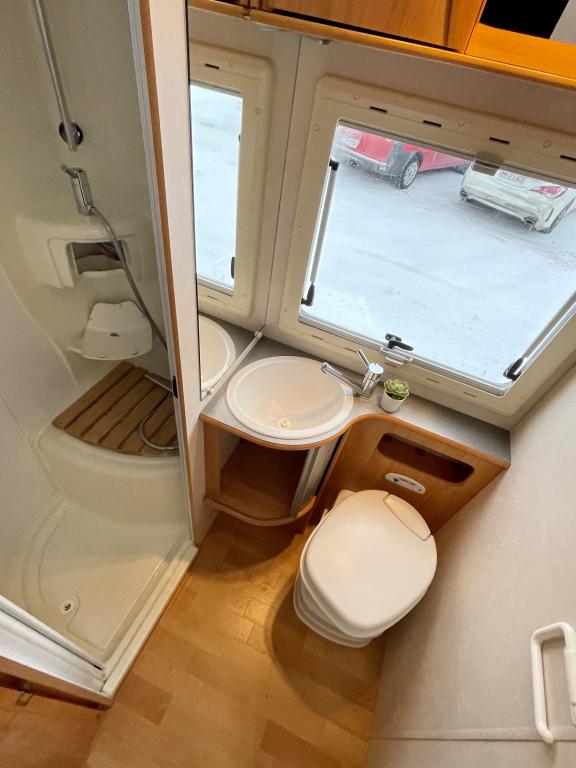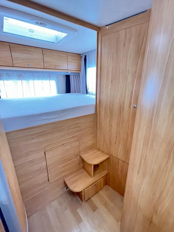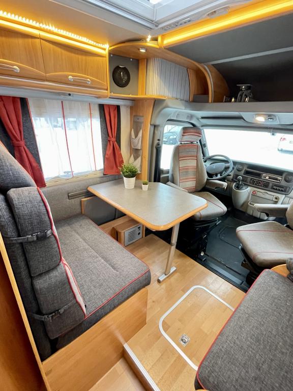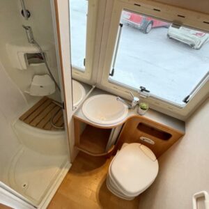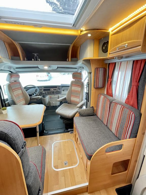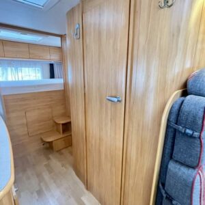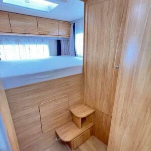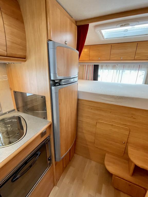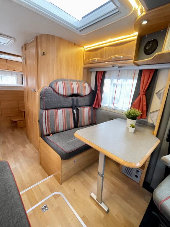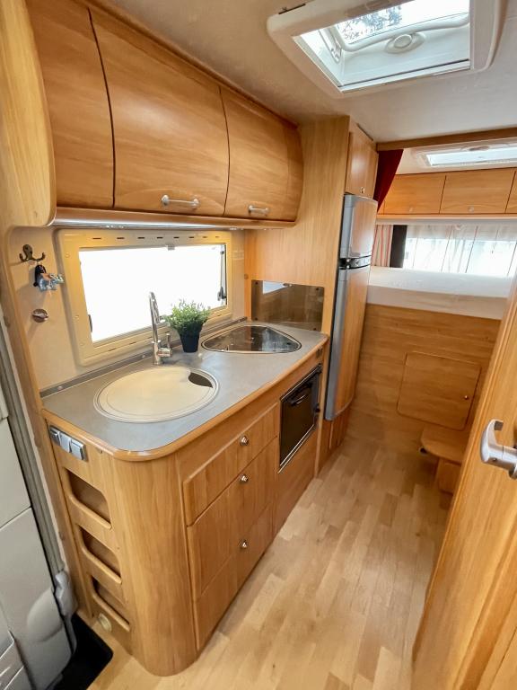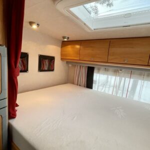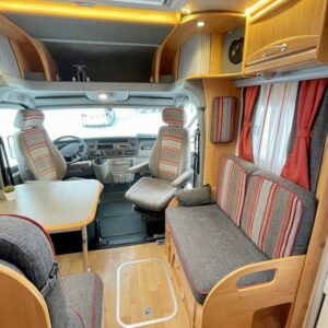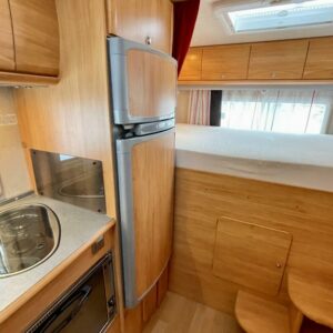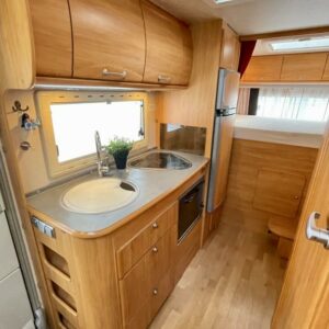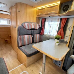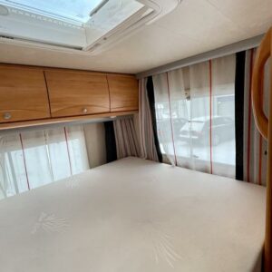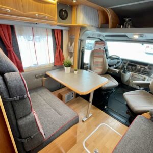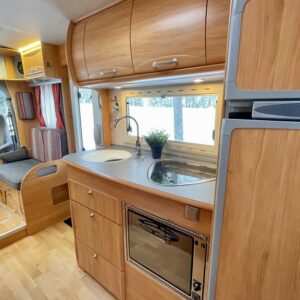 Pohjaratkaisussa edessä sohvaryhmä, josta tehtävissä lisävuode sekä kääntyvät etuistuimet. Keskiosassa keittiö sekä Wc & suihkutila. Takaosassa poikittainen parivuode jonka alla reilunkokoinen takatalli.