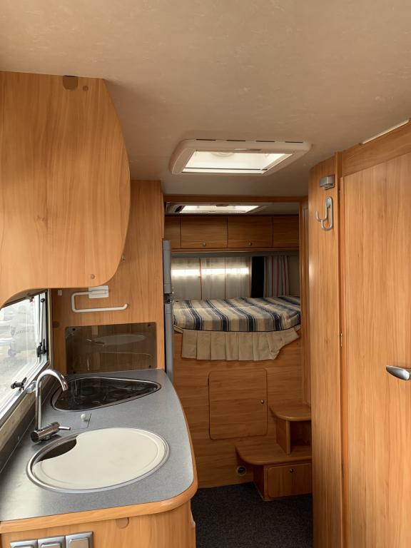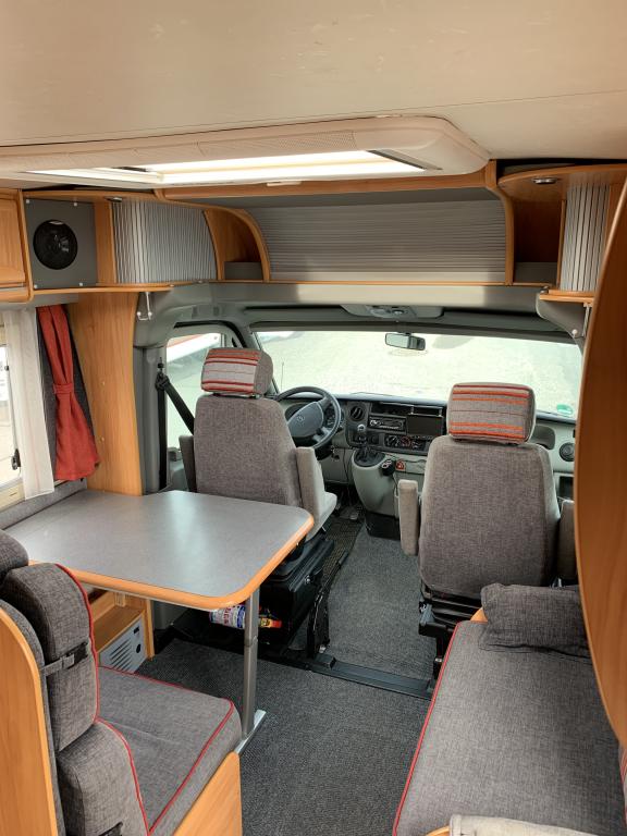 Takana parivuode poikittain, alla iso tallitila molemminpuolisin ovin. Keskellä tilava pesuhuone ja keittiö isolla jääkaapilla, edessä istuinryhmä 6:lle kääntyvin ohjaamon penkein.