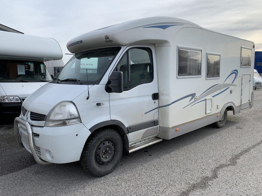 Takana parivuode poikittain, alla iso tallitila molemminpuolisin ovin. Keskellä tilava pesuhuone ja keittiö isolla jääkaapilla, edessä istuinryhmä 6:lle kääntyvin ohjaamon penkein.
