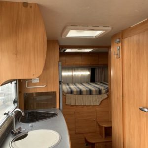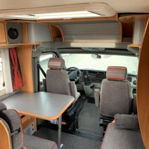 Takana parivuode poikittain, alla iso tallitila molemminpuolisin ovin. Keskellä tilava pesuhuone ja keittiö isolla jääkaapilla, edessä istuinryhmä 6:lle kääntyvin ohjaamon penkein.