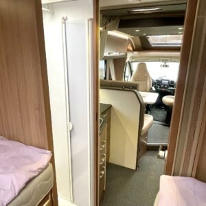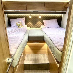 Takaosasta löytyy ovella eristettävä makuuhuone erillisillä WC- ja suihkutiloilla sekä pitkittäiset erillisvuoteet. Lisäksi istuinryhmän päällä on sähköisesti alasajettava laskuvuode.