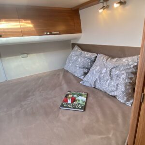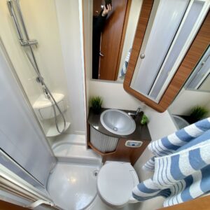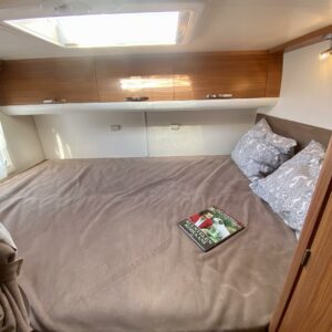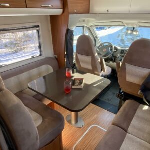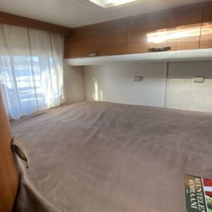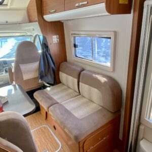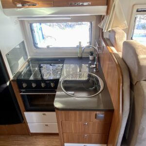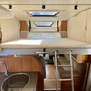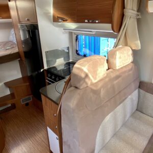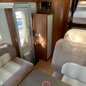 Keittiö sijaitsee keskellä autoa ja on modernisti L-mallinen. Kaasu-uuni, suuri jääkaappi sekä avara laskutila mahdollistavat suuremmatkin illallisjuhlat. Takana on viihtyisä poikittainen parisänky, mihin on helppoa kulkea kiinteiden portaiden kautta. Tilava WC-tila on lähellä, sisältäen myös tilan suihkulle. Etuosassa oleva laskuvuode on myös suunniteltu järkevästi siten, että se ei tuki kulkureittiä asuintilan ovelle ja jättää vielä rajoitetusti istuinryhmänkin käyttöön. Kaiken kruunaa suuri läpilastattava takatalli.