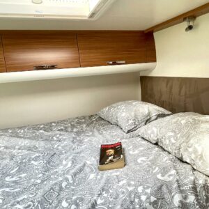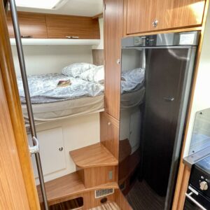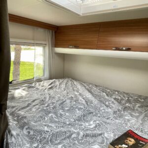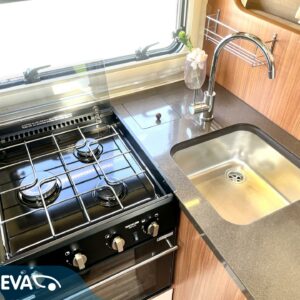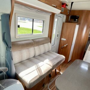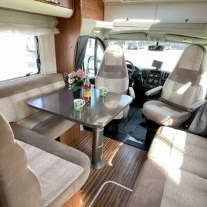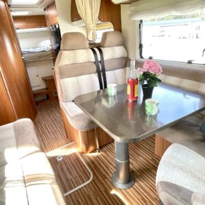 Keittiö sijaitsee keskellä autoa ja on modernisti L-mallinen. Kaasu-uuni, suuri jääkaappi sekä avara laskutila mahdollistavat suuremmatkin illallisjuhlat. Takana on viihtyisä poikittainen parisänky, mihin on helppoa kulkea kiinteiden portaiden kautta. Tilava WC-tila on lähellä, sisältäen myös tilan suihkulle. Etuosassa oleva laskuvuode on myös suunniteltu järkevästi siten, että se ei tuki kulkureittiä asuintilan ovelle ja jättää vielä rajoitetusti istuinryhmänkin käyttöön. Kaiken kruunaa suuri läpilastattava takatalli.