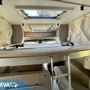 Auton etuosasta löytyy hulppea pöytäryhmä, jonka ympärille mahtuu mukavasti seitsemän henkeä. Iso kattoikkuna ja vaaleat tekstiilit tuovat tilaan raikkautta. Pöytäryhmän päälle saadaan sähköisesti laskettua lisävuode mikäli nukkumapaikkoja tarvitaan lisää.
