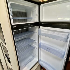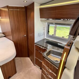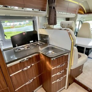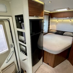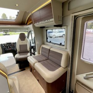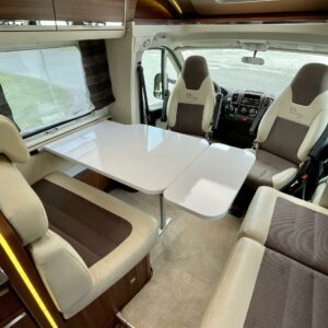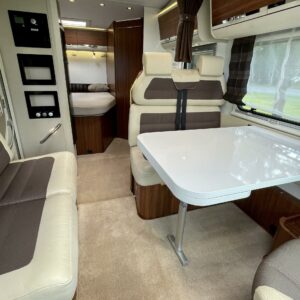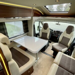 Valoisa ja viihtyisä pöytäryhmä jopa kuudelle löytyy auton etuosasta. L- keittiön varustukseen kuuluu iso jääkaappi- pakastin.