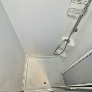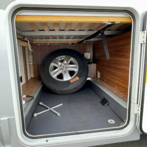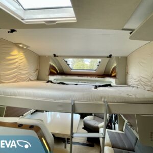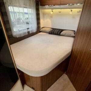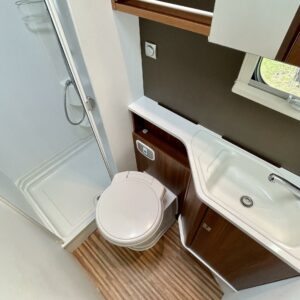 Auton takaosassa on pitkittäinen parivuode ja tilava pesuhuone/ WC erillisellä suihkunurkkauksella varustettuna.
