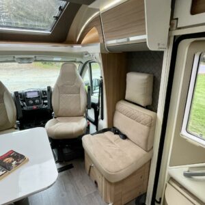 Auton etuosasta löytyy valoisa ja viihtyisä pöytäryhmä, jonka ympärille mahtuu mukavasti 6 ihmistä. Lisää makuupaikkoja saa helposti katosta sähköisesti laskeutuvan parivuoteen ansiosta.