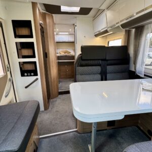 Auton etuosassa on hulppea, isojen kattoikkunoiden valossa kylpevä pöytäryhmä. Makuupaikkatarpeen kasvaessa pöydän päältä laskeutuu sähköisesti leveä nostovuode.