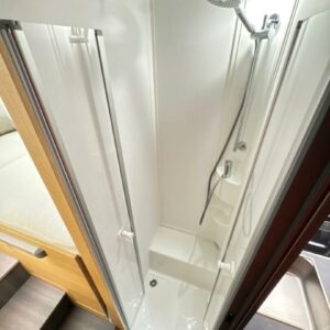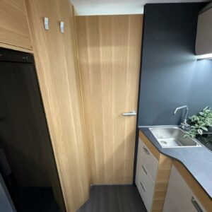 Auton keskivaiheilla on keittiö, jonka varustukseen kuuluu liesituuletin ja iso jääkaappi- pakastin.