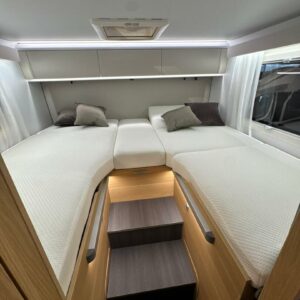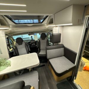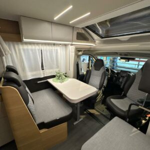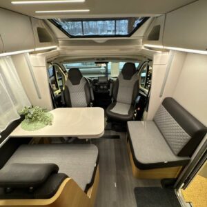 Auton etuosasta löytyy viihtyisä ja valoisa pöytäryhmä sivusohvalla. Kääntyvien etuistuinten ansiosta pöydän ympärille mahtuu mukavasti 5 henkeä menneitä muistelemaan ja tulevaisuutta suunnittelemaan. Lisää makuupaikkoja saa sähköisesti laskeutuvat vuoteen avulla.