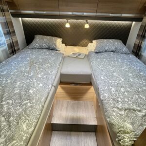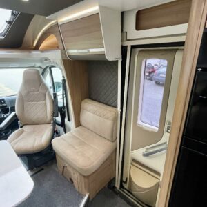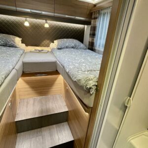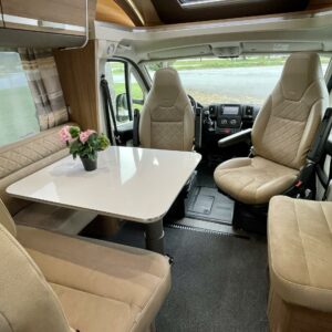Auton etuosasta löytyy valoisa ja viihtyisä pöytäryhmä, jonka ympärille mahtuu mukavasti 6 ihmistä. Lisää makuupaikkoja saa helposti katosta sähköisesti laskeutuvan parivuoteen ansiosta.