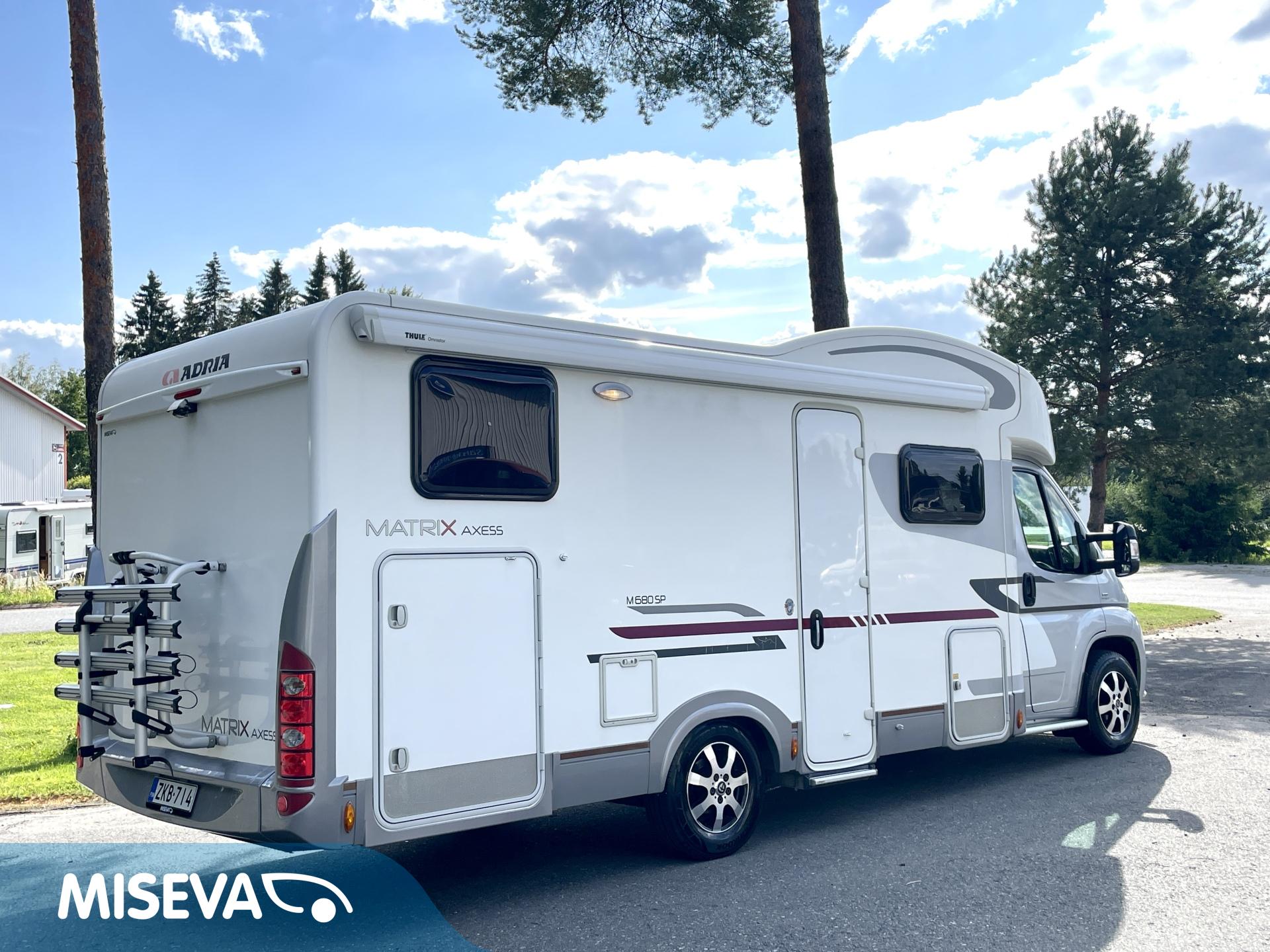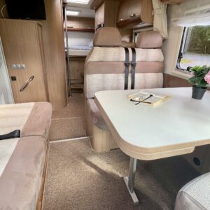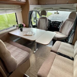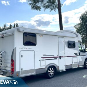Mukavilla metreillä oleva Adria jossa takana hulppea tallitila, edessä istuinryhmän päällä alaslaskettava parivuode