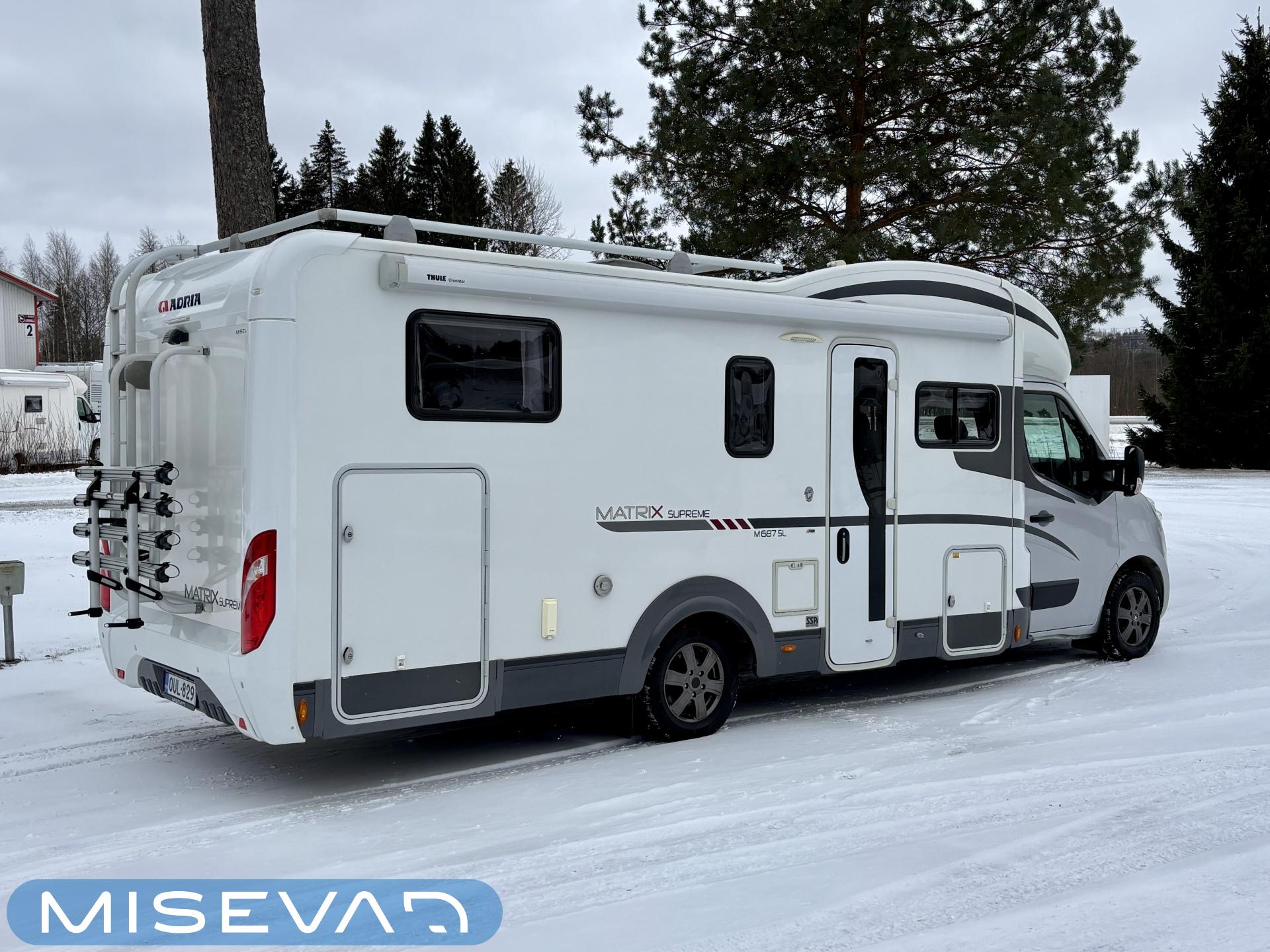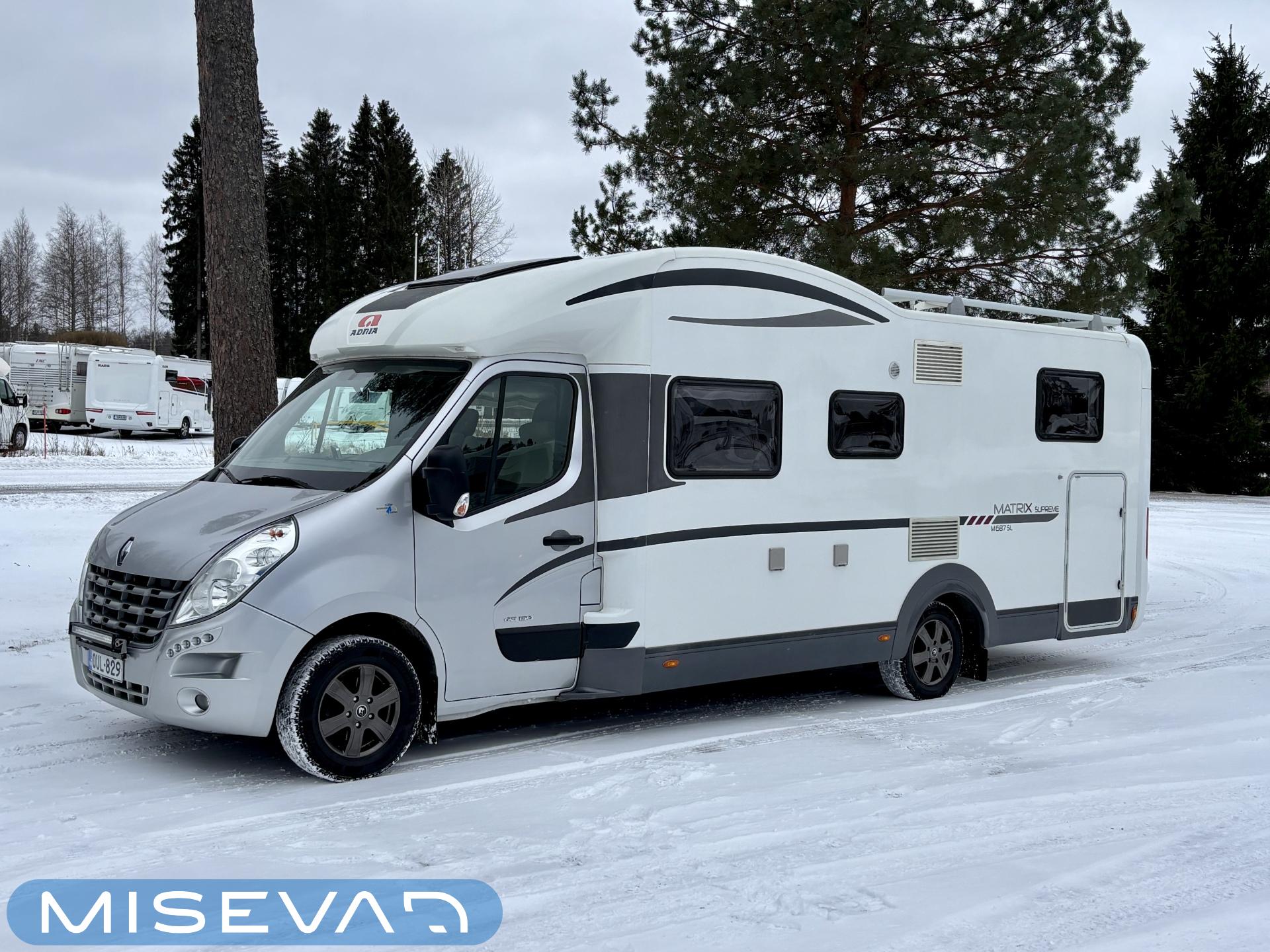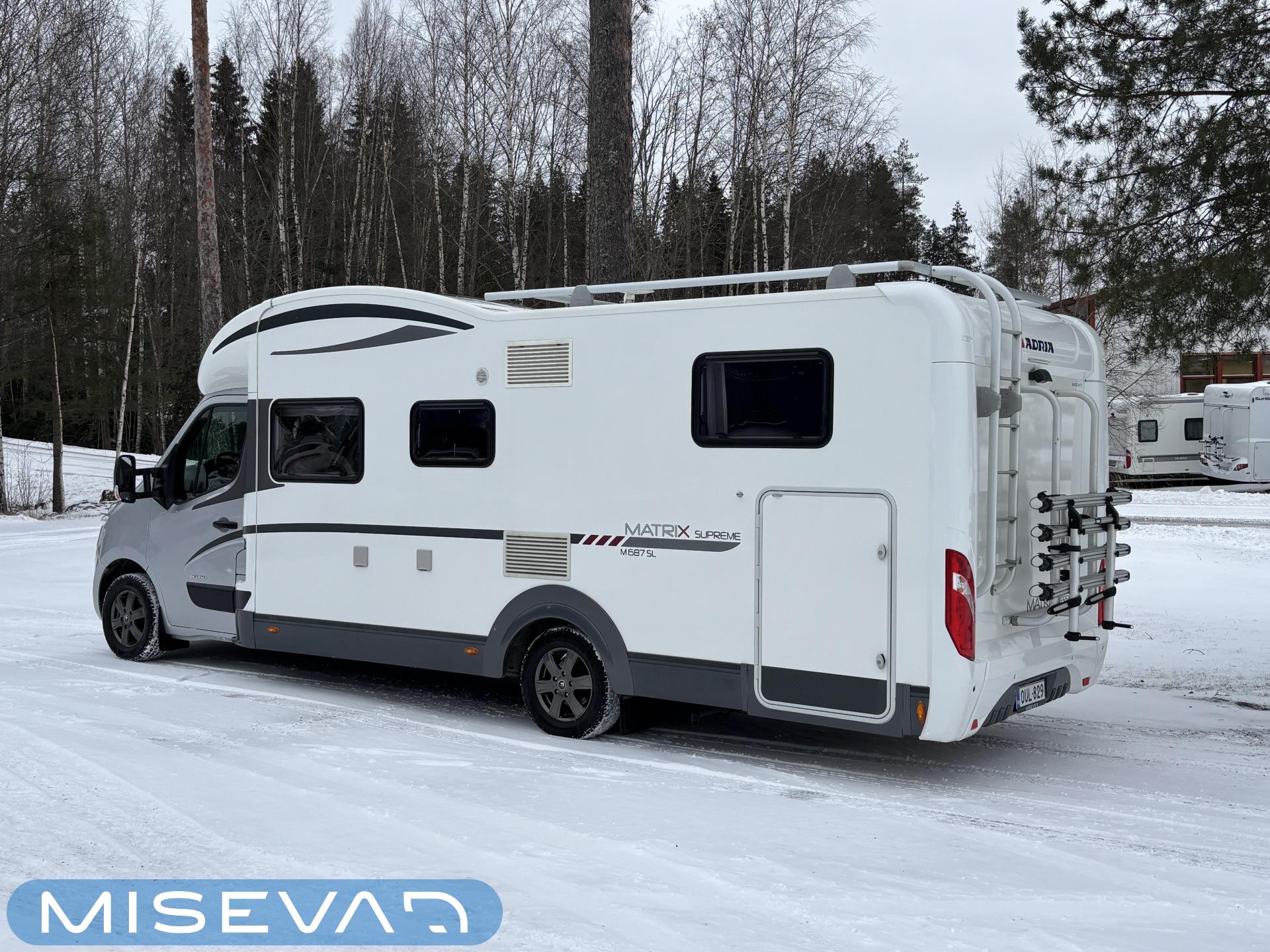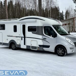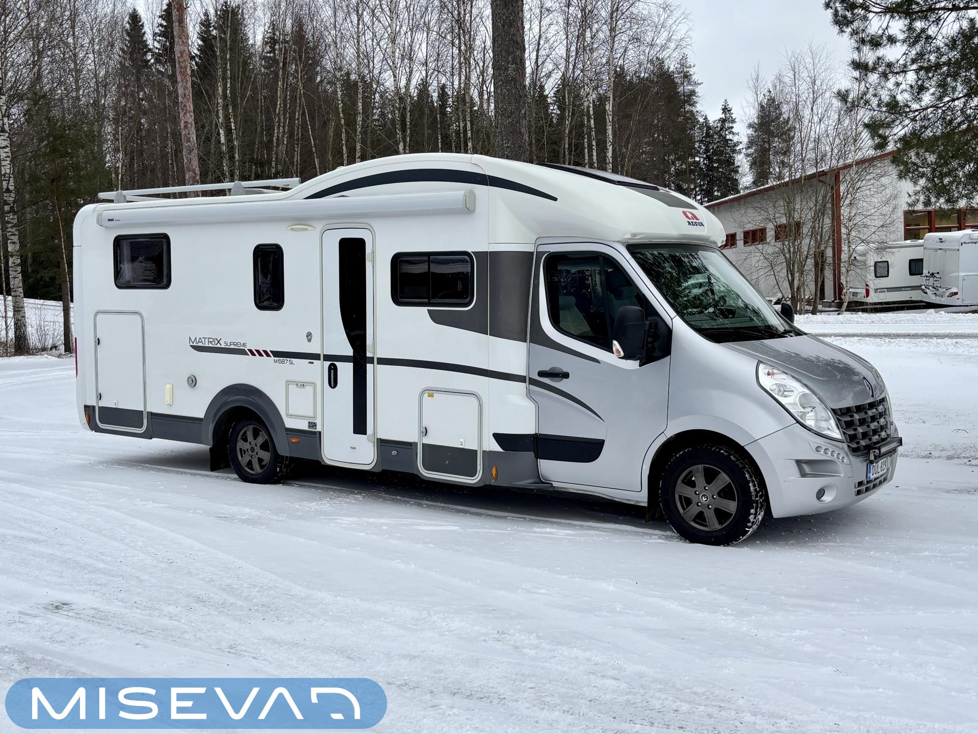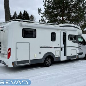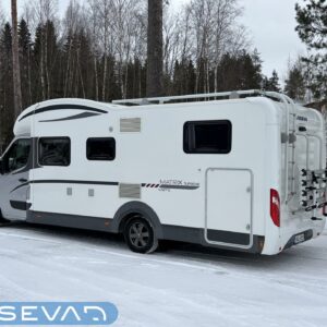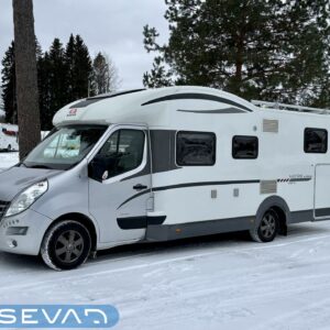 Adrian Matrix Supreme mallisarjan puoli-integroitu matka-auto hillityllä ajomäärällä ja hillittömällä varustelulla. Vaikka tämä ”reiluhkon” kokoinen auto tarjoaa todella hulppeat tilat reissun päälle, niin tämä on silti ohjastettavissa ihan normaalilla B-luokan (henkilöauto) ajokortilla. Takaosassa on erillisvuoteet mitkä tarvittaessa pystyy yhdistämään lisäpalan avulla yhdeksi jättivuoteeksi. Kampetta mahtuu mukaan vuoteiden alle jäävään takatalliin ja osa säilytystiloista on operoitavissa myös auton sisäpuolelta. Keskelle autoa asettuu L-keittiö isolla jääkaapilla ja kaasu-uunilla varustettuna. Toiselta sivulta löytyy kylppäritilat missä on erillinen suihkutila. Etuosaa hallitsee L-sohva minne yhdistyvät kipparinpenkit, sekä kahden istuttava sivusohva. Pöytäryhmästä saadaan myös tarpeen tullen värkättyä lisävuode. Ryhmän yläpuollella on laskuvuode minne mahtuu nukkumaan kaksi henkilöä. Huomattavaa on, että vaikka laskuvuode on alhaalla, niin se ei hankaloita sisäänkäyntiä. Koko komeus lämpenee Alden nestekeskuslämmityksen avulla ja nestekierto on myös lattiassa. Järjestelmästä löytyy tietysti myös sähkövastukset, sekä lämmönvaihdin. Sähköpuolelle on ”hifistelty” lisäpotkua 140Ah AGM akun avulla, aurinkopaneelilla, sekä etäohjattavalla invertterillä. Valmiiksi asennettuna on myös markiisi, pyöräteline ja kaasun ulosotto. Alustan virkaa toimittaa 150 hevosvoimainen Renault Master ja jämäkkyyttä menoon on lisätty taka-akselilla olevilla lisäilmajousilla. Ohjaamossa tietysti ilmastointi, sähköllä lasit ja peilit, vakkari, navigaattori ja peruutuskamera. Varsin mallikkaan kunnon omaava auto. Tulehan tutustumaan ja ihastumaan.