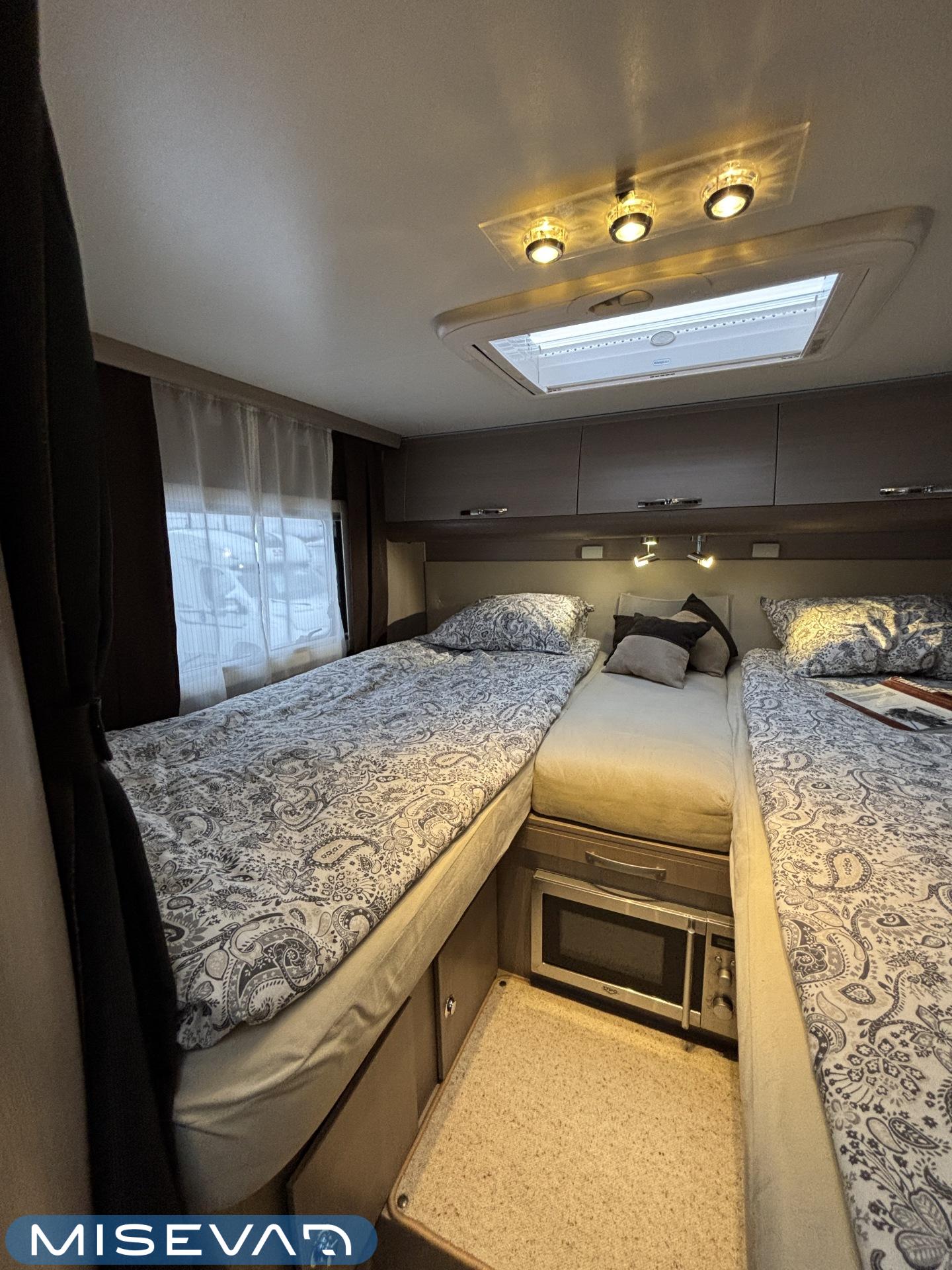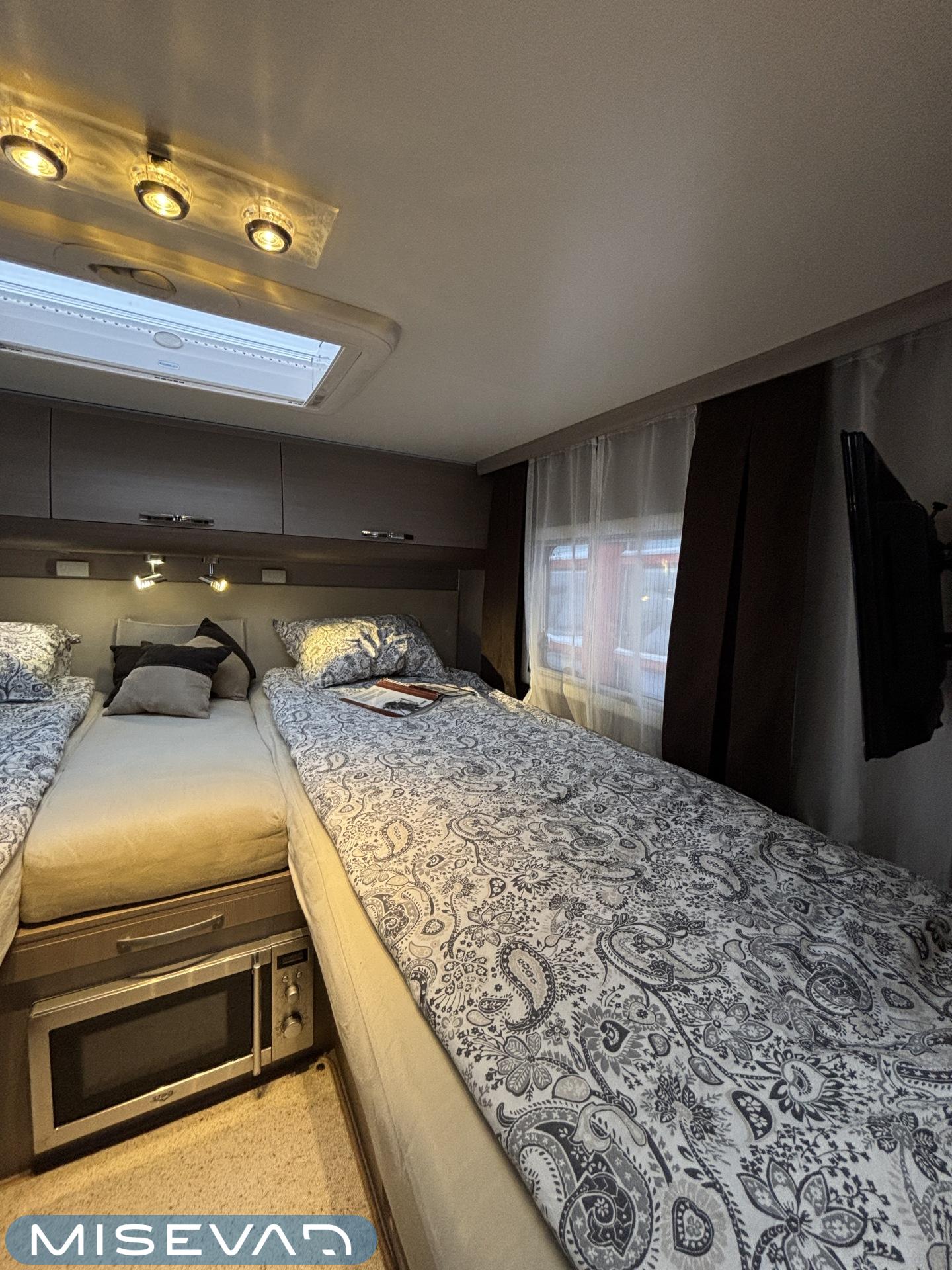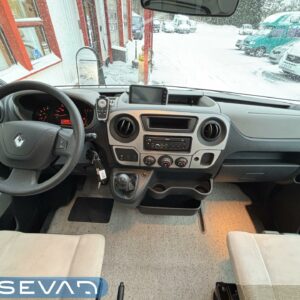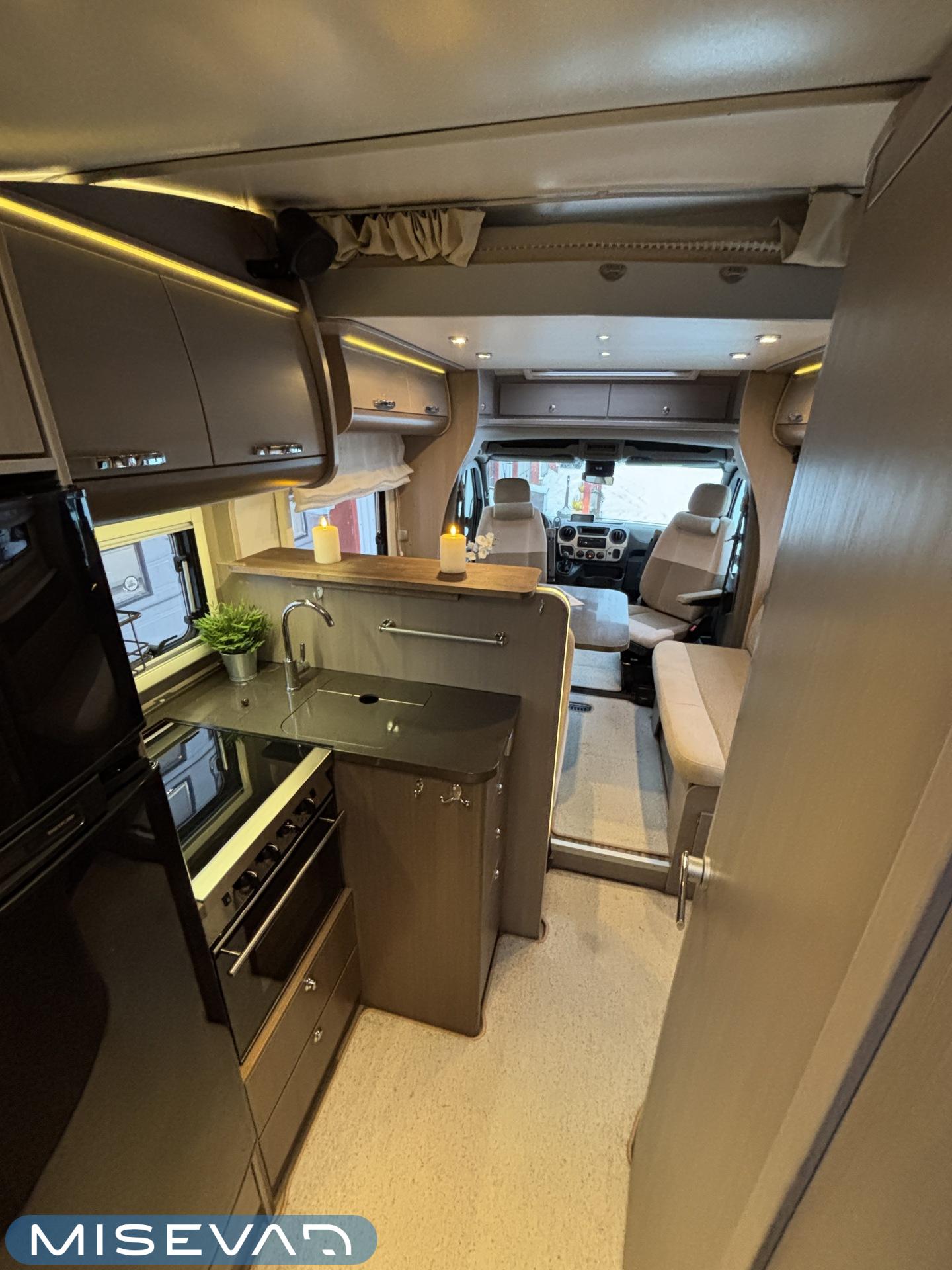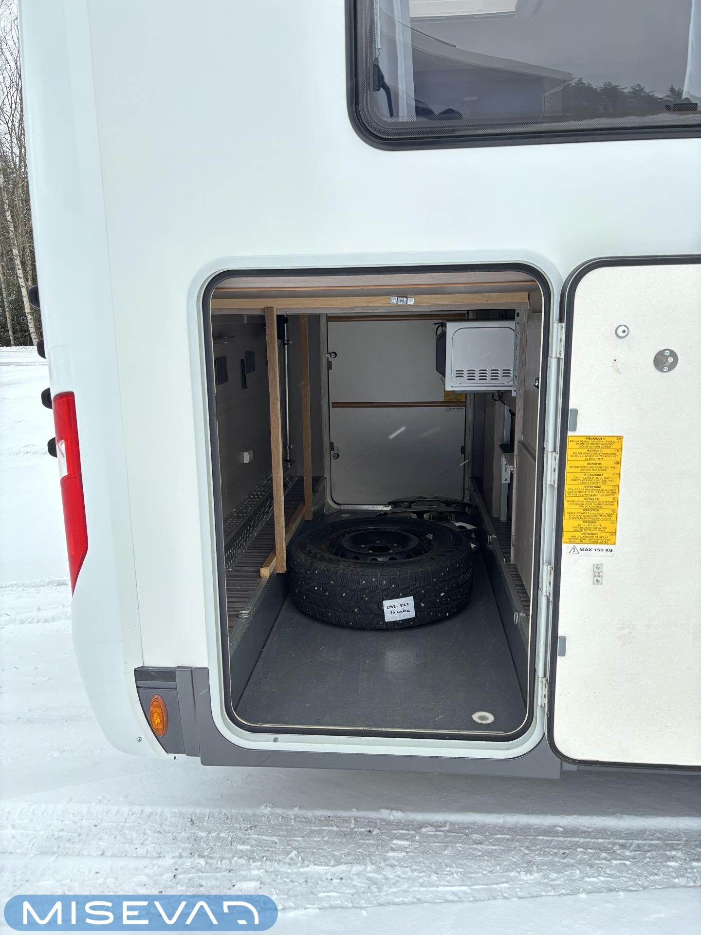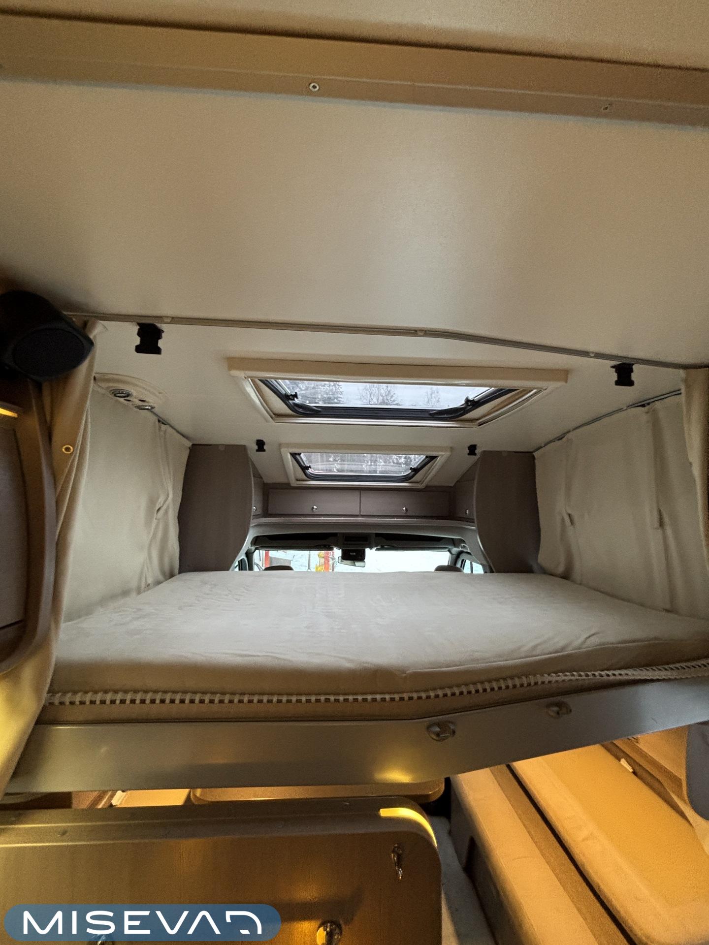 Adrian Matrix Supreme mallisarjan puoli-integroitu matka-auto hillityllä ajomäärällä ja hillittömällä varustelulla. Vaikka tämä ”reiluhkon” kokoinen auto tarjoaa todella hulppeat tilat reissun päälle, niin tämä on silti ohjastettavissa ihan normaalilla B-luokan (henkilöauto) ajokortilla. Takaosassa on erillisvuoteet mitkä tarvittaessa pystyy yhdistämään lisäpalan avulla yhdeksi jättivuoteeksi. Kampetta mahtuu mukaan vuoteiden alle jäävään takatalliin ja osa säilytystiloista on operoitavissa myös auton sisäpuolelta. Keskelle autoa asettuu L-keittiö isolla jääkaapilla ja kaasu-uunilla varustettuna. Toiselta sivulta löytyy kylppäritilat missä on erillinen suihkutila. Etuosaa hallitsee L-sohva minne yhdistyvät kipparinpenkit, sekä kahden istuttava sivusohva. Pöytäryhmästä saadaan myös tarpeen tullen värkättyä lisävuode. Ryhmän yläpuollella on laskuvuode minne mahtuu nukkumaan kaksi henkilöä. Huomattavaa on, että vaikka laskuvuode on alhaalla, niin se ei hankaloita sisäänkäyntiä. Koko komeus lämpenee Alden nestekeskuslämmityksen avulla ja nestekierto on myös lattiassa. Järjestelmästä löytyy tietysti myös sähkövastukset, sekä lämmönvaihdin. Sähköpuolelle on ”hifistelty” lisäpotkua 140Ah AGM akun avulla, aurinkopaneelilla, sekä etäohjattavalla invertterillä. Valmiiksi asennettuna on myös markiisi, pyöräteline ja kaasun ulosotto. Alustan virkaa toimittaa 150 hevosvoimainen Renault Master ja jämäkkyyttä menoon on lisätty taka-akselilla olevilla lisäilmajousilla. Ohjaamossa tietysti ilmastointi, sähköllä lasit ja peilit, vakkari, navigaattori ja peruutuskamera. Varsin mallikkaan kunnon omaava auto. Tulehan tutustumaan ja ihastumaan.